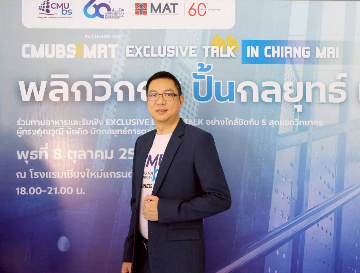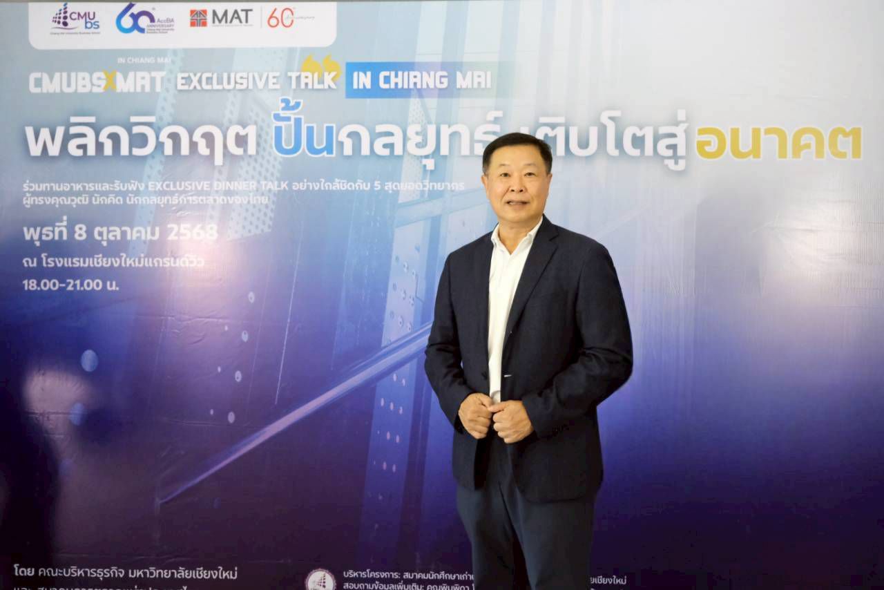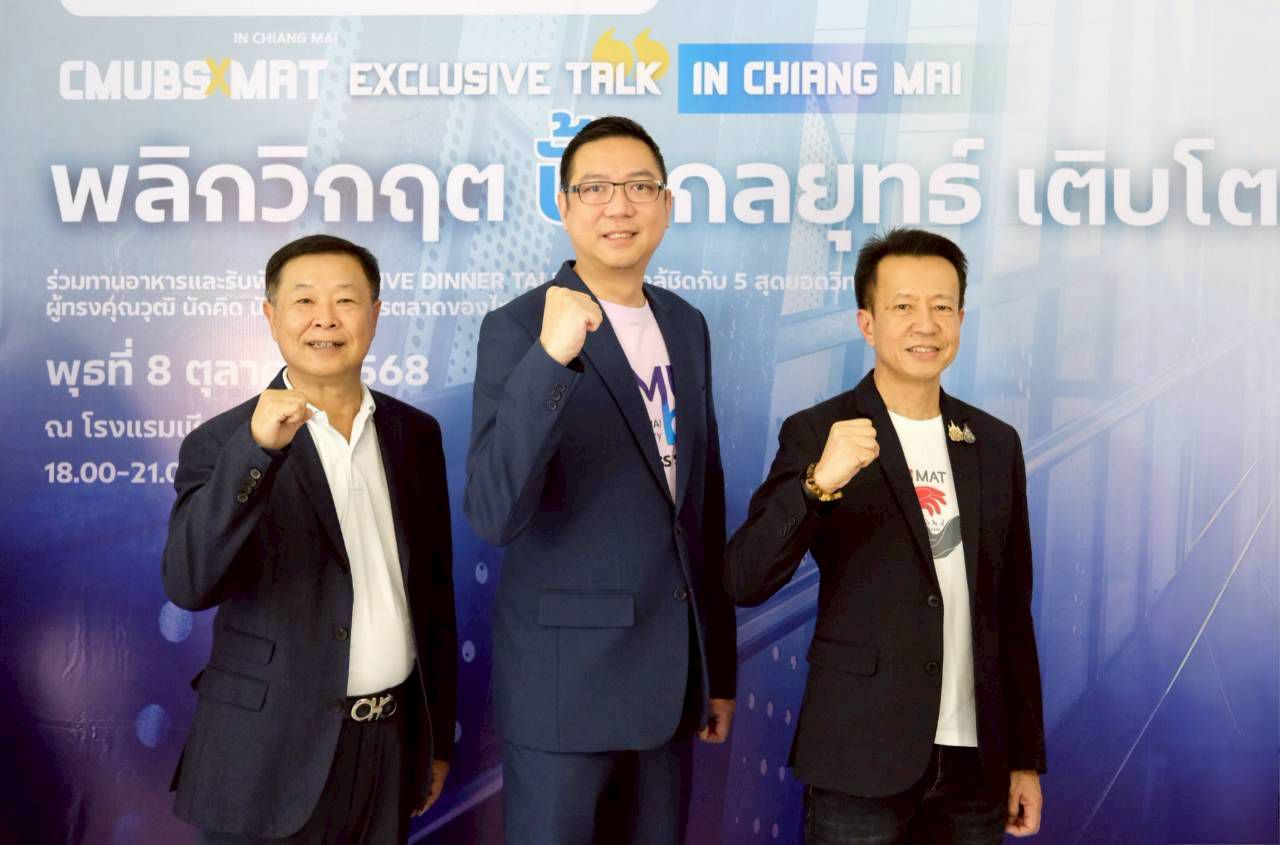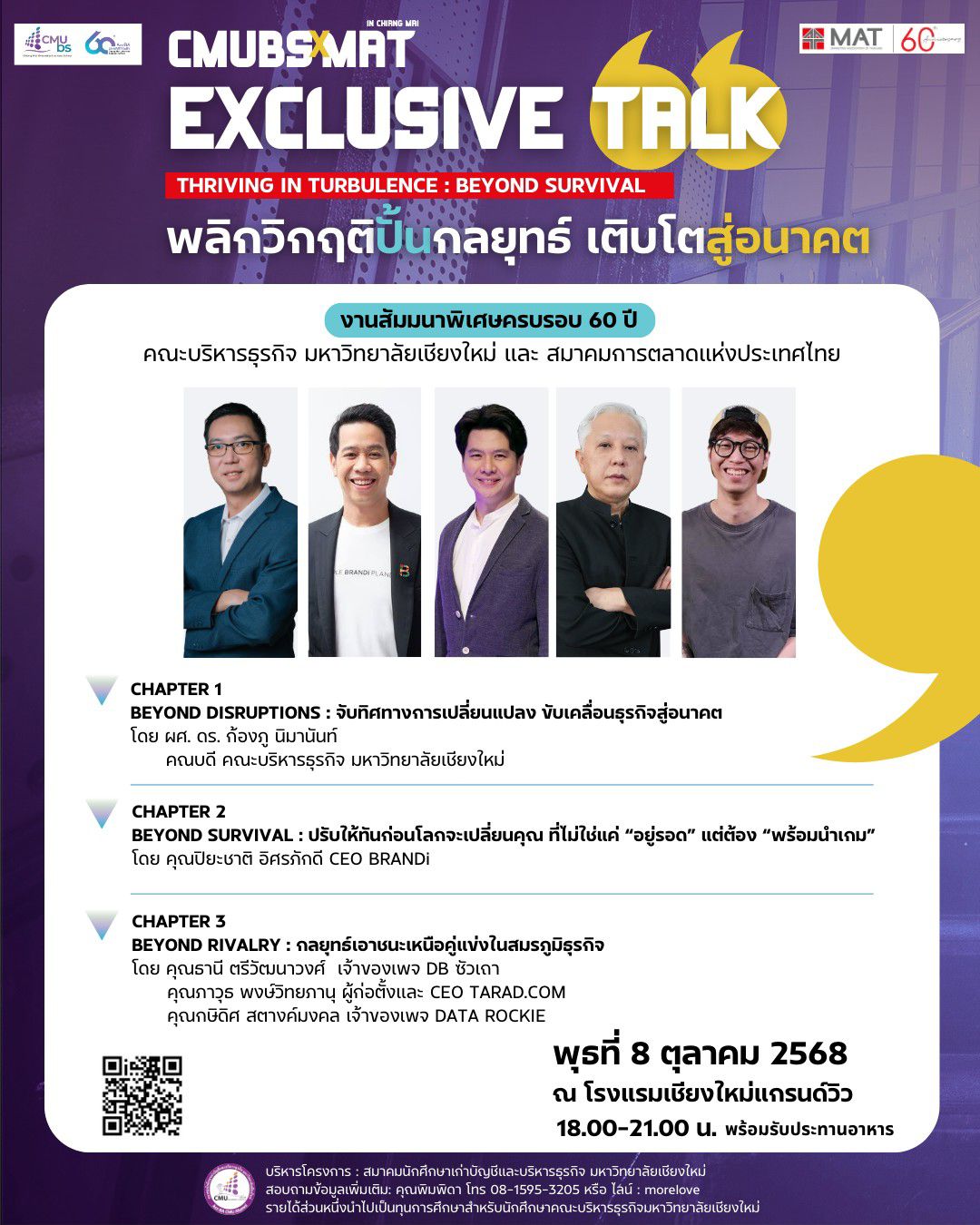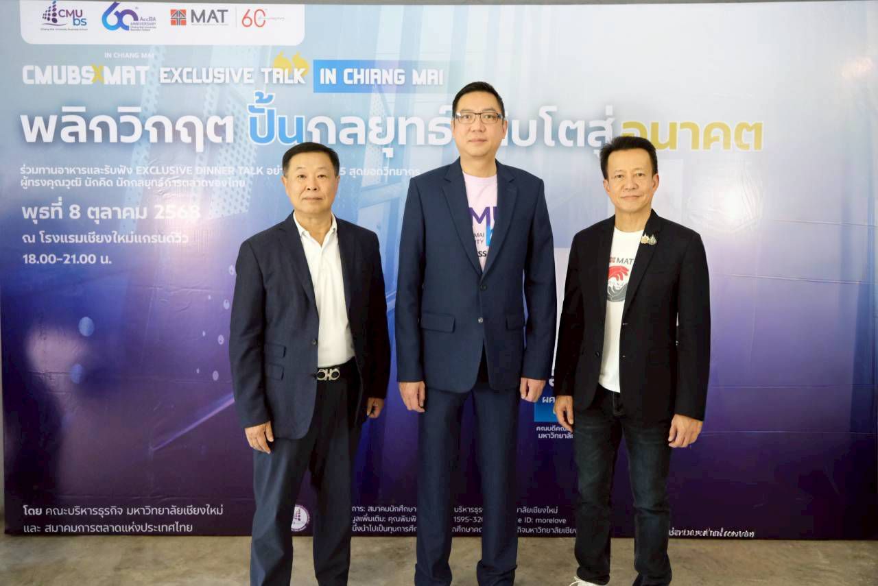 เมื่อวันที่ 3 กันยายน 2568 คณะบริหารธุรกิจ มหาวิทยาลัยเชียงใหม่ (CMUBS) ผนึกกำลังสมาคมนักศึกษาเก่าบัญชีและบริหารธุรกิจ มหาวิทยาลัยเชียงใหม่ ร่วมกับสมาคมการตลาดแห่งประเทศไทย (MAT) ประชาสัมพันธ์การจัดกิจกรรมพิเศษเนื่องในโอกาสครบรอบ 60 ปี ในงาน CMUBS x MAT Exclusive Talk จุดประกายกลยุทธ์ธุรกิจภาคเหนือ ภายใต้แนวคิด “THRIVING IN TURBULENCE – พลิกวิกฤติ ปั้นกลยุทธ์ เติบโตสู่อนาคต” เพื่อเป็นเวทีเสวนาระดับภูมิภาคในการแลกเปลี่ยนองค์ความรู้และแนวคิดใหม่ด้านธุรกิจและการตลาด ท่ามกลางสภาวะเศรษฐกิจที่เต็มไปด้วยความไม่แน่นอน ซึ่งมีกำหนดจัดขึ้นในวันพุธที่ 8 ตุลาคม 2568 เวลา 18.00–21.00 น. ณ ห้องแกรนด์วิว 3 โรงแรมเชียงใหม่แกรนด์วิว จังหวัดเชียงใหม่ ในรูปแบบ Exclusive Dinner Talk โดยรายได้ส่วนหนึ่งสมทบทุนการศึกษาแก่นักศึกษาคณะบริหารธุรกิจ มหาวิทยาลัยเชียงใหม่