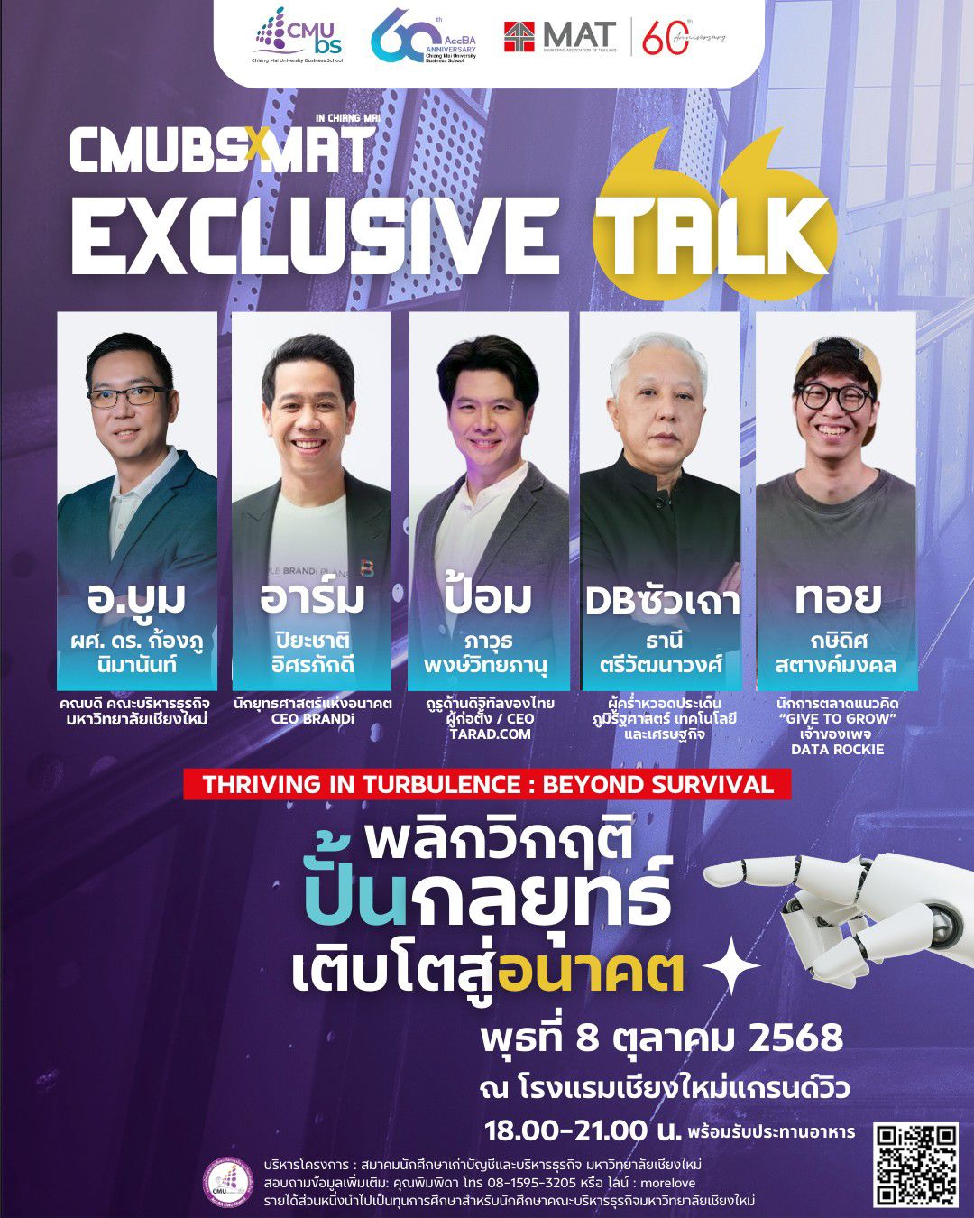 เมื่อวันที่ 3 กันยายน 2568 คณะบริหารธุรกิจ มหาวิทยาลัยเชียงใหม่ (CMUBS) ผนึกกำลังสมาคมนักศึกษาเก่าบัญชีและบริหารธุรกิจ มหาวิทยาลัยเชียงใหม่ ร่วมกับสมาคมการตลาดแห่งประเทศไทย (MAT) ประชาสัมพันธ์การจัดกิจกรรมพิเศษเนื่องในโอกาสครบรอบ 60 ปี ในงาน CMUBS x MAT Exclusive Talk จุดประกายกลยุทธ์ธุรกิจภาคเหนือ ภายใต้แนวคิด “THRIVING IN TURBULENCE – พลิกวิกฤติ ปั้นกลยุทธ์ เติบโตสู่อนาคต” เพื่อเป็นเวทีเสวนาระดับภูมิภาคในการแลกเปลี่ยนองค์ความรู้และแนวคิดใหม่ด้านธุรกิจและการตลาด ท่ามกลางสภาวะเศรษฐกิจที่เต็มไปด้วยความไม่แน่นอน ซึ่งมีกำหนดจัดขึ้นในวันพุธที่ 8 ตุลาคม 2568 เวลา 18.00–21.00 น. ณ ห้องแกรนด์วิว 3 โรงแรมเชียงใหม่แกรนด์วิว จังหวัดเชียงใหม่ ในรูปแบบ Exclusive Dinner Talk โดยรายได้ส่วนหนึ่งสมทบทุนการศึกษาแก่นักศึกษาคณะบริหารธุรกิจ มหาวิทยาลัยเชียงใหม่