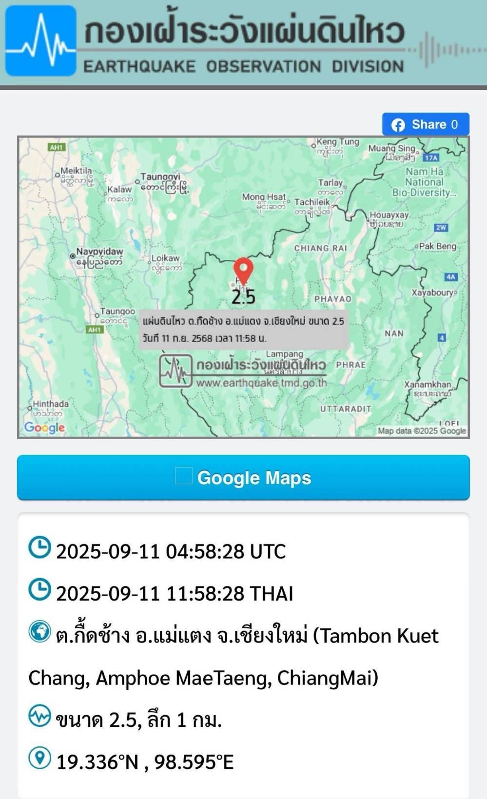เมื่อวันที่ 11 กย. 68 นายอัธยา อรรณพเพ็ชร ผู้อำนวยการโครงการส่งน้ำและบำรุงรักษาแม่แฝก-แม่งัดสมบูรณ์ชล เปิดเผยว่า เมื่อเวลา 11.58 น. เกิดแผ่นดินไหว บริเวณบ้านกี๊ดช้าง อ.แม่แตง จ.เชียงใหม่ วัดขนาดได้ 2.5 ลึก 1 กม. โครงการฯ ได้สั่งการเจ้าหน้าที่เขื่อนแม่งัดฯ ตรวจสอบสภาพเขื่อน อาคาร service spillway ตลอดจนอาคารประกอบต่างๆ