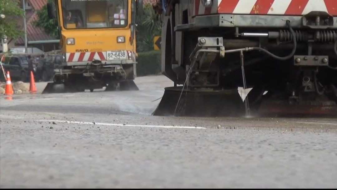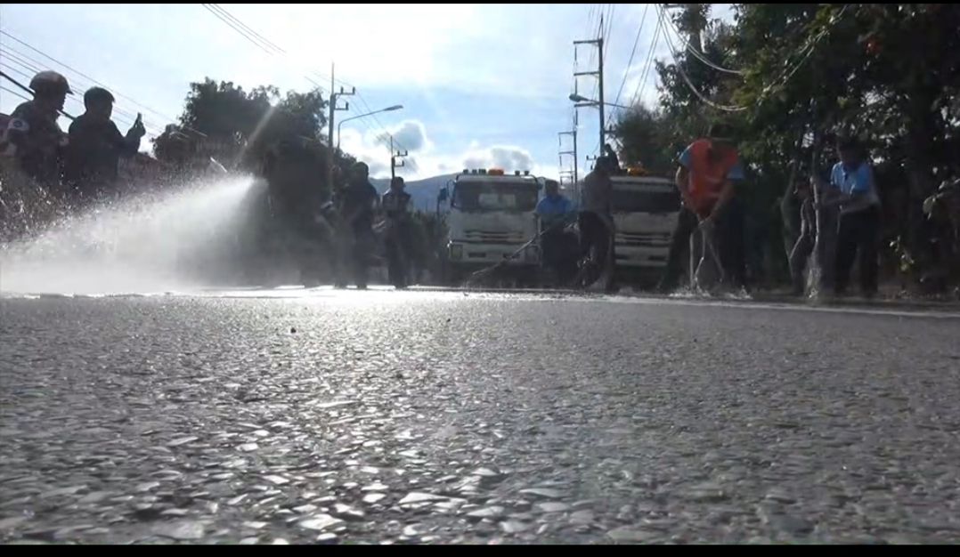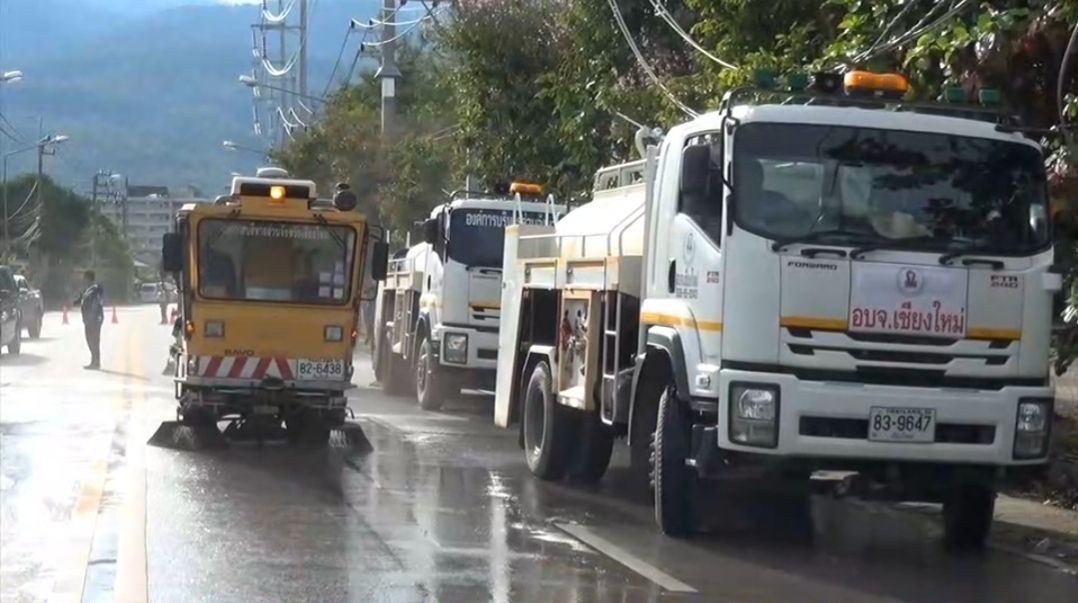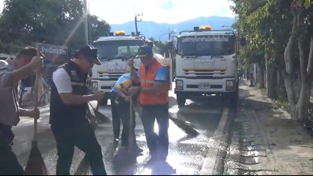 ผู้ว่าฯเชียงใหม่ นำเจ้าหน้าที่และรถน้ำของอบจ.ฯ ล้างทำความสะอาดถนน กองกำลังผาเมือง ในตัวเมืองเชียงใหม่ เพื่อคืนพื้นผิวที่ปลอดภัย ส่วนคนขับรถยนต์กระบะส่งน้ำ ที่ชนเสาไฟฟ้า อาการดีขึ้น มีสติสามารถพูดคุยได้แล้ว