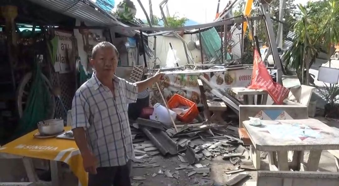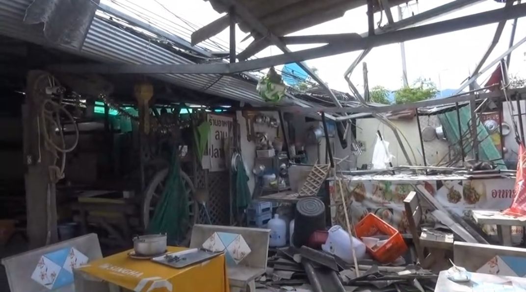 สภาพร้านอาหาร ลาบปลาเพี้ย ย่านถนนกองกำลังผาเมือง – หนองฮ่อ ตำบลช้างเผือก อำเภอเมือง จังหวัดเชียงใหม่ ที่มีเสาไฟฟ้าแรงสูง ถูกรถกระบะส่งน้ำดื่ม พุ่งชนจนหักโค่น และสายไฟฟ้า ยังกระซากเสาไฟฟ้า ล้มเป็นโดมิโน่ และเกิดความเสียหาย รวมกว่า 52 ต้น ซึ่งร้านลาบปลาเพี้ย ของนาย รังสันต์ ปันนวล อายุ 64 ปี หนึ่งในร้านที่ได้รับผลกระทบ ชี้ให้ดูความเสียหายภายในร้าน เชื่อว่าน่าจะได้รับ ความเสียหายมากที่สุด โดยเฉพาะห้องครัว ที่อยู่บริเวณหน้าร้านติดกับถนน ทุกอย่างในครัว ไม่ว่าจะเป็น จาน ชาม ครก หม้อ เตาแก็ส เตาไมโครเวฟ หรืออุปกรณ์ทำครัว ของใช้ต่างๆพังเสียหายหมด รวมทั้งหลังคา ซึ่งจะต้องรื้อ และทำใหม่ทั้งหมด โดยวันนี้จะนำ ภาพถ่ายความเสียหาย ของร้าน ไปแจ้งความ ลงบันทึกประจำวัน ที่สภ.ช้างเผือก เพื่อรวบรวมกับผู้เสียหายรายอื่นๆ ในส่วนของตนเอง ก็ยังกังวลเกี่ยวกับ เรื่องค่าชดเชยความเสียหาย ว่าจะมีการชดเชย หรือช่วยเหลือ กันแบบไหน ซึ่งตนเองก็ไม่ได้ มีเงินมีทอง หากจะทำร้านใหม่ ก็ต้องไปกู้เงินนอกระบบ มาก่อนในการทำร้าน ไม่ทำก็ไม่ได้ ต้องทำมาหากิน และต้องดูแลลูกน้องอีก