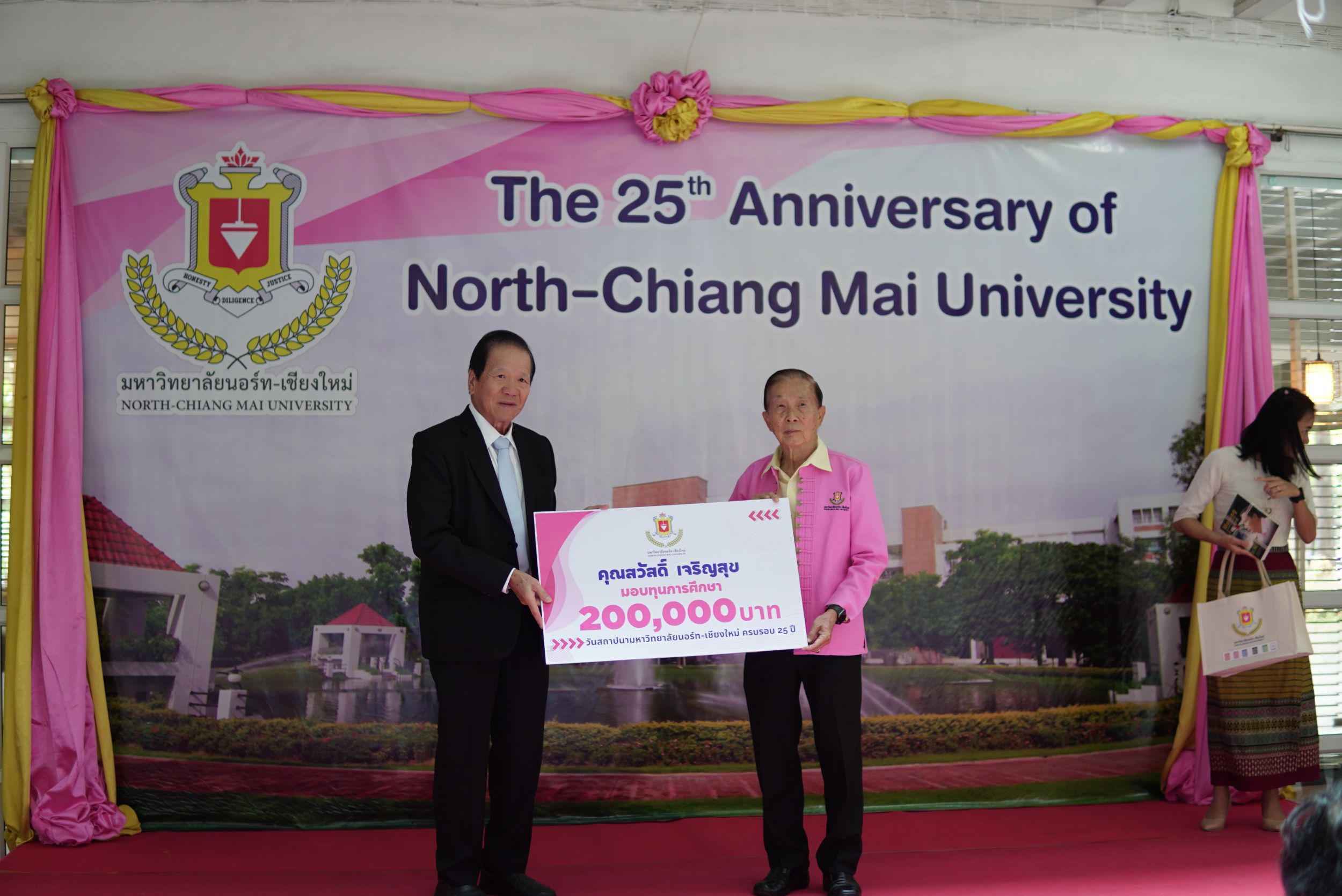 ในโอกาสเดียวกัน มหาวิทยาลัยนอร์ท-เชียงใหม่ ขอขอบคุณ คุณสวัสดิ์ เจริญสุข ดุษฎีบัณฑิตกิตติมศักดิ์ มหาวิทยาลัยนอร์ท-เชียงใหม่ ในฐานะประธานกรรมการบริหารมูลนิธิส่งเสริมปุงเถ่ากง เชียงใหม่ และ บริษัท เชียงใหม่สุขสวัสดิ์ จำกัด ที่ได้มอบทุนการศึกษา จำนวน 200,000 บาท เพื่อสนับสนุนการศึกษา