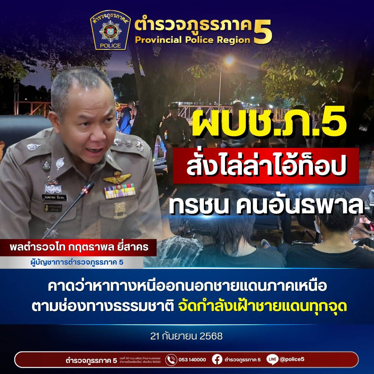 ผบช.ภ.5 สั่งไล่ล่าไอ้ท็อป ทรชน คนอันธพาล คาดว่าหาทางหนีออกนอกชายแดนภาคเหนือ ตามช่องทางธรรมชาติ จัดกำลังเฝ้าชายแดนทุกจุด