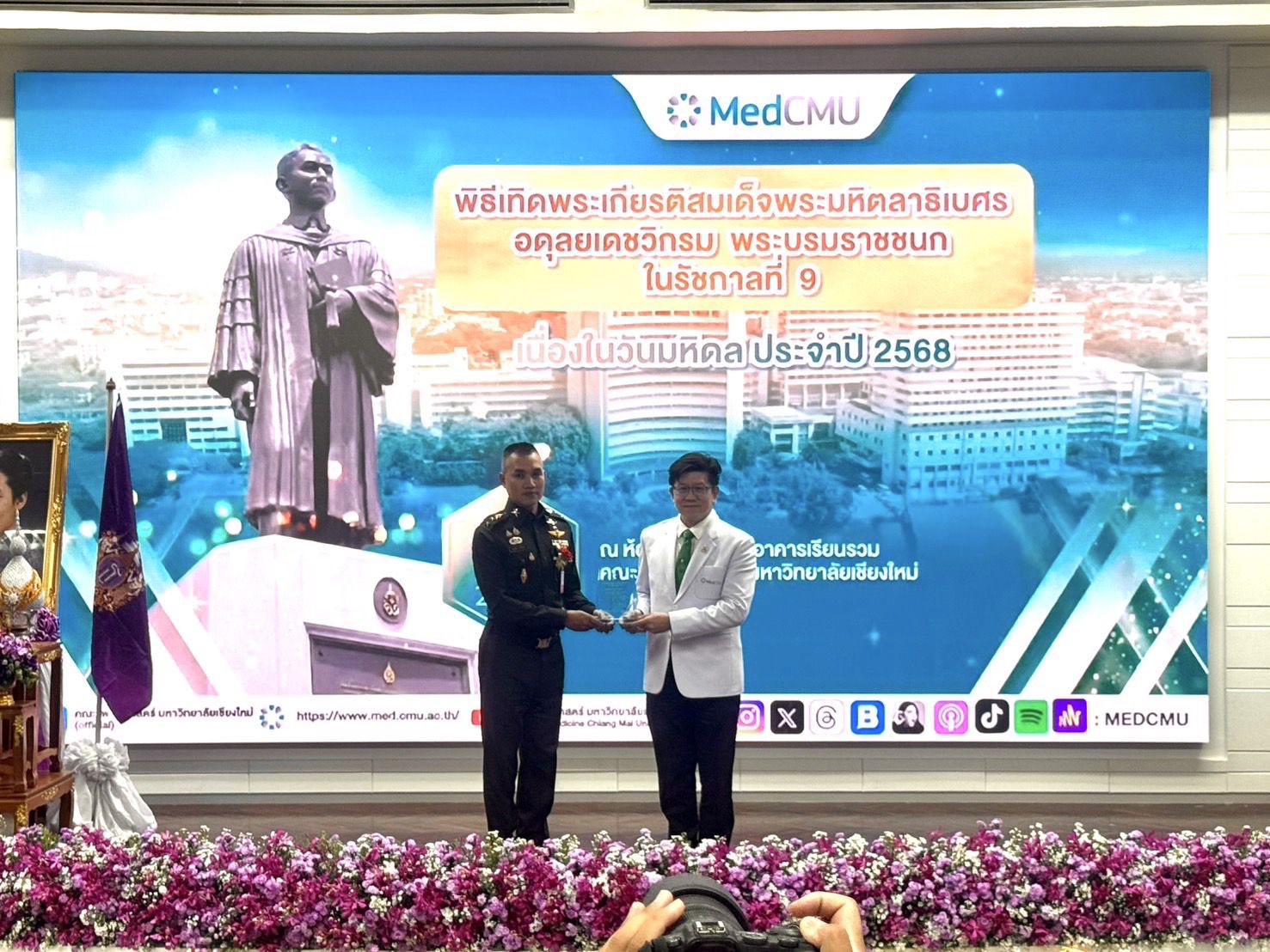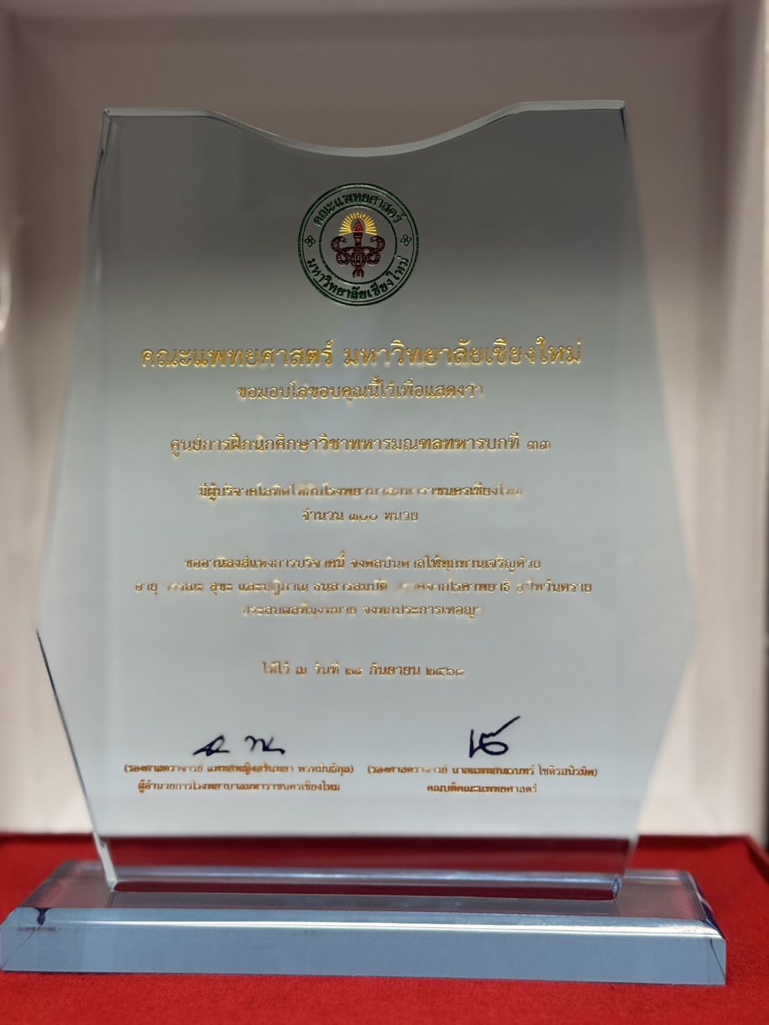 อย่างต่อเนื่อง ตลอดปี 2568 ในพิธีเทิดพระเกียรติสมเด็จพระมหิตลาธิเบศร อดุลยเดชวิกรม พระบรมราชชนก ในรัชกาลที่ 9 เนื่องในวันมหิดล ประจำปี 2568 โดยมี ผบ.ศฝ.นศท.มทบ.33 เข้ารับโล่ขอบคุณฯ ณ ห้องประชุม ชั้น 2 อาคารเรียนรวม คณะแพทยศาสตร์ มหาวิทยาลัยเชียงใหม่ อ.เมือง จ.เชียงใหม่.