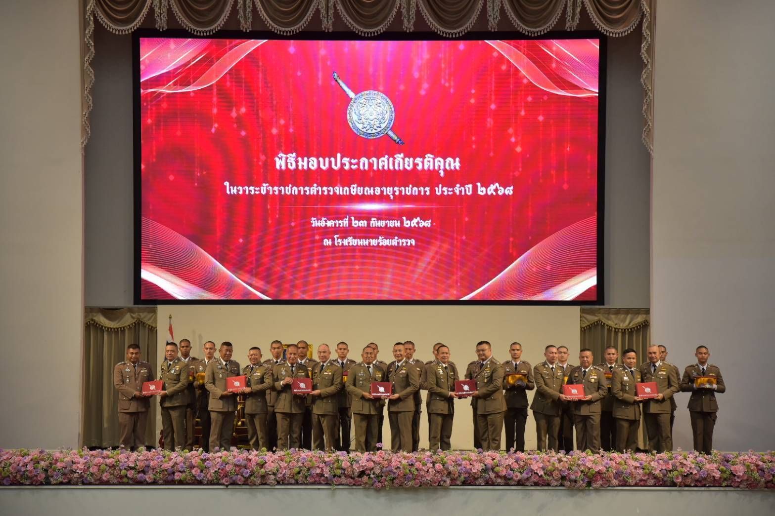 เมื่อวันที่ 23 กันยายน 2568 เวลา 14.30 น. พล.ต.อ.กิตติ์รัฐ พันธุ์เพ็ชร์ ผู้บัญชาการตำรวจแห่งชาติ (ผบ.ตร.) เป็นประธานพิธีมอบประกาศเกียรติคุณให้กับข้าราชการตำรวจที่เกษียณอายุราชการ ประจำปีพุทธศักราช 2568 ระดับพันตำรวจเอกขึ้นไป โดยมีข้าราชการตำรวจที่เกษียณอายุราชการจำนวน 409 นาย และข้าราชการตำรวจที่สมัครใจเข้าร่วมโครงการปรับเปลี่ยนกำลังพล ระดับผู้กำกับการหรือเทียบเท่าขึ้นไป จำนวน 38 นาย อาทิ พล.ต.อ.ประจวบ วงศ์สุข รอง ผบ.ตร., พล.ต.อ.ธนายุตม์ วุฒิจรัสธำรงค์ ที่ปรึกษาพิเศษ ตร., พล.ต.อ.อัคราเดช พิมลศรี ที่ปรึกษาพิเศษ ตร. โดยมี พล.ต.อ.กรไชย คล้ายคลึง รอง ผบ.ตร. พร้อมผู้ช่วย ผบตร. และข้าราชการตำรวจที่เกี่ยวข้อง ร่วมพิธี ณ หอประชุมเตมียเวส โรงเรียนนายร้อยตำรวจ อ.สามพราน จ.นครปฐม