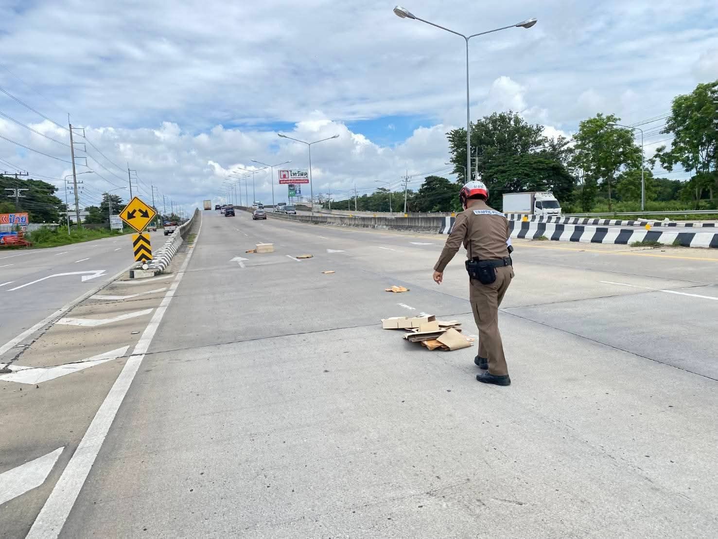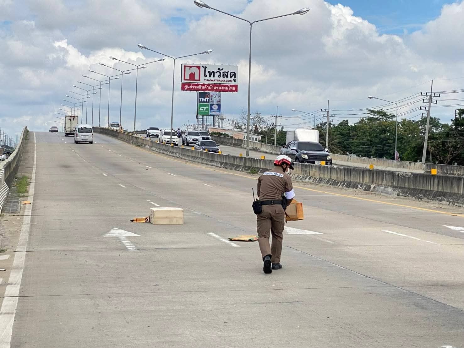 เมื่อมาถึงบริเวณขาเข้าเมือง ก่อนขึ้นทางต่างระดับสารภี (หน้าไทวัสดุ) พบเศษวัสดุเป็นกล่องกระดาษตกอยู่บนพื้นผิวจราจร ซึ่งอาจก่อให้เกิดอันตรายและอุบัติเหตุต่อผู้ใช้รถใช้ถนนได้ จึงได้เร่งดำเนินการเก็บออกจากพื้นผิวการจราจรทันที เพื่อคืนสภาพถนนให้ปลอดภัยและอำนวยความสะดวกแก่ประชาชนผู้สัญจร