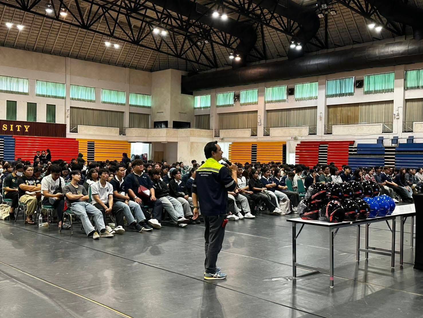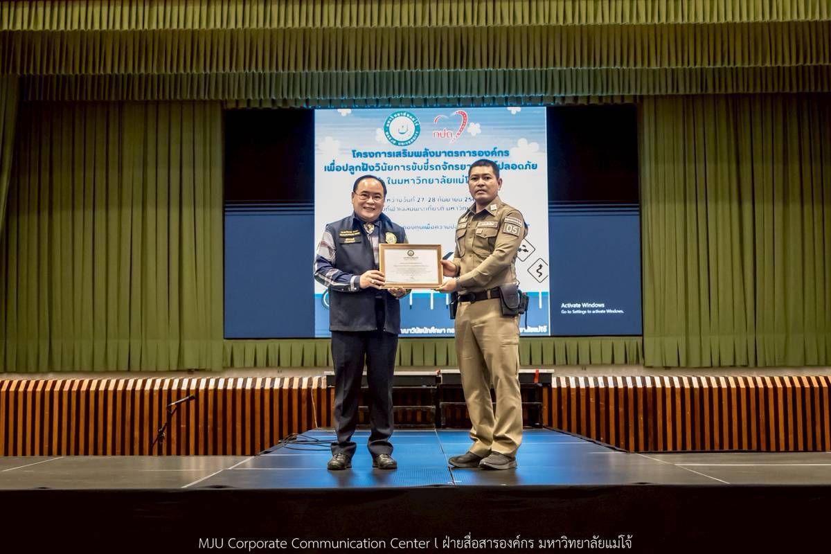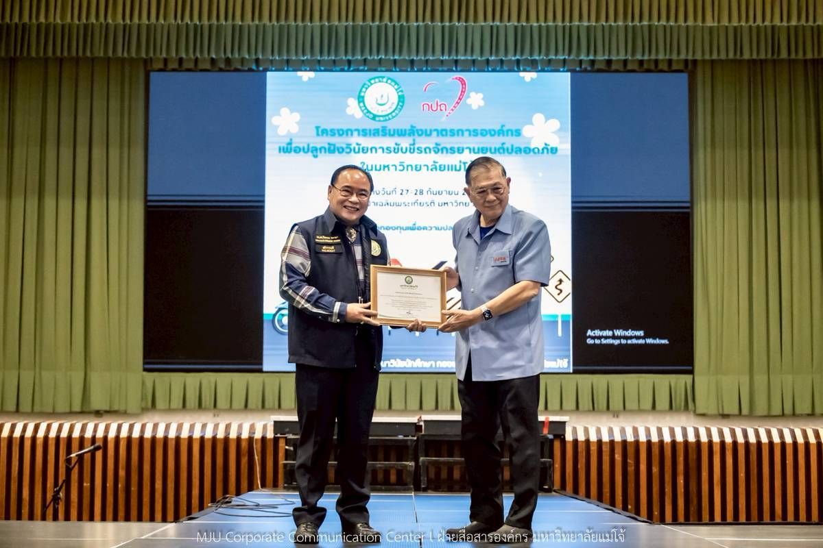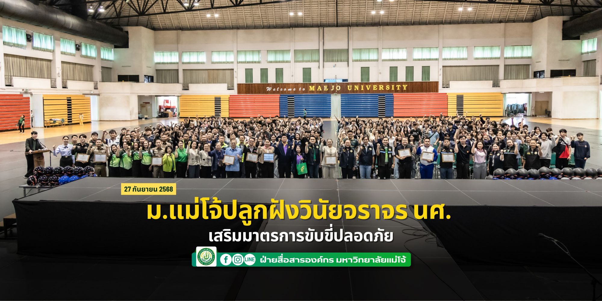 วันที่ 27-28 กันยายน 2568 กองพัฒนานักศึกษา และกองกายภาพและสิ่งแวดล้อม มหาวิทยาลัยแม่โจ้ ร่วมกับ สำนักงานขนส่งจังหวัดเชียงใหม่ จัดโครงการเสริมพลังมาตรการองค์กรเพื่อปลูกฝังวินัยการขับขี่รถจักรยานยนต์ปลอดภัยในมหาวิทยาลัยแม่โจ้ โดยได้รับเกียรติจาก รองศาสตราจารย์ ดร.วีระพล ทองมา อธิการบดีมหาวิทยาลัยแม่โจ้ เป็นประธานเปิดโครงการ และมี ผู้ช่วยศาสตราจารย์ ดร.ประภากร ธาราฉาย รองอธิการบดี กล่าวรายงาน โดยมีนักศึกษาสนใจเข้าร่วมโครงการจำนวน 2 รุ่น ๆ ละ 500 คน ณ ศูนย์กีฬาเฉลิมพระเกียรติ มหาวิทยาลัยแม่โจ้