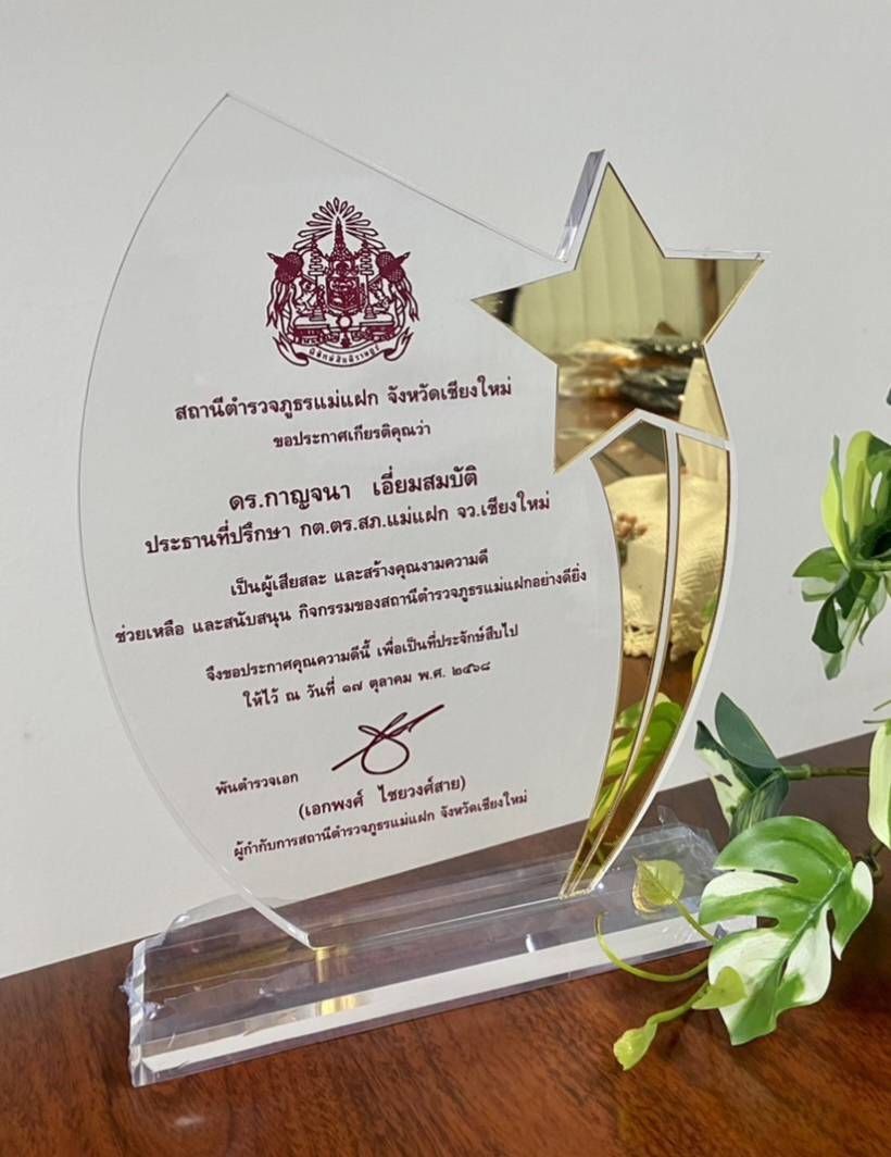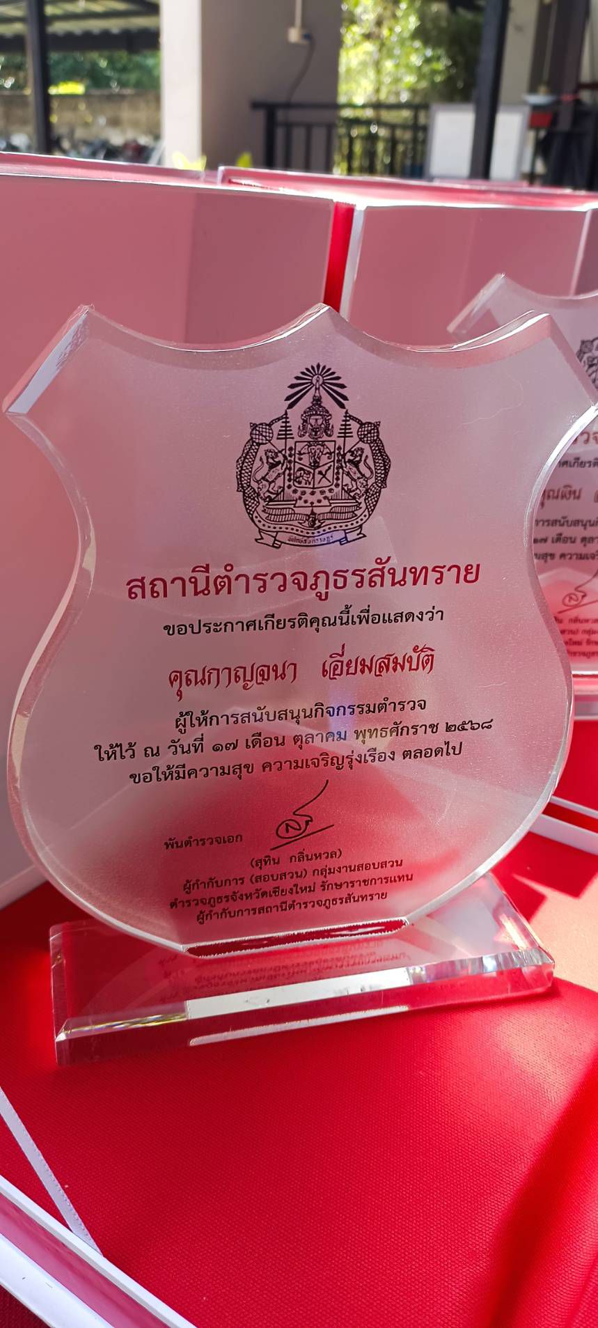 ดร.กาญจนา เอี่ยมสมบัติ ที่ได้รับโล่และเกียรติบัตรถึง 4 สภ.ที่ได้มอบให้ประกอบไปด้วยสภ.สันทราย สภ.แม่แฝก สภ.ดอยสะเก็ด และสภ.แม่แตง ที่ได้จัดมอบมอบโล่ให้กับดร.กาญจนา ในฐานะผู้ให้การสนับสนุนแต่ละสภ.มาด้วยดีตลอด เห็นสมควรที่ได้รับโล่ในวันตำรวจ ก็ขอชื่นชมและน่ายกย่องกับสตรีคนนี้ที่ให้ความสำคัญตำรวจแต่ละสภ.มาด้วยดี จนเป็นที่รู้จักของตำรวจหลายสภ.