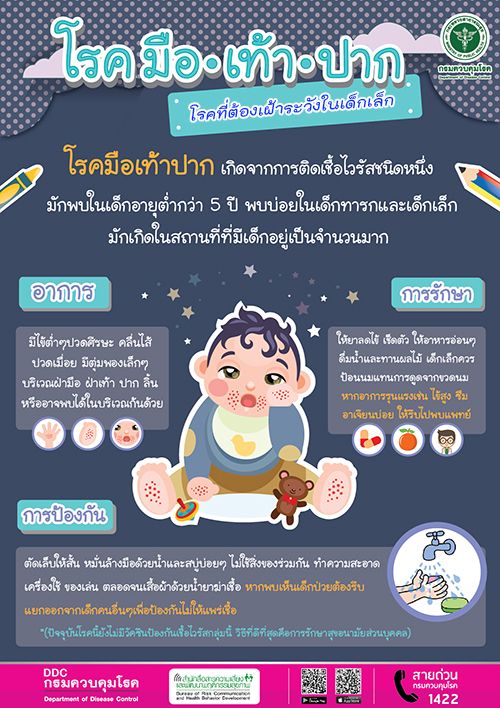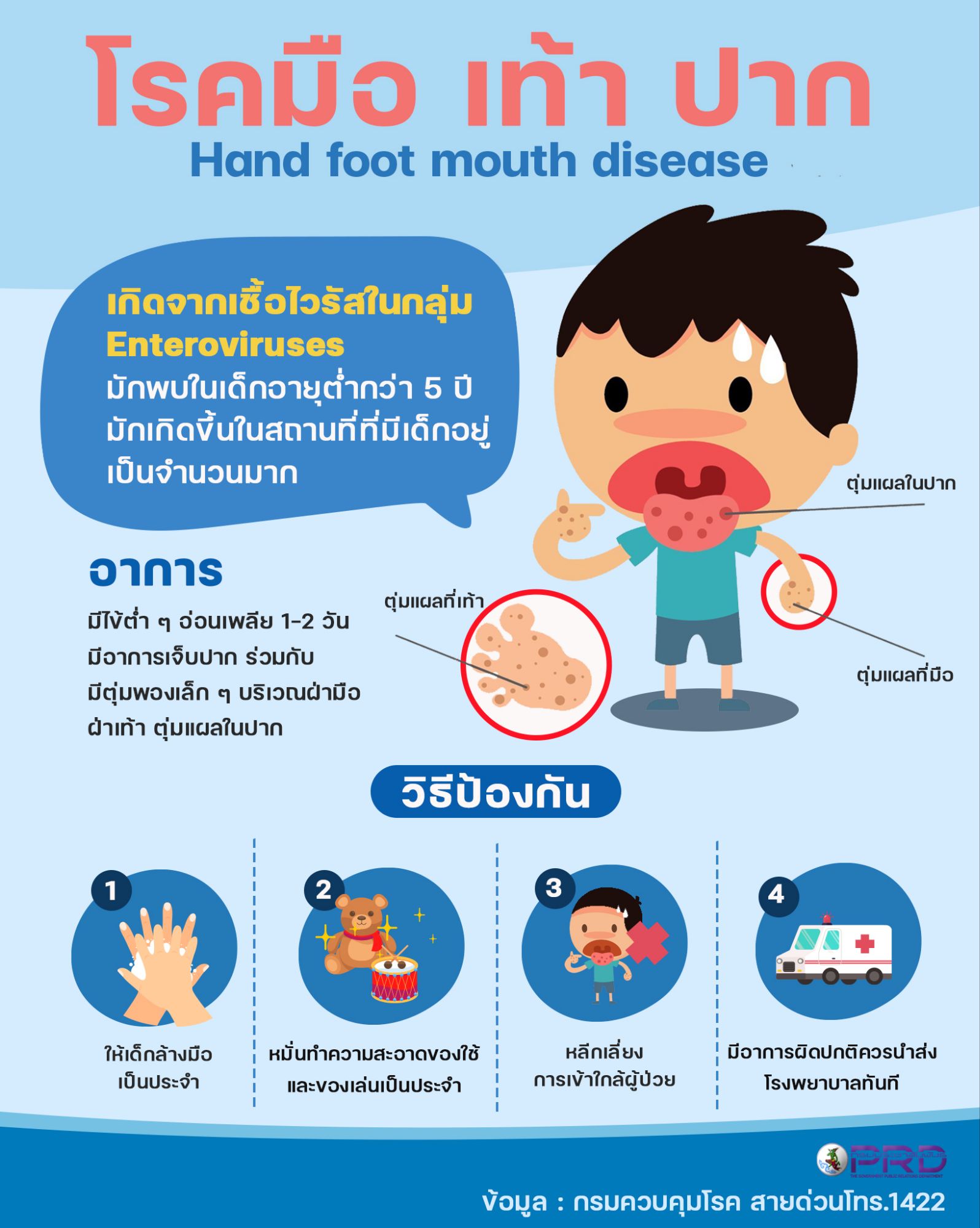 จากข้อมูลของกรมควบคุมโรค กระทรวงสาธารณสุข เตือน พบแนวโน้มของโรคมือ เท้า ปาก ในเด็ก และโรคไข้หวัดใหญ่สูงขึ้น ซึ่งเป็นหนึ่งในโรคที่พบการระบาดเพิ่มขึ้นในช่วงฤดูฝนของทุกปี ทั้งสองโรคนี้เป็นโรคติดต่อที่พบได้บ่อยในเด็ก บางครั้งอาจก่อให้เกิดภาวะแทรกซ้อนตามมาได้ หากเด็กไม่สบาย หรือมีไข้ ผู้ปกครองควรพาไปพบแพทย์ และให้พักอยู่ที่บ้าน โดยโรคมือ เท้า ปาก พบได้ตลอดทั้งปี