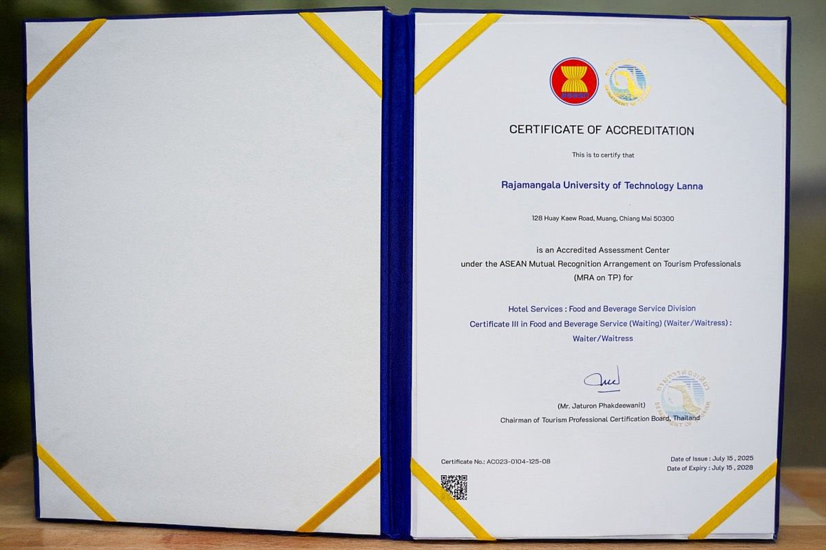 ในการนี้ กรมการท่องเที่ยว ได้ประเมินผลการพิจารณาให้การรับรองของคณะกรรมการรับรองบุคลากรด้านการท่องเที่ยว (Tourism Professional Certification Board:TPCB) โดยรับรองให้มหาวิทยาลัยเทคโนโลยีราชมงคลล้านนา เป็นหน่วยประเมินบุคลากรด้านการท่องเที่ยว ในสาขาที่พัก (Hotel Services) แผนกบริการอาหารและเครื่องดื่ม (Food and Beverage Service: FB) ตำแหน่งงาน พนักงานบริกร (Waiter/Waitress)