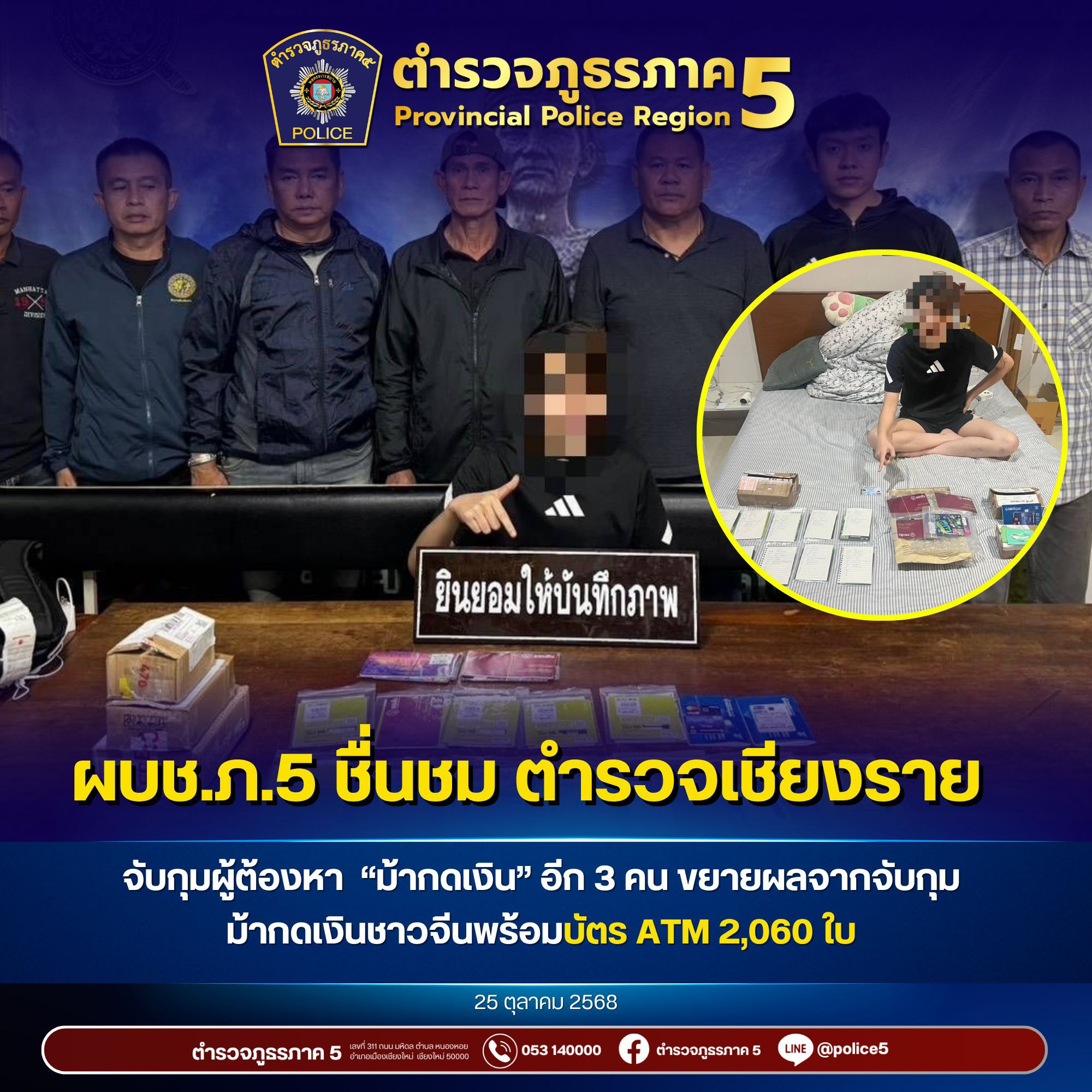 ผบช.ภ.5 ชื่นชม ตำรวจเชียงราย จับกุมผู้ต้องหา “ม้ากดเงิน” เพิ่มอีก 3 คน ขยายผลจากจับกุมม้ากดเงินชาวจีนพร้อมบัตร ATM 2,060 ใบ