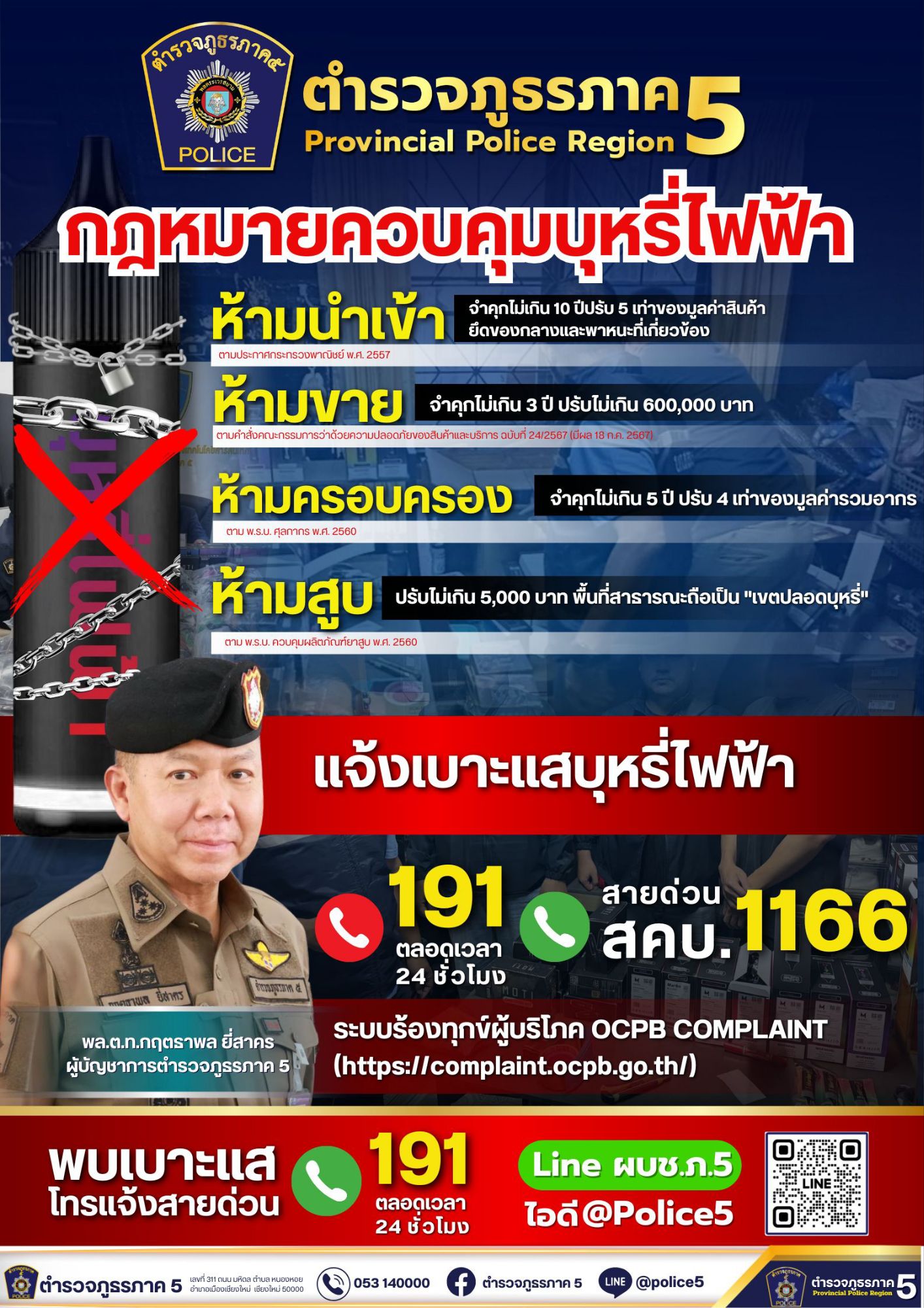 เมื่อวันที่ 26 ตุลาคม 2568 พล.ต.ท.กฤตธาพล ยี่สาคร ผบช.ภ.5 /ประธานสหกรณ์ออมทรัพย์ตำรวจภาค 5 จำกัด ได้อนุญาตให้ตำรวจภูธรภาค 5 ร่วมกับมูลนิธิรณรงค์เพื่อการไม่สูบบุหรี่ จัดกิจกรรมรณรงค์ไม่เอาบุหรี่ และบุหรี่ไฟฟ้า ในการประชุมใหญ่สามัญประจำปี 2568 ของสหกรณ์ออมทรัพย์ตำรวจภาค 5 จำกัด ซึ่งมีสมาชิกตอบรับเข้าร่วมประชุมจำนวน 1,993 คน จาก จำนวนสมาชิกสามัญทั้งหมด 4,717 คน โดยสมาชิกที่เข้าร่วมกิจกรรมรณรงค์ดังกล่าว ได้รับทราบถึงข้อกฎหมายเกี่ยวกับบุหรี่ไฟฟ้าและพิษภัยของบุหรี่และบุหรี่ไฟฟ้า ทั้งนี้ตำรวจภูธรภาค 5 ได้ร่วมมือกับโรงพยาบาลดารารัศมี ซึ่งเป็นโรงพยาบาลในสังกัด โรงพยาบาลตำรวจ สำนักงานตำรวจแห่งชาติ จัดตั้ง”คลีนิคเลิกบุหรี่” สำหรับผู้ที่ติดบุหรี่และต้องการเลิกสูบบุหรี่ ซึ่งเปิดให้บริการสำหรับข้าราชการตำรวจและประชาชนโดยทั่วไปเข้าใช้บริการ
