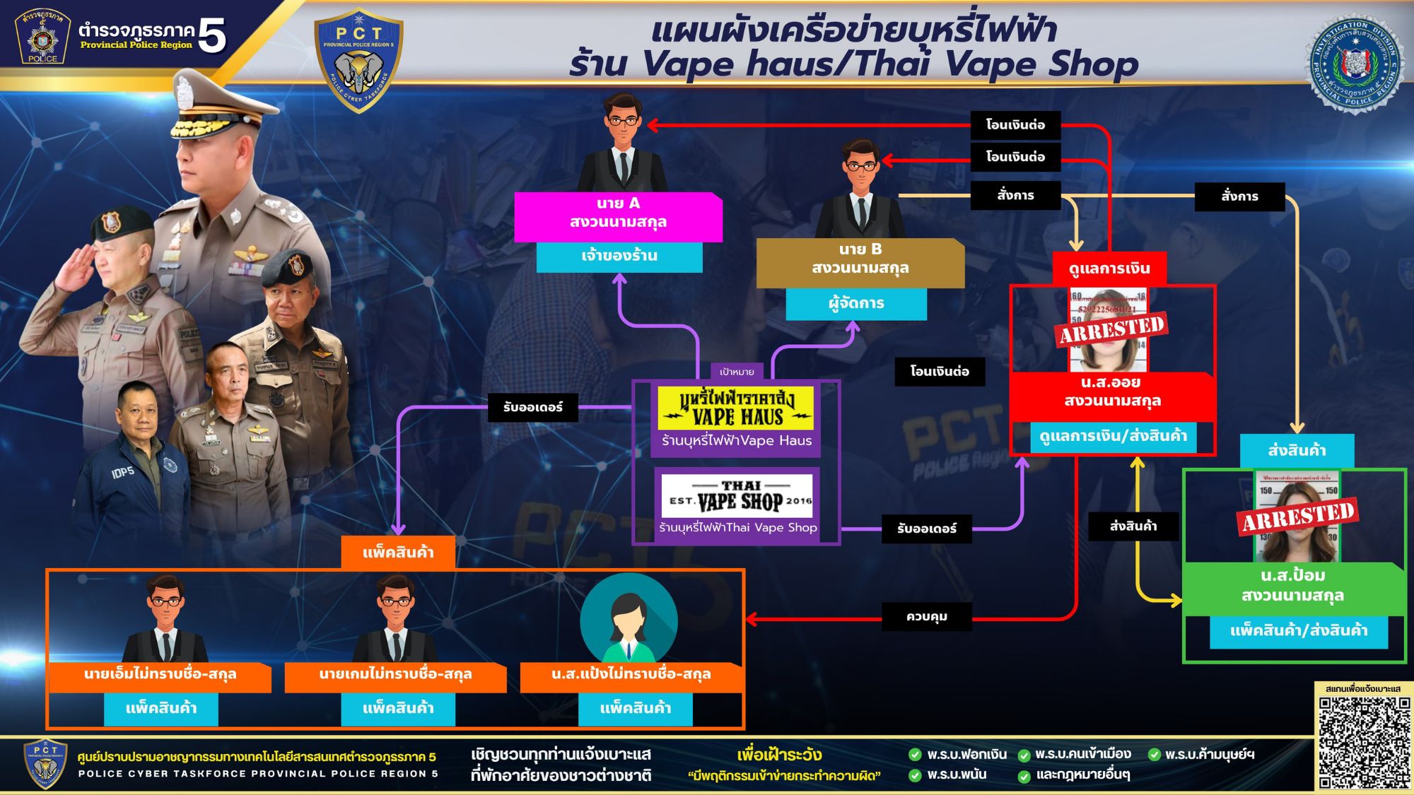 ตำรวจภูธรภาค 5 โดย ศปอส.ภ.5 และ บก.สส.ภ.5 เปิดปฏิบัติการกวาดล้างอาชญากรรมทางเทคโนโลยี ตามนโยบายรัฐบาลและสำนักงานตำรวจแห่งชาติ เข้าตรวจค้น 3 จุด กลางเมืองเชียงใหม่ ทลายแหล่งจำหน่ายบุหรี่ไฟฟ้าออนไลน์เครือข่าย “VAPEHAUS” จับกุมผู้ต้องหา 2 ราย พร้อมยึดของกลางบุหรี่ไฟฟ้าจำนวนมหาศาล มูลค่ากว่า 6.6 ล้านบาท เตรียมขยายผลล่าตัวนายทุนใหญ่