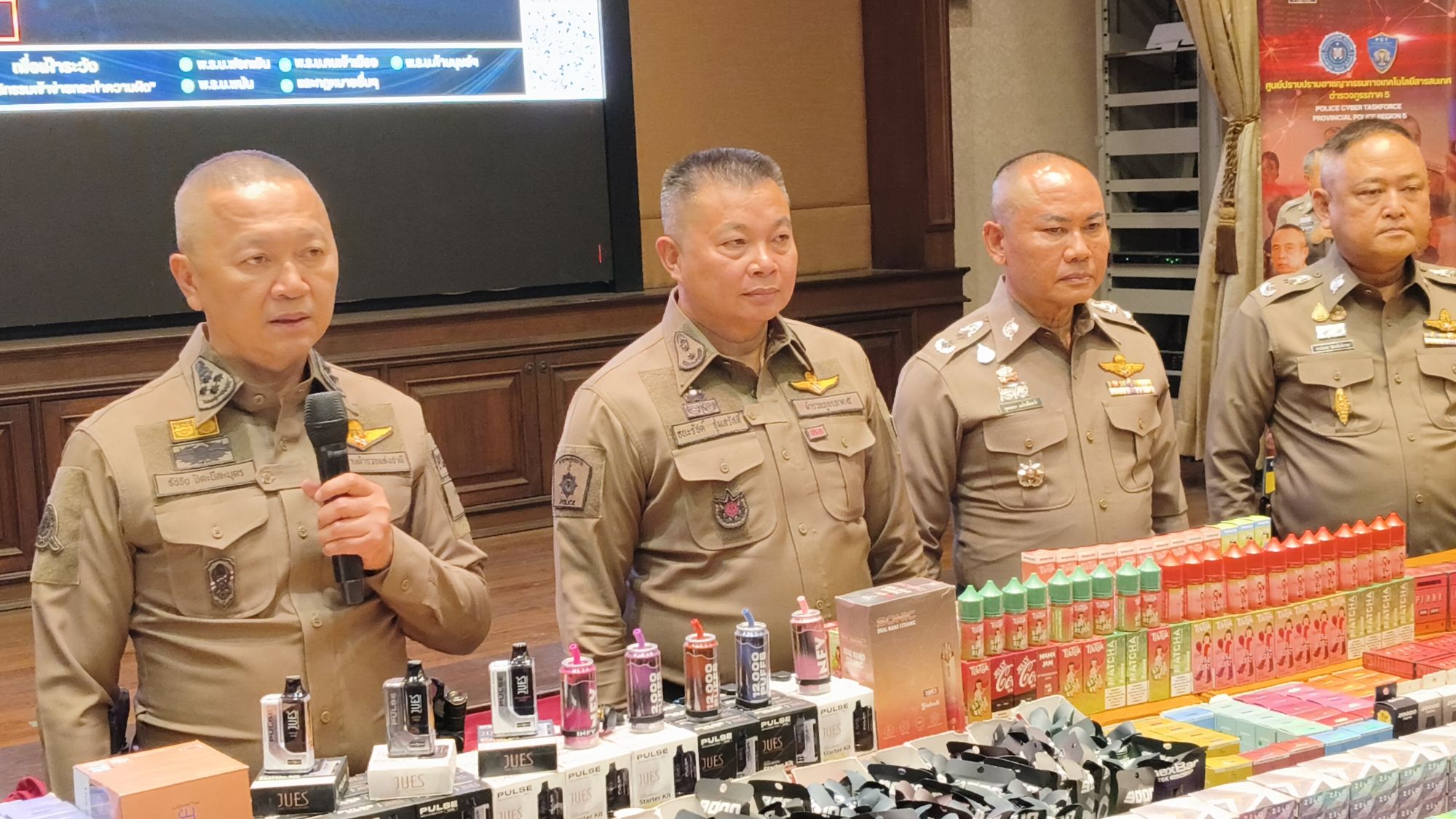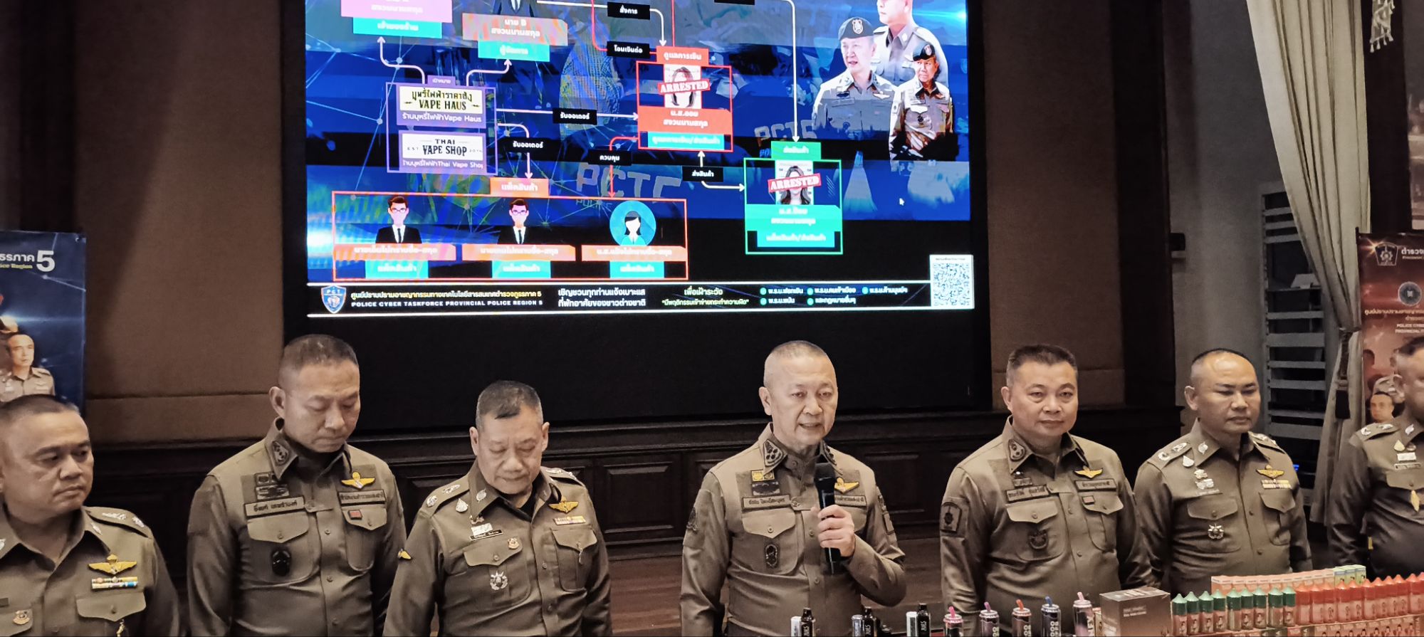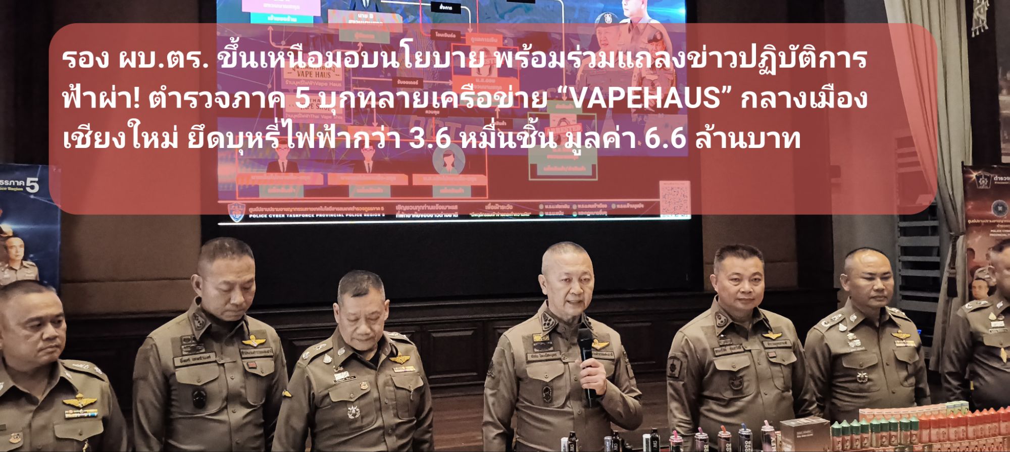 รอง ผบ.ตร. ขึ้นเหนือมอบนโยบาย พร้อมร่วมแถลงข่าวตำรวจภาค 5 บุกทลายเครือข่าย “VAPEHAUS” กลางเมืองเชียงใหม่ ยึดบุหรี่ไฟฟ้ากว่า 3.6 หมื่นชิ้น มูลค่า 6.6 ล้านบาท