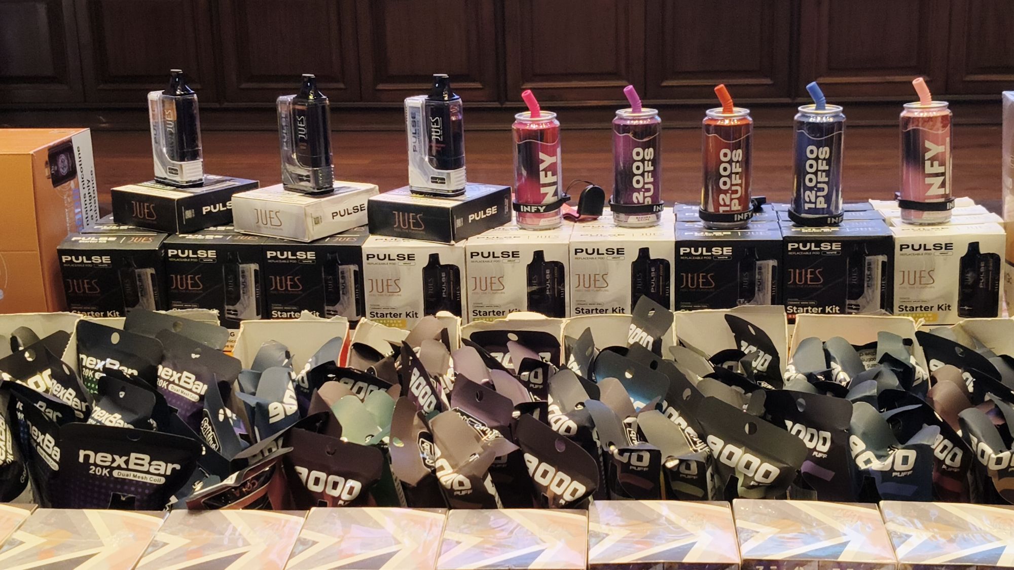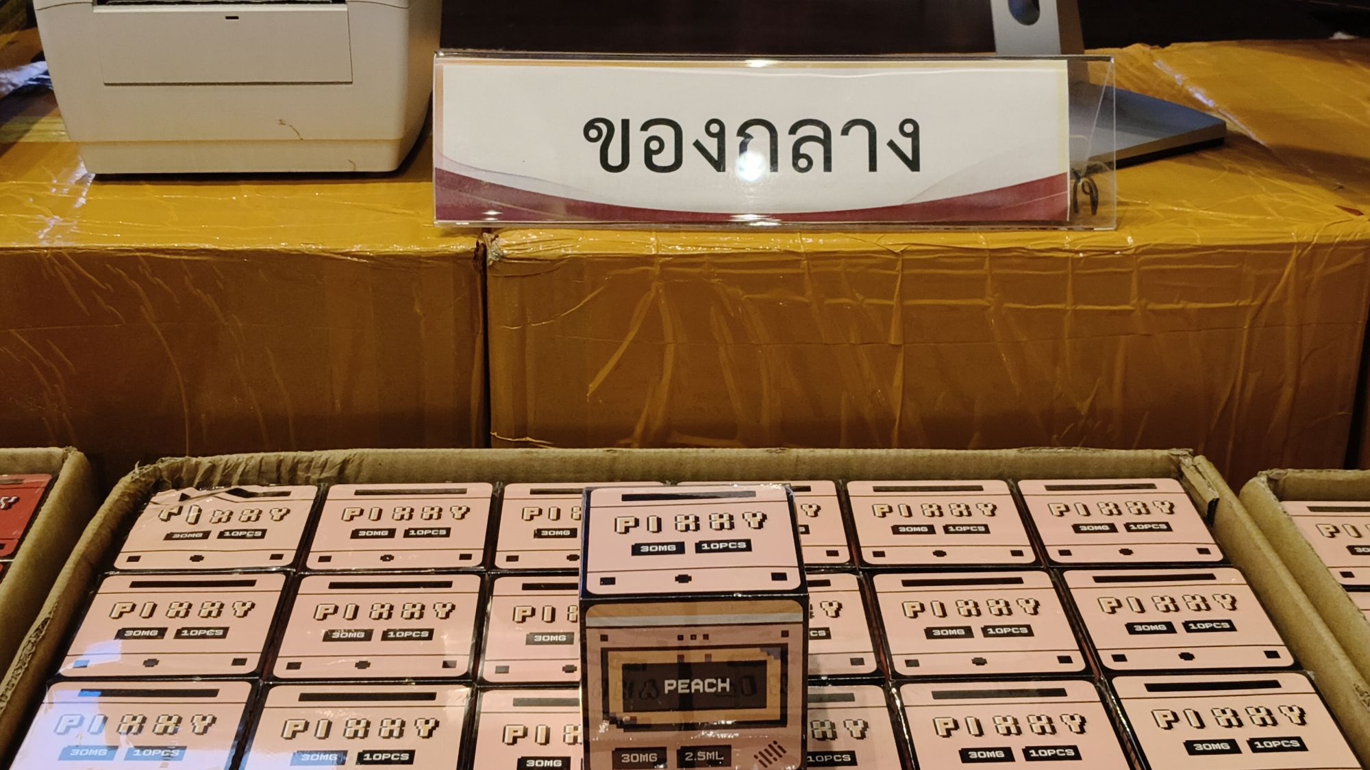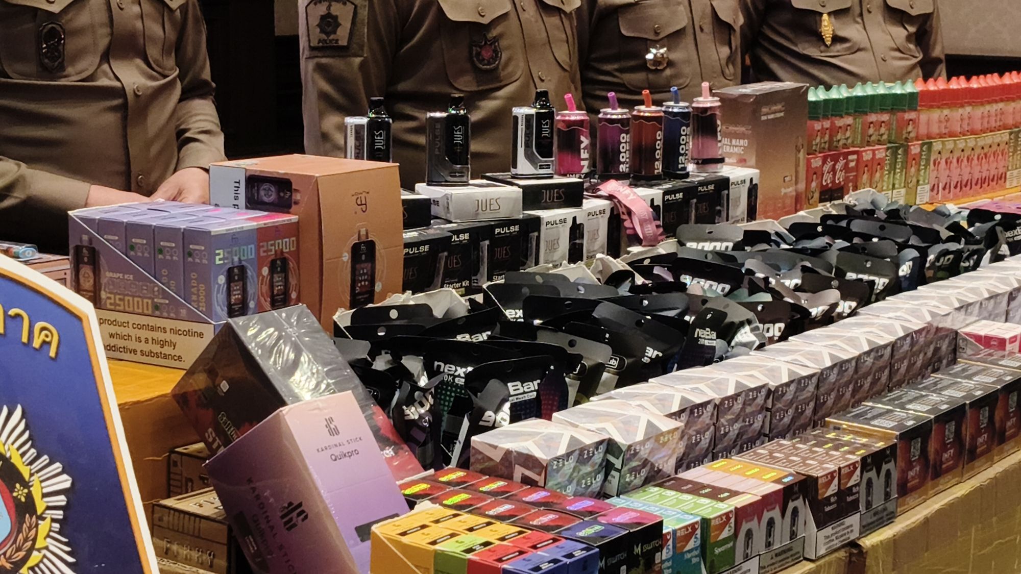 รวมของกลางบุหรี่ไฟฟ้าชนิดต่างๆ จำนวน 36,555 ชิ้น มูลค่ารวมกว่า 6,690,000 บาท นอกจากนี้ ยังยึดคอมพิวเตอร์ โทรศัพท์มือถือ กล่องบรรจุภัณฑ์กว่า 2,000 กล่อง และเร้าเตอร์ไวไฟ