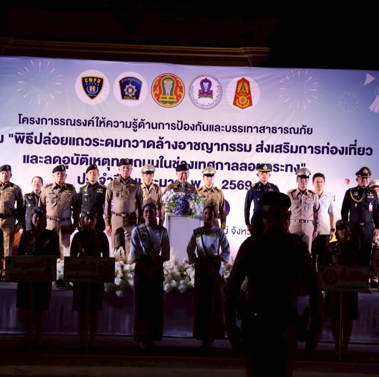 วันนี้ 28 ต.ค.68 ตั้งแต่เวลา 17.30 น. เป็นต้นไป ภ.จว.เชียงใหม่ ได้จัดพิธีปล่อยแถวระดมกวาดล้างอาชญากรรม ส่งเสริมการท่องเที่ยวและลดอุบัติเหตุทางถนนในช่วงเทศกาลลอยกระทง พ.ศ. 2568 มีจุดมุ่งหมาย เพื่อประชาสัมพันธ์ให้ประชาชนและนักท่องเที่ยว มีความระมัดระวังในเรื่องการป้องกันเหตุอาชญากรรม การขับขี่อย่างปลอดภัยให้กับผู้ขับขี่ยานพาหนะทั้งรถยนต์ และรถจักรยานยนต์ เพื่อลดอุบัติเหตุทางจราจร ในช่วงเทศกาลลอยกระทง พร้อมเน้นย้ำให้เจ้าหน้าที่ทุกภาคส่วน คอยดูแลความปลอดภัยในชีวิตและทรัพย์สิน ของประชาชนและนักท่องเที่ยวที่เดินทางเข้ามาท่องเที่ยวเทศกาลลอยกระทง ในจังหวัดเชียงใหม่อย่างทั่วถึง โดยมี พล.ต.อ.ธัชชัย ปิตะนีละบุตร รอง ผบ.ตร. เป็นประธานในพิธี พร้อมด้วย พล.ต.ท.ยิ่งยศ เทพจํานงค์ ผู้ช่วย ผบ.ตร., นายศิวะ ธมิกานนท์ รองผู้ว่าราชการจังหวัดเชียงใหม่, พล.ต.ต.ธนะรัชต์ ชุ่มสวัสดิ์ รอง ผบช.ภ.5, พล.ต.ต.ธวัชชัย พงษ์วิวัฒนชัย รอง ผบช.ภ.5, พล.ต.ต.สุทธิพงศ์ เป๊กทอง รอง ผบช.ภ.5, พล.ต.ต.ยุทธนา แก่นจันทร์ ผบก.ภ.จว.เชียงใหม่, ผู้แทน มทบ.33, นายสมชาติ วัฒนากล้า รองนายก อบจ.เชียงใหม่, นายอัศนี บูรณุปกรณ์ นายกเทศมนตรีนครเชียงใหม่ และผู้แทนหน่วยงานภาคีเครือข่าย ร่วมเป็นเกียรติในพิธี