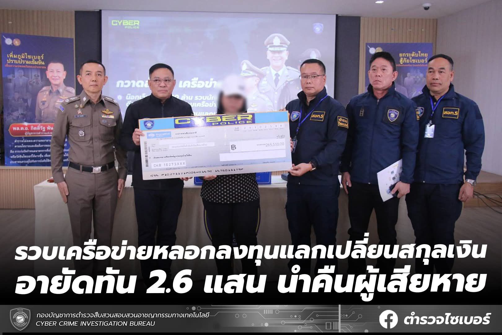 ตร.ไซเบอร์รวบเครือข่ายหลอกลงทุนแลกเปลี่ยนสกุลเงิน อายัดทัน 2.6 แสน นำคืนผู้เสียหาย