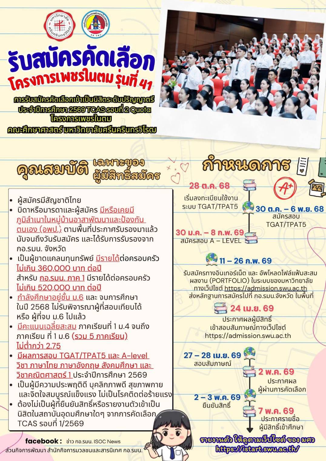 ปัจจุบัน กองอำนวยการรักษาความมั่นคงภายในภาค 3 ได้ประกาศเปิดรับสมัครบุคคล เพื่อคัดเลือกเข้าเป็นนิสิตระดับปริญญาตรี ประจำปีการศึกษา 2569 TCAS รอบที่ 2 Quota โครงการเพชรในตม คณะศึกษาศาสาตร์ มหาวิทยาลัยศรีนครินทรวิโรฒ รุ่นที่ 41 เพื่อเข้าศึกษาต่อสาขาวิชาเอกการประถมศึกษาหลักสูตรการศึกษาบัณฑิต ในพื้นที่ 17 จังหวัดภาคเหนือ จำนวน 34 คน (จังหวัดละ 2 คน) ระหว่างวันที่ 11 – 26 กุมภาพันธ์ 2569 จากผู้สมัครที่มีภูมิลำเนาอยู่ในหมู่บ้านอาสาพัฒนาและป้องกันตนเอง (อพป.) ทั้ง 17 จังหวัดภาคเหนือ ดูรายละเอียดเพิ่มเติมที่ www.swu.ac.th หรือสามารถสอบถามเพิ่มเติมได้ที่กองอำนวยการรักษา ความมั่นคงภายในจังหวัดทุกแห่งใกล้บ้านท่าน