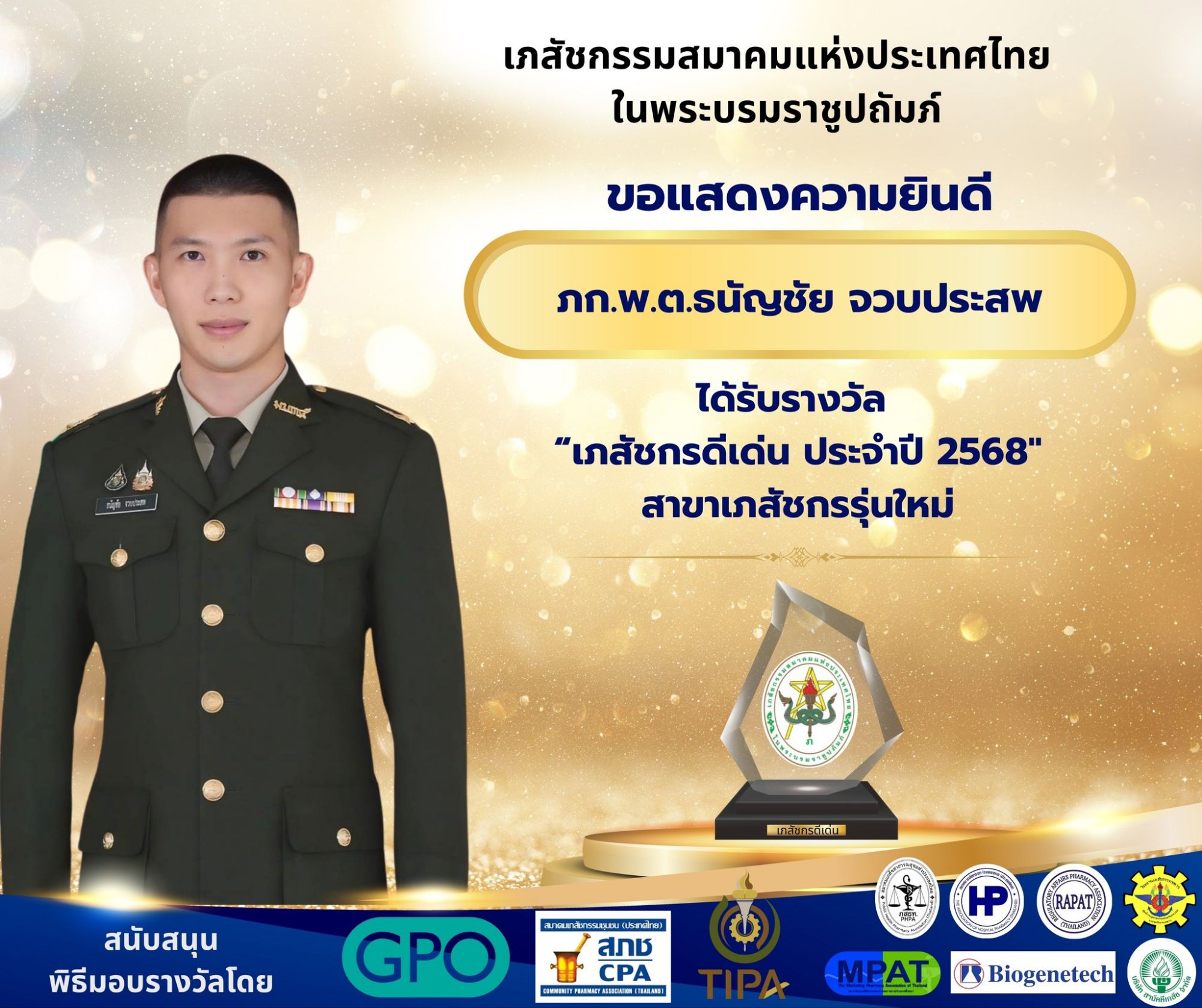 จากผลงานของ เภสัชกร พันตรี ธนัญชัย จวบประสพ ที่ผ่านมานั้น เภสัชกรรมสมาคมแห่งประเทศไทยในพระบรมราชูปถัมภ์ จึงได้คัดเลือกเป็น “เภสัชกรดีเด่นแห่งปี 2568” สาขาเภสัชกรรุ่นใหม่ (Young Pharmacist) โดยมีพิธีมอบรางวัลเภสัชกรดีเด่น เมื่อวันพฤหัสบดีที่ 16 ตุลาคม 2568 ที่ผ่านมา ณ งานประชุมเภสัชกรรมแห่งชาติ ครั้งที่ 13 (13th Thailand Pharmacy Congress) PRIS2025 ห้อง 205 อิมแพ็ค ฟอรั่ม เมืองทองธานี