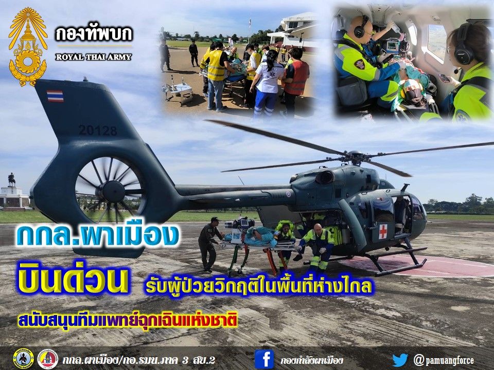 เมื่อวันที่ 30 ตุลาคม 2568 เวลา 08.50 น. กองกำลังผาเมือง โดย ชุดปฏิบัติการบินทหารบก กองกำลังผาเมือง จัดเฮลิคอปเตอร์ใช้งานทั่วไป แบบ 145 จำนวน 1 เครื่อง สนับสนุนสถาบันการแพทย์ฉุกเฉินแห่งชาติ (สพฉ.) โดยทีม SKY DOCTOR โรงพยาบาลมหาราชนครเชียงใหม่ รับผู้ป่วยฉุกเฉินทางอากาศ เพศหญิง อายุ 62 ปี ภาวะกล้ามเนื้อหัวใจตายเฉียบพลัน จาก โรงพยาบาลแม่อาย อำเภอแม่อาย จังหวัดเชียงใหม่ เพื่อเข้ารับการรักษาพยาบาลต่อที่ โรงพยาบาลนครพิงค์ อำเภอแม่ริม จังหวัดเชียงใหม่ ใช้เวลาบิน ประมาณ 50 นาที (ถ้าลำเลียงทางรถยนต์จะใช้เวลาประมาณ 4 – 5 ชั่วโมง) ป่วยถึงมือแพทย์อย่างปลอดภัย