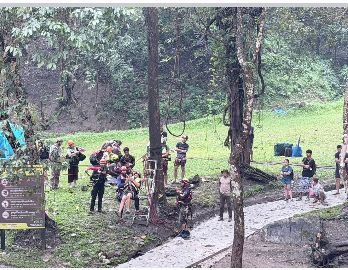 ในช่วงบ่ายที่ผ่านมา เจ้าหน้าที่อุทยานแห่งชาติออบหลวง และทีมกู้ภัยกว่า 50 นาย ได้ระดมกำลังเข้าพื้นที่และตัดสินใจใช้แผนกู้ภัยฉุกเฉิน โดยใช้วิธี “โรยตัวผูกเชือก” พาดข้ามกระแสน้ำที่ไหลเชี่ยวกราก เพื่อลำเลียงนักท่องเที่ยวทยอยออกมาทีละคนอย่างระมัดระวัง