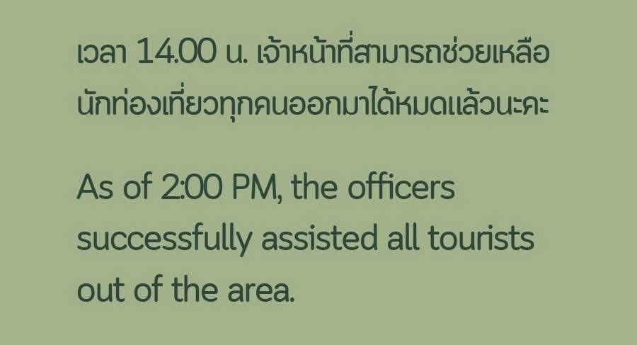 ล่าสุดเมื่อเวลา 14.00 น. เพจของอุทยานแห่งชาติออบหลวง ได้ยืนยันสถานการณ์ว่า การช่วยเหลือประสบความสำเร็จอย่างสมบูรณ์ เจ้าหน้าที่สามารถนำนักท่องเที่ยวทั้ง 25 คน ออกจากจุดติดค้างได้อย่างปลอดภัยครบถ้วนทุกคน.