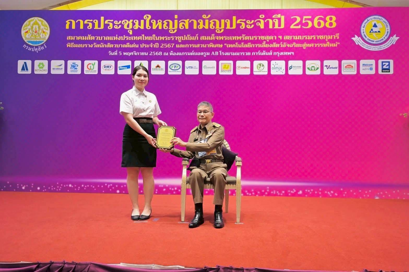 เมื่อวันที่ 5 พฤศจิกายน 2568 นางสาวญาณิศามน กันถาด มหาวิทยาลัยแม่โจ้-แพร่ เฉลิมพระเกียรติ เข้ารับโล่รางวัล “รางวัลยุวสัตวบาลดีเด่น ประจำปี 2567” จากสมาคมสัตวบาลแห่งประเทศไทย ในพระราชูปถัมภ์ สมเด็จพระเทพรัตนราชสุดาฯ สยามบรมราชกุมารี โดยมี ดร.จรัลธาดา กรรณสูต องคมนตรี ประธานในพิธีมอบรางวัล ณ โรงแรมมารวยการ์เด้น กรุงเทพมหานคร