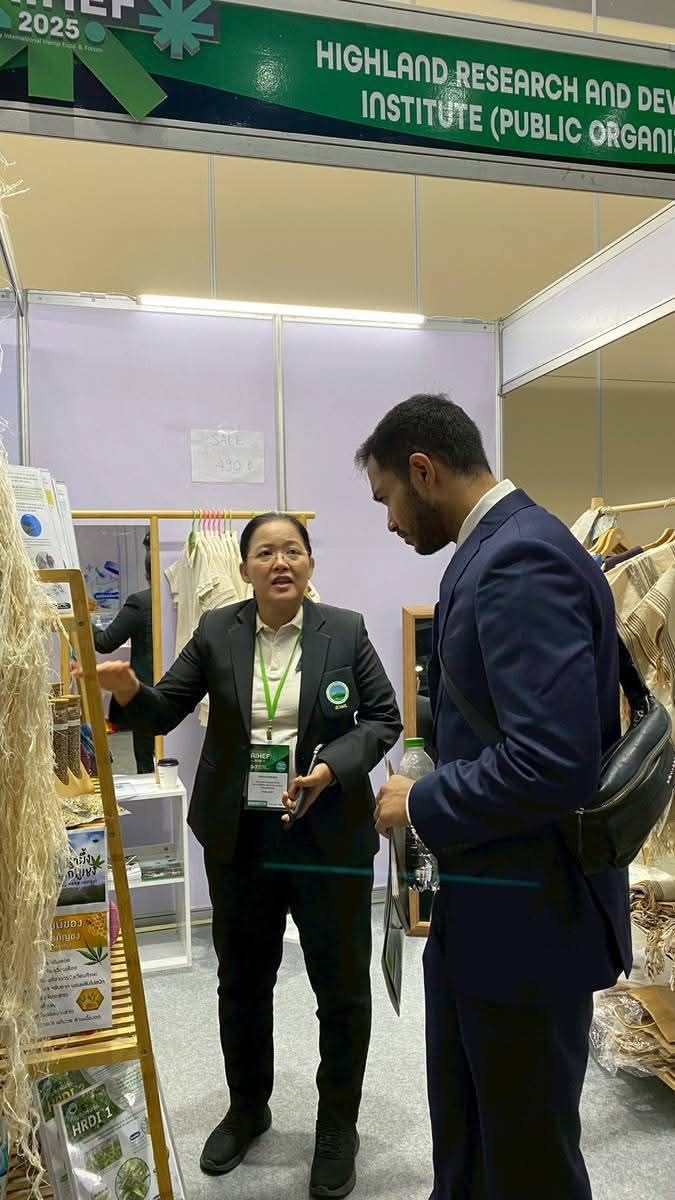นายวิรัตน์ ปราบทุกข์ ผู้อำนวยการสถาบันวิจัยและพัฒนาพื้นที่สูง และ ดร.อาณดา นิรันตรายกุล รองผู้อำนวยการสถาบัน ด้านการพัฒนา พร้อมด้วยเจ้าหน้าที่สำนักวิจัย สวพส. เข้าร่วมงานและร่วมจัดนิทรรศการ 20 ปี กัญชงบนพื้นที่สูง ภายในงาน Asia International Hemp Expo and Forum 2025 ครั้งที่ 4 ภายใต้แนวคิด “Making New Waves”