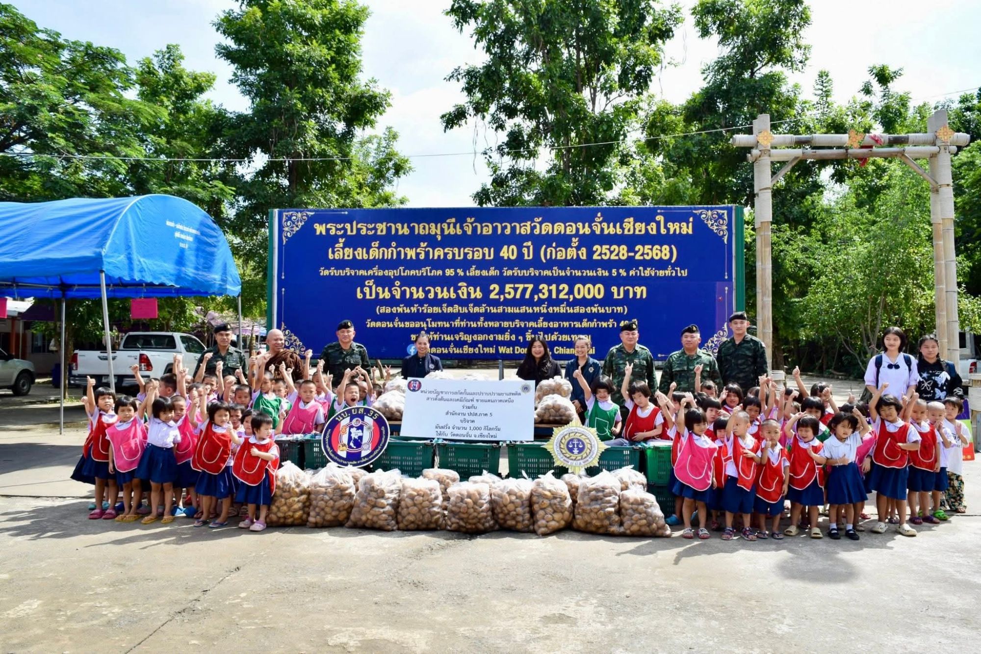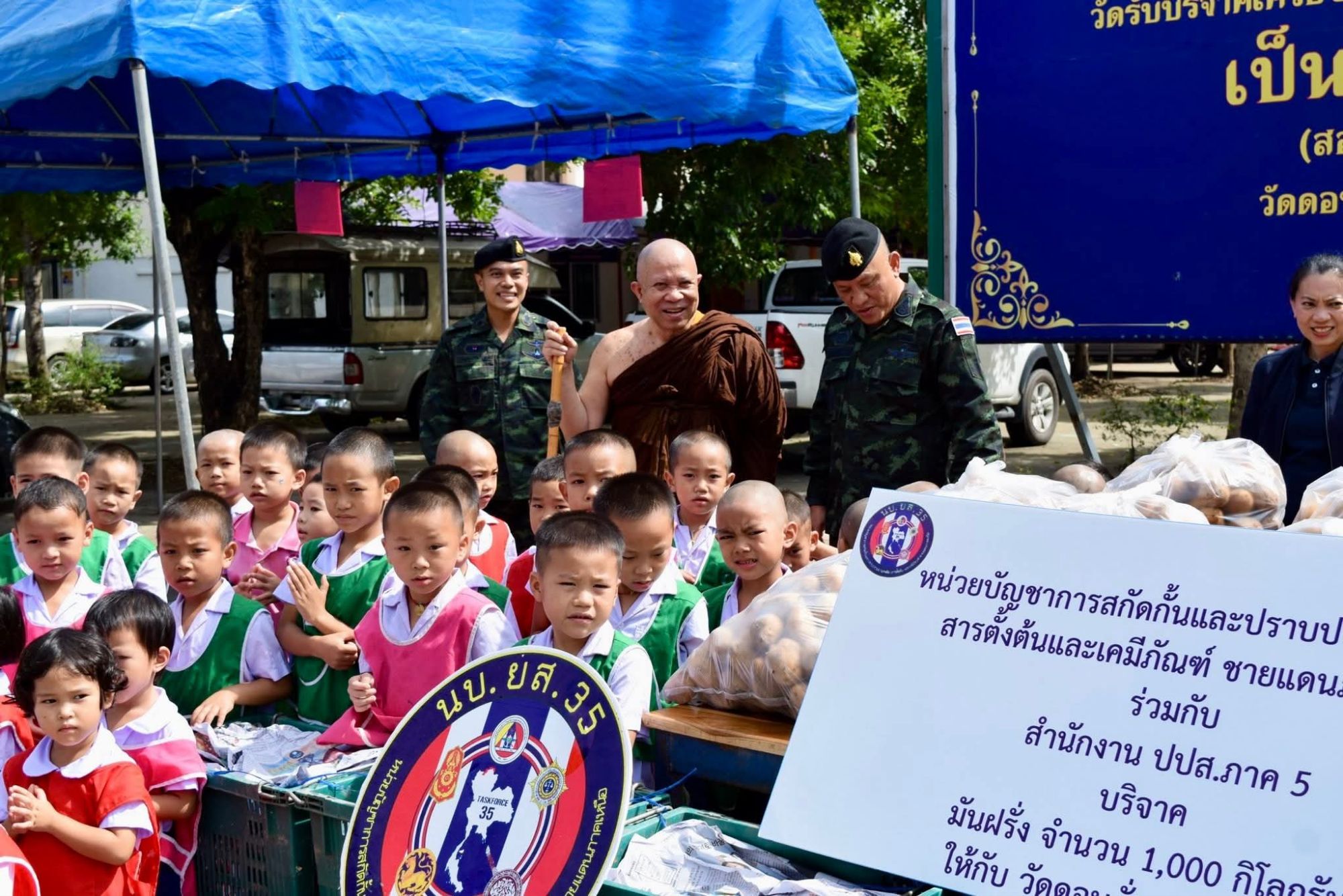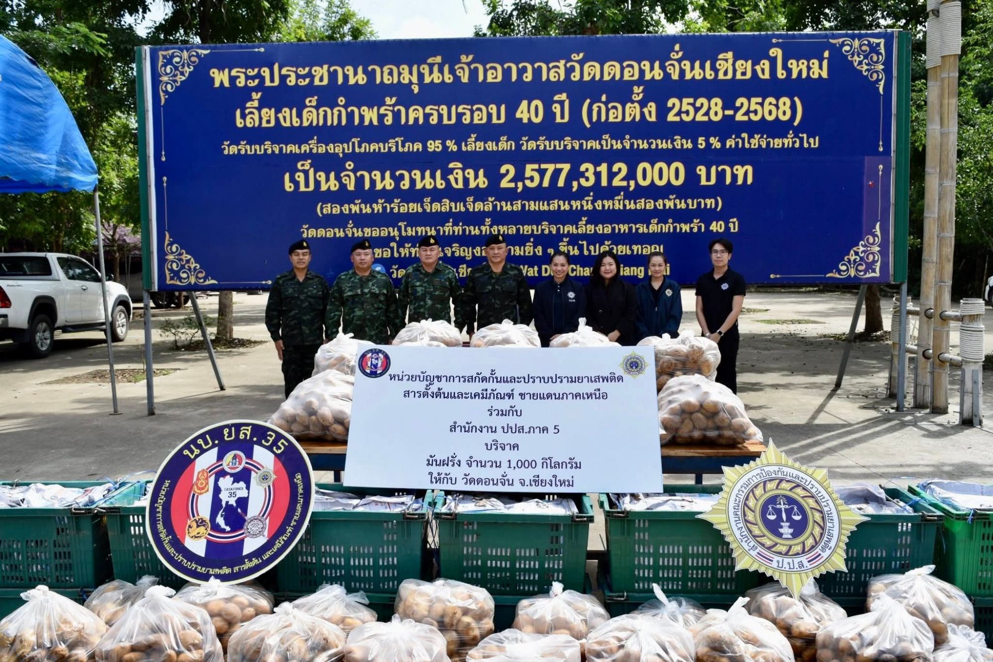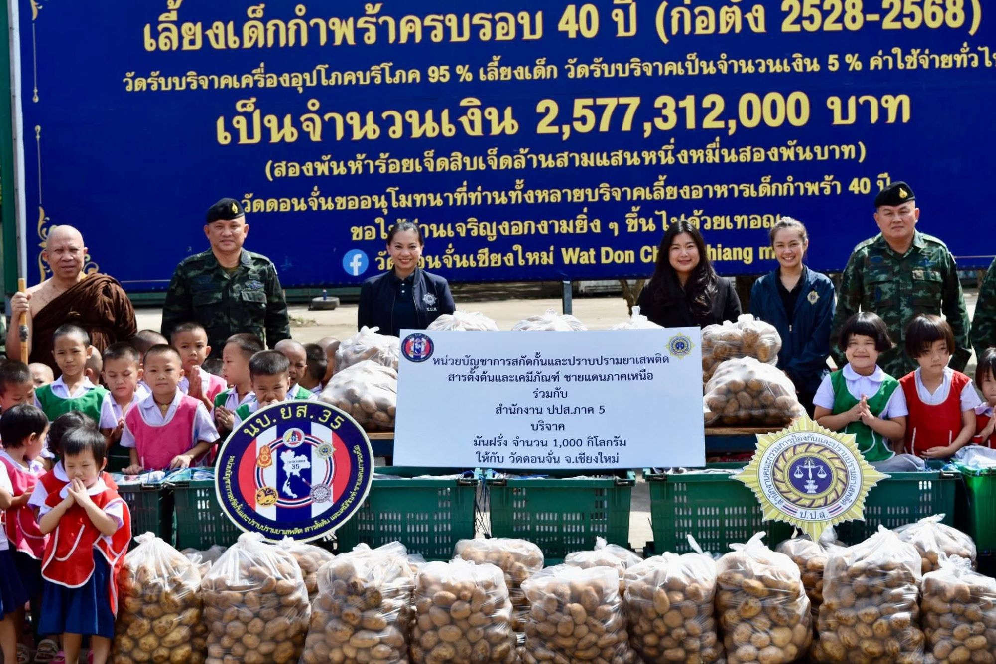 หน่วยบัญชาการสกัดกั้นและปราบปรามยาเสพติด สารตั้งต้นและเคมีภัณฑ์ ชายแดนภาคเหนือ (นบ.ยส.35) โดย พล.ต.สันติสุข ศรีเมือง รอง ผบ.นบ.ยส.35 พร้อมกำลังพลของหน่วย ร่วมกับสำนักงานป้องกันและปราบปรามยาเสพติดภาค 5 (สนง.ปปส.ภาค 5) ดำเนินกิจกรรมมอบ มันฝรั่งจำนวน 1,000 กิโลกรัม ให้กับ วัดดอนจั่น อำเภอเมือง จังหวัดเชียงใหม่