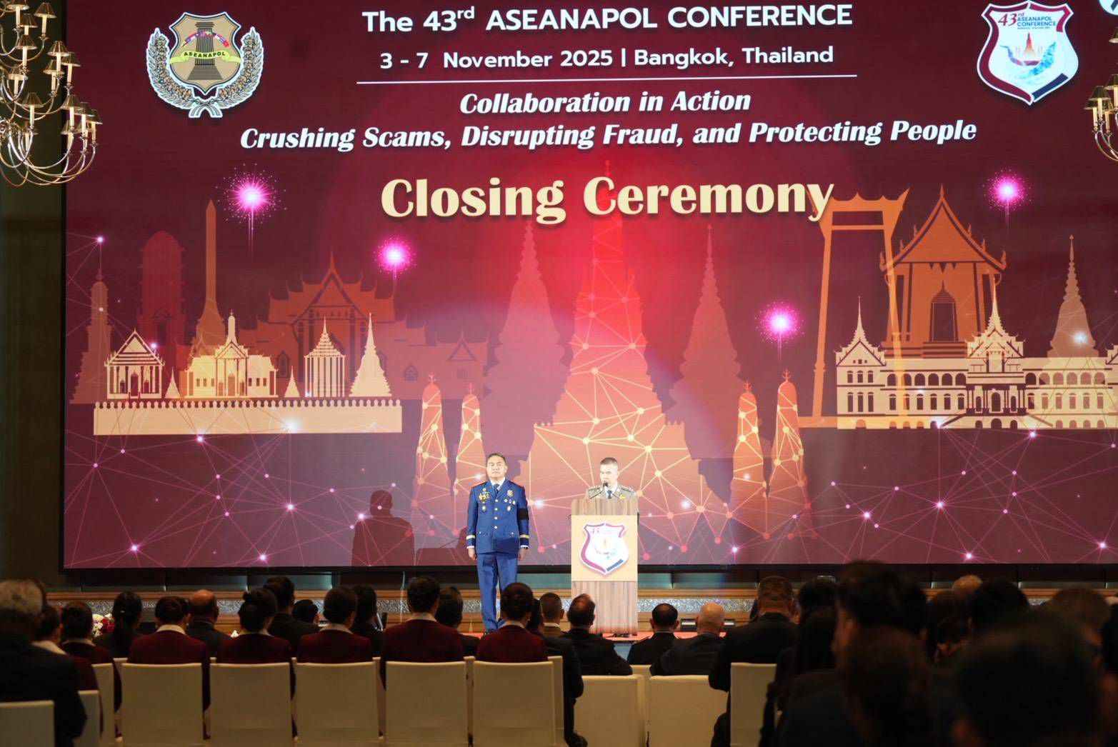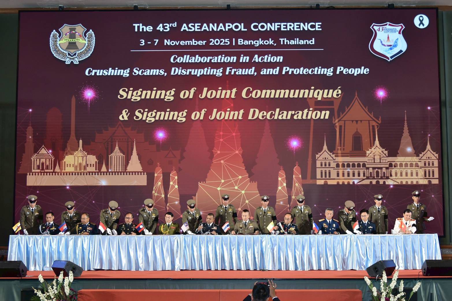 ปิดการประชุมหัวหน้าตำรวจอาเซียน ครั้งที่ 43 ’10 ประเทศสมาชิก’ ลงนามแถลงการณ์ร่วมปราบปรามอาชญากรรมข้ามชาติ และรับรองปฏิญญากรุงเทพฯ ปราบสแกมเมอร์และการค้ามนุษย์