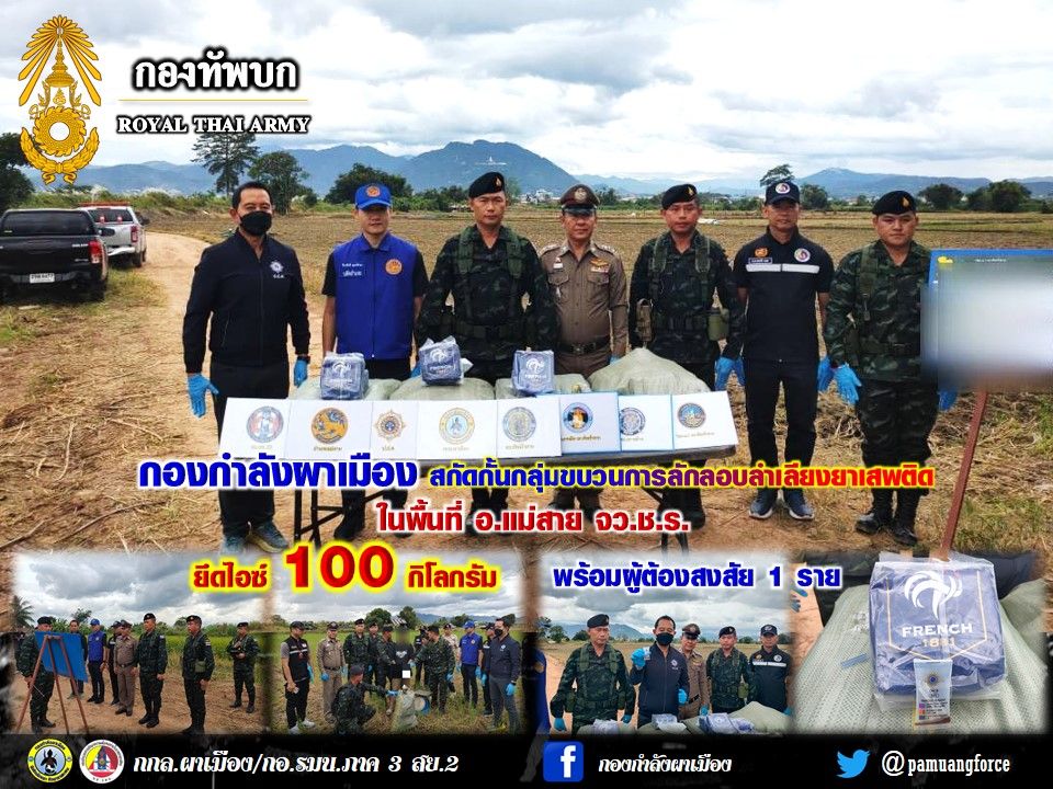 เชียงราย- ผาเมืองสกัดจับ! ไอซ์ 100 กก. คาชายแดนแม่สาย รวบ 1 ผู้ต้องสงสัย (สัญชาติเมียนมา) ยอดรวมยึดไอซ์พุ่ง 845 กก. ใน 1 เดือน