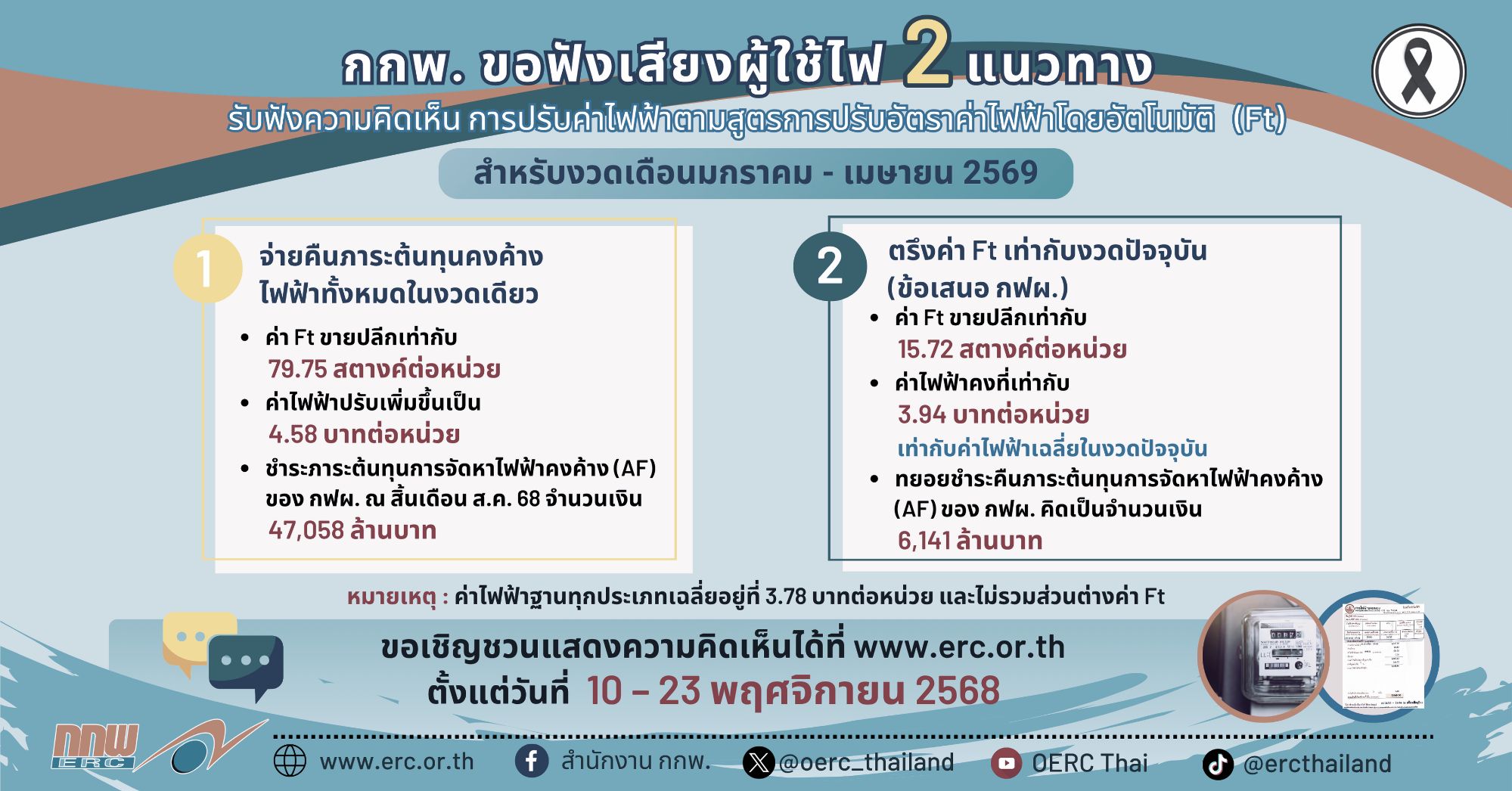 สำนักงาน กกพ. ขอเชิญชวนประชาชนร่วมกันแสดงความคิดเห็นค่าเอฟทีผ่านทางเว็บไซต์สำนักงาน กกพ. ตั้งแต่วันที่ 10 – 23 พฤศจิกายน 2568 ก่อนที่จะมีการสรุปและประกาศอย่างเป็นทางการต่อไป.