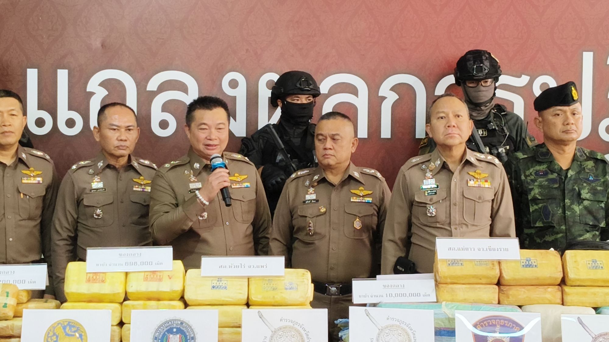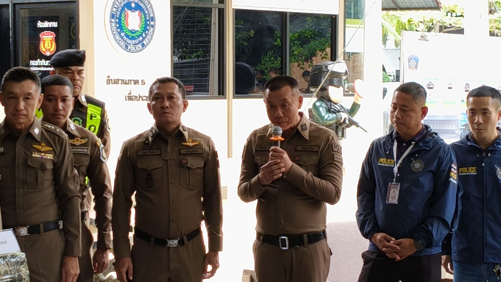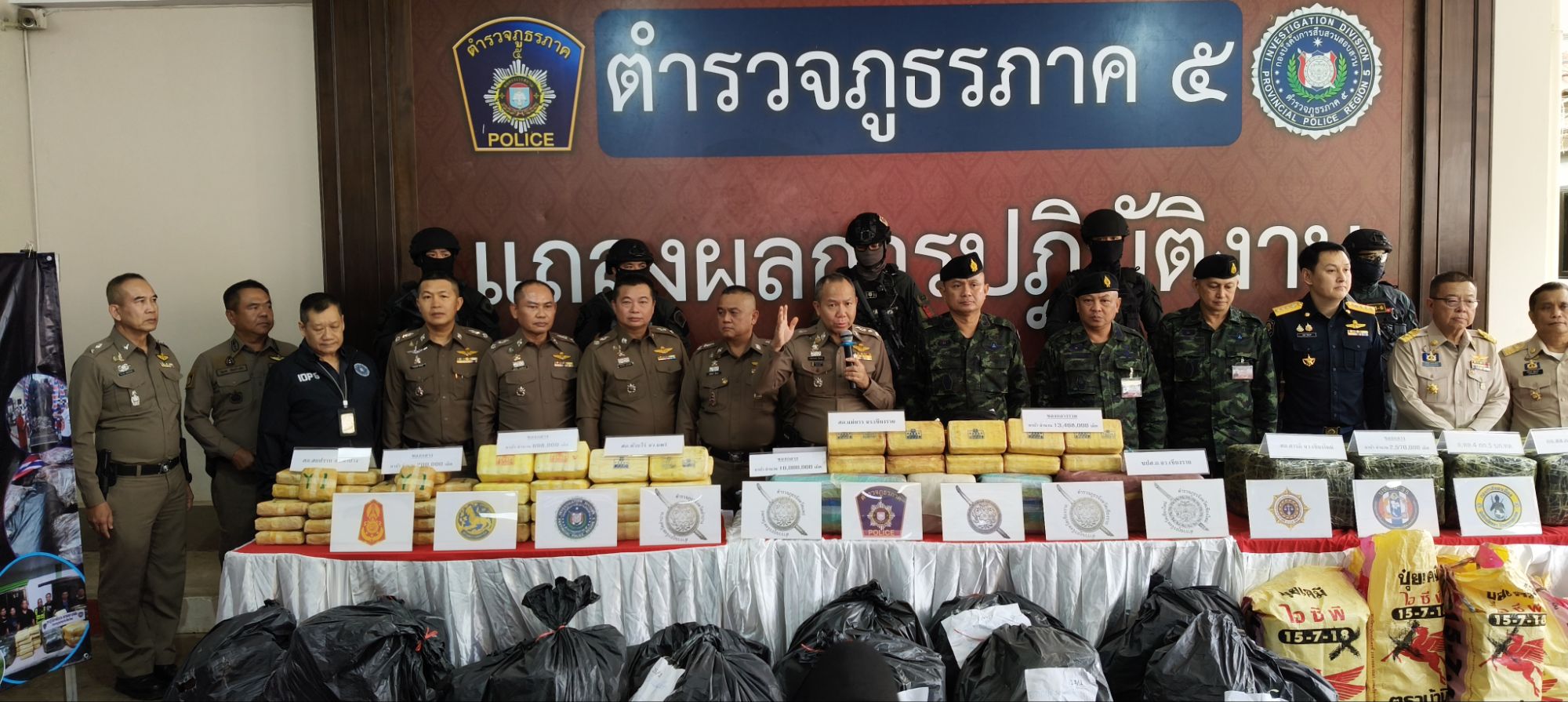 เมื่อวันที่ 12 พฤศจิกายน 2568 เวลา 11.00 น. พล.ต.ท.กฤตธาพล ยี่สาคร ผบช.ภ.5, พล.ต.ต.ธนะรัชต์ ชุ่มสวัสดิ์, พล.ต.ต.จิตร์พิสุทธิ์ อิ่มสงวน ผบก.สส.ภ.5,พล.ต.ต.มานพ เสนากูล ผบก.ภ.จว.เชียงราย, พล.ต.ต. ยุทธนา แก่นจันทร์ ผบก.ภ.จว. เชียงใหม่, พล.ต.ต.พงษ์เดช คำใจสู้ ผบก.ภ.จว.แพร่, ฝ่ายทหาร นบ.ยส.35, พลโท ชายแดน กฤษณสุวรรณ แม่ทัพน้อยภาคที่ 3 ผู้แทน พล.ท.วรเทพ บุญญะ มทภ.3 และสำนักงาน ปปส.ภาค 5 ร่วมกันแถลงผลการจับกุมคดียาเสพติดรายสำคัญ 4 คดี รวมของกลางยาบ้าทั้งสิ้นกว่า 13,268,000 เม็ด และผู้ต้องหา 10 คน ถือเป็นความสำเร็จครั้งสำคัญในการบูรณาการแก้ไขปัญหายาเสพติดในทุกมิติ ตามนโยบายรัฐบาล