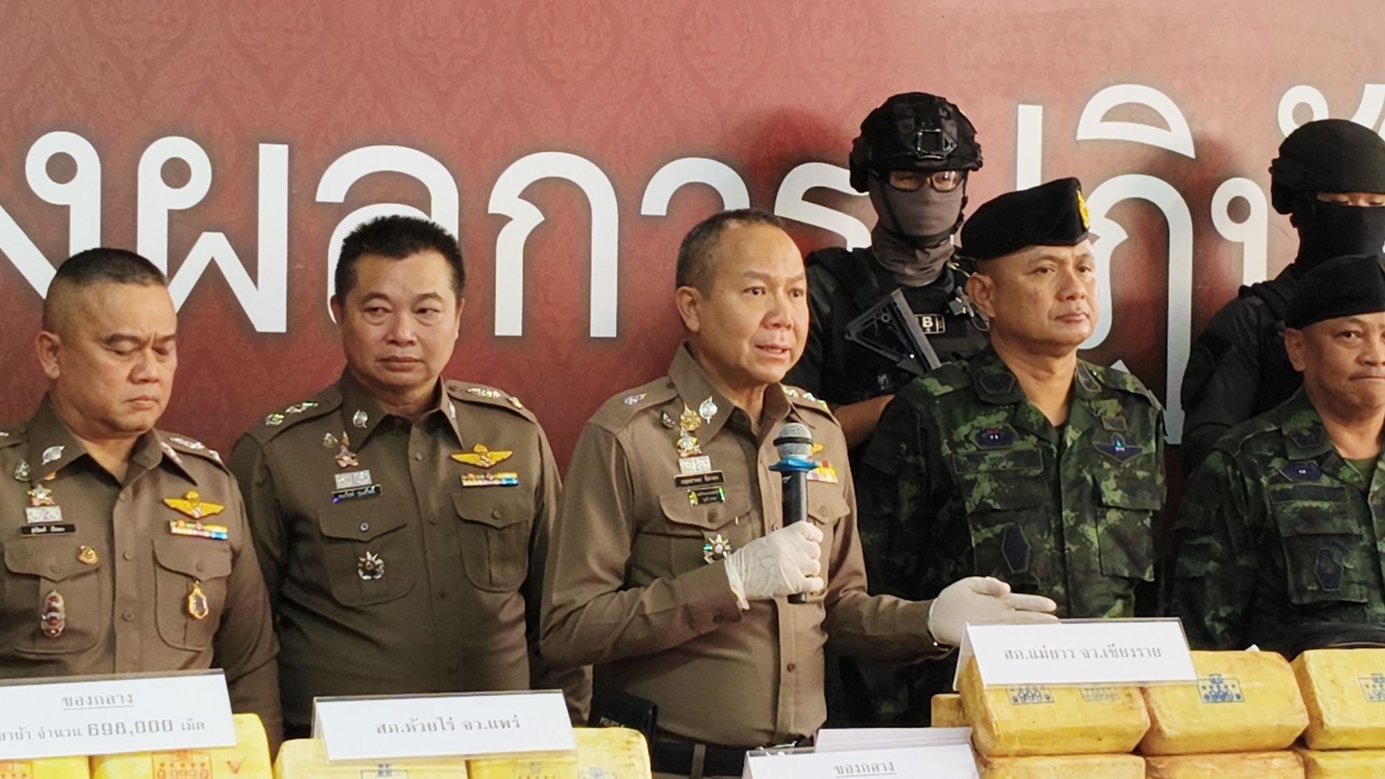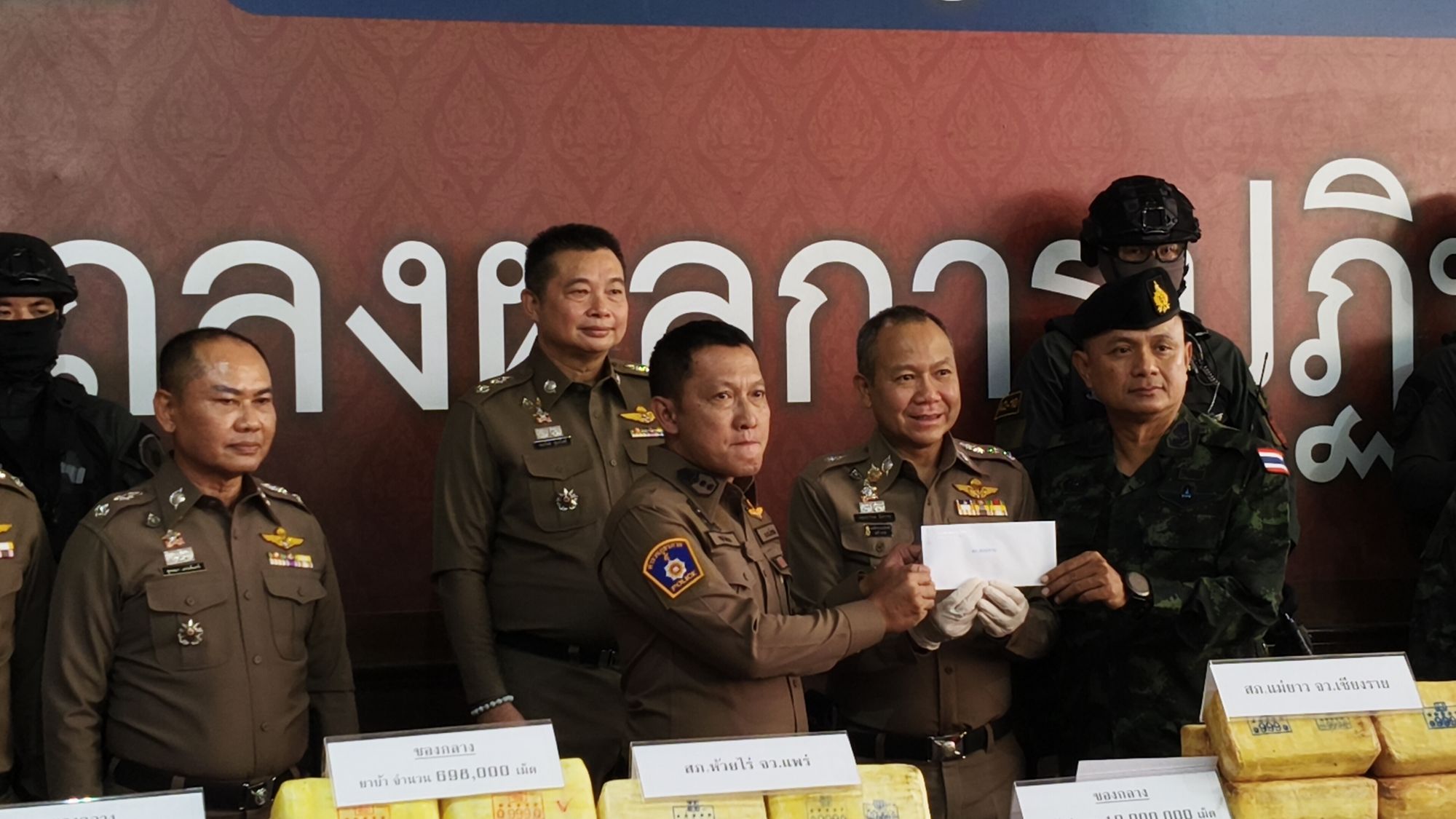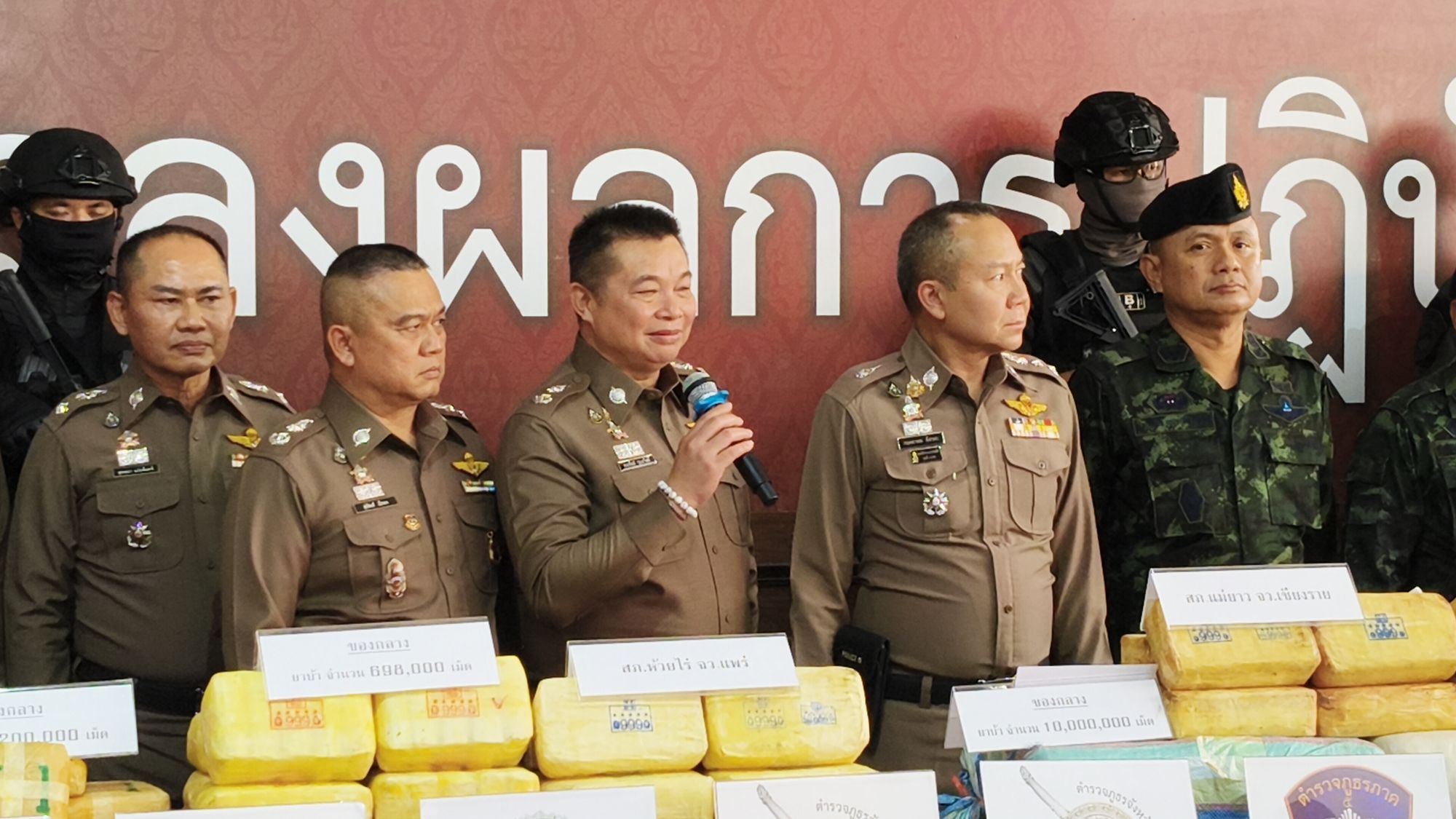 เมื่อวันที่ 12 พฤศจิกายน 2568 เวลา 11.00 น. พล.ต.ท.กฤตธาพล ยี่สาคร ผบช.ภ.5, พล.ต.ต.ธนะรัชต์ ชุ่มสวัสดิ์, พล.ต.ต.จิตร์พิสุทธิ์ อิ่มสงวน ผบก.สส.ภ.5,พล.ต.ต.มานพ เสนากูล ผบก.ภ.จว.เชียงราย, พล.ต.ต. ยุทธนา แก่นจันทร์ ผบก.ภ.จว. เชียงใหม่, พล.ต.ต.พงษ์เดช คำใจสู้ ผบก.ภ.จว.แพร่, ฝ่ายทหาร นบ.ยส.35, พลโท ชายแดน กฤษณสุวรรณ แม่ทัพน้อยภาคที่ 3 ผู้แทน พล.ท.วรเทพ บุญญะ มทภ.3 และสำนักงาน ปปส.ภาค 5 ร่วมกันแถลงผลการจับกุมคดียาเสพติดรายสำคัญ 4 คดี รวมของกลางยาบ้าทั้งสิ้นกว่า 13,268,000 เม็ด และผู้ต้องหา 10 คน ถือเป็นความสำเร็จครั้งสำคัญในการบูรณาการแก้ไขปัญหายาเสพติดในทุกมิติ ตามนโยบายรัฐบาล