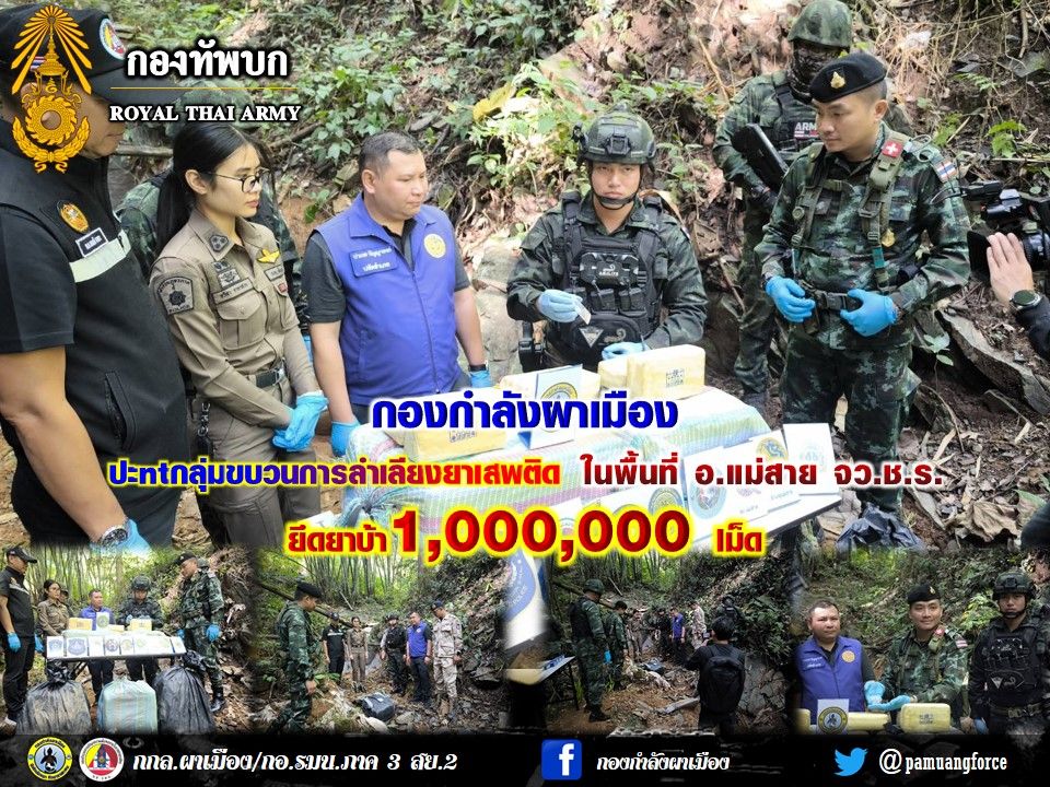 กองกำลังผาเมือง ปะทะกลุ่มขบวนการลักลอบลำเลียงยาเสพติด ยึดยาบ้า 1,000,000 เม็ด อำเภอแม่สาย จังหวัดเชียงราย