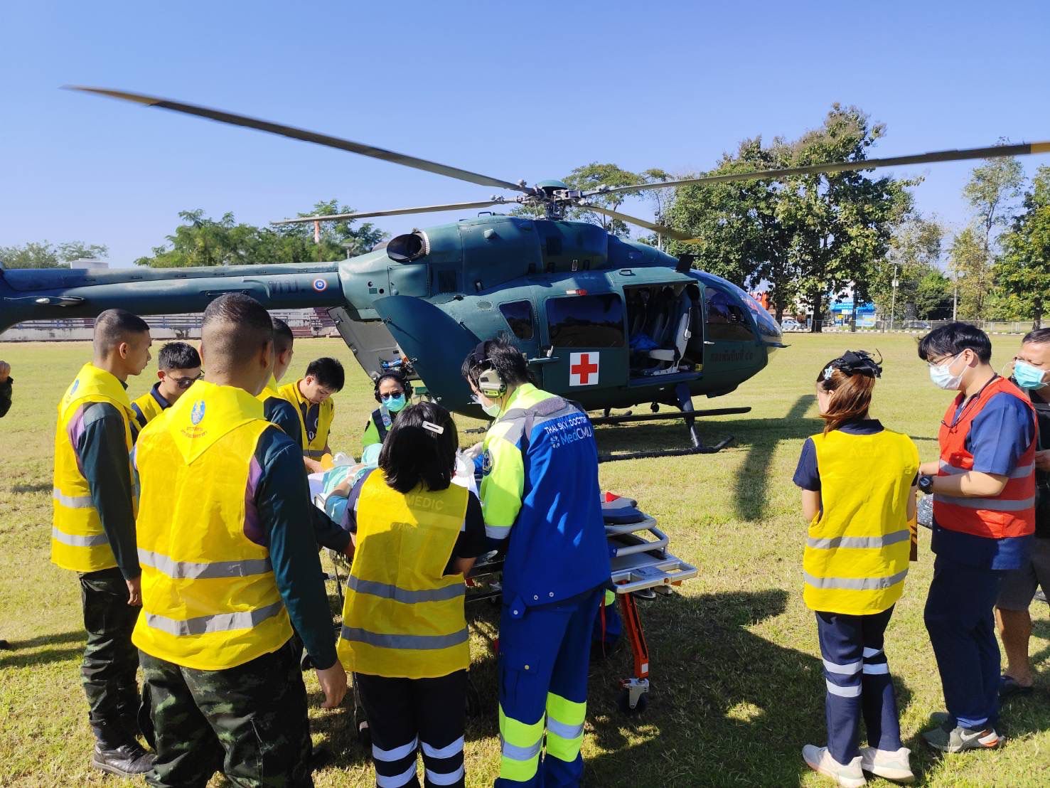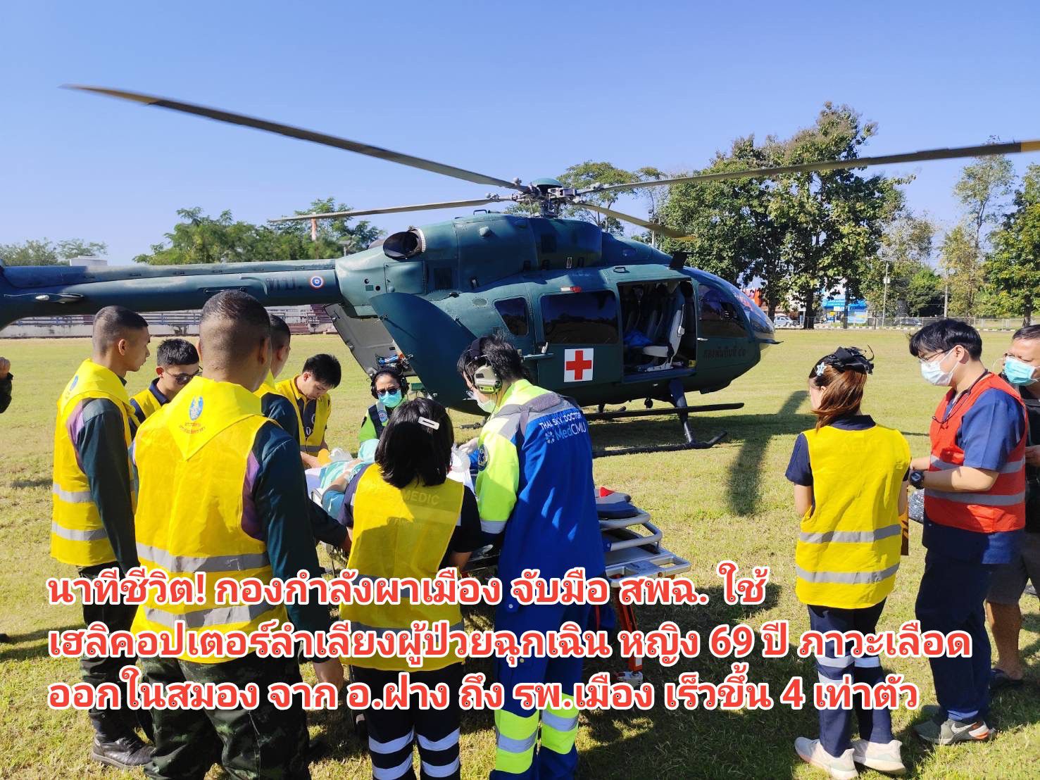 นาทีชีวิต! กองกำลังผาเมือง จับมือ สพฉ. ใช้เฮลิคอปเตอร์ลำเลียงผู้ป่วยฉุกเฉิน หญิง 69 ปี ภาวะเลือดออกในสมอง จาก อ.ฝาง ถึง รพ.เมือง เร็วขึ้น 4 เท่าตัว