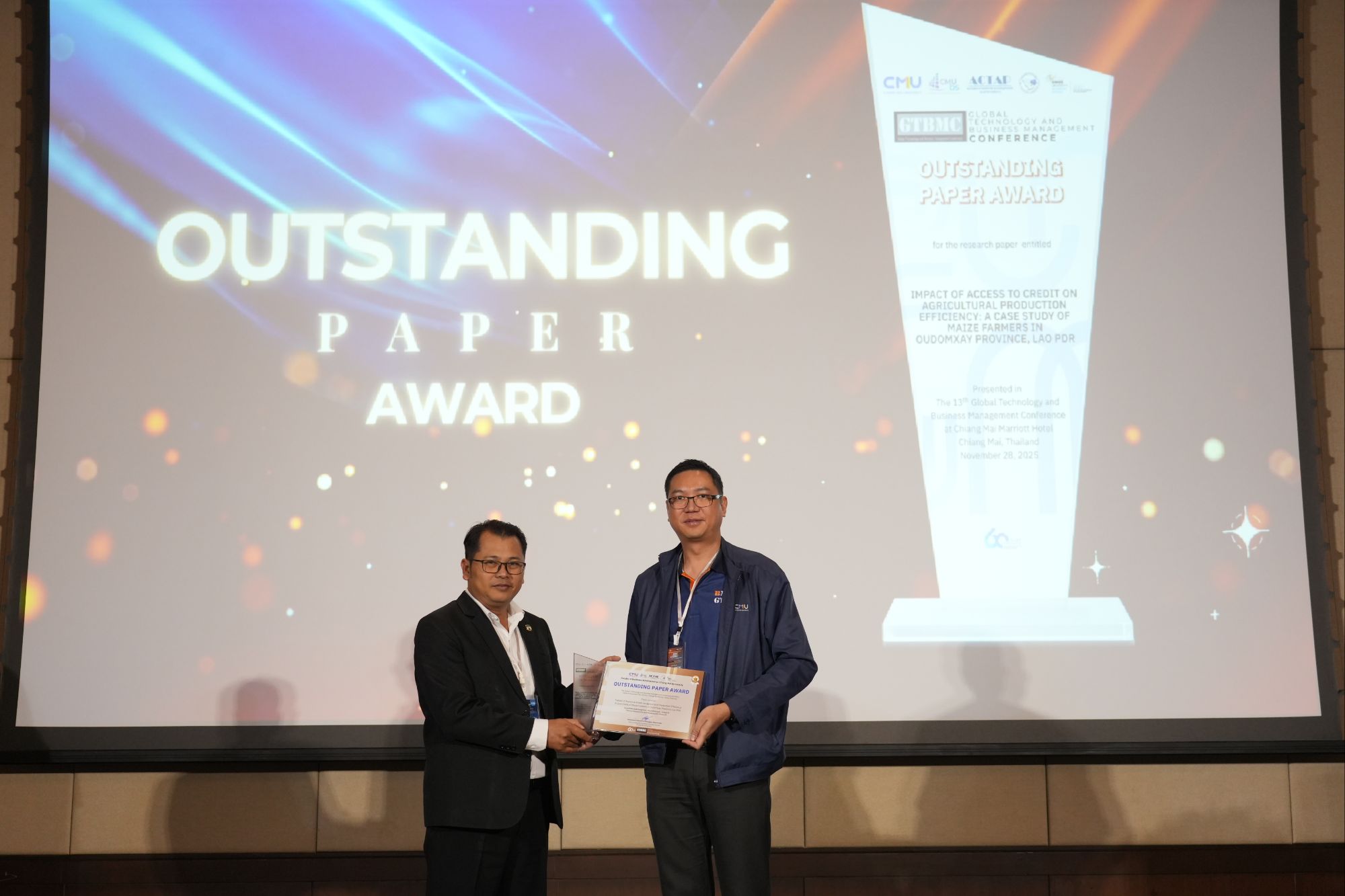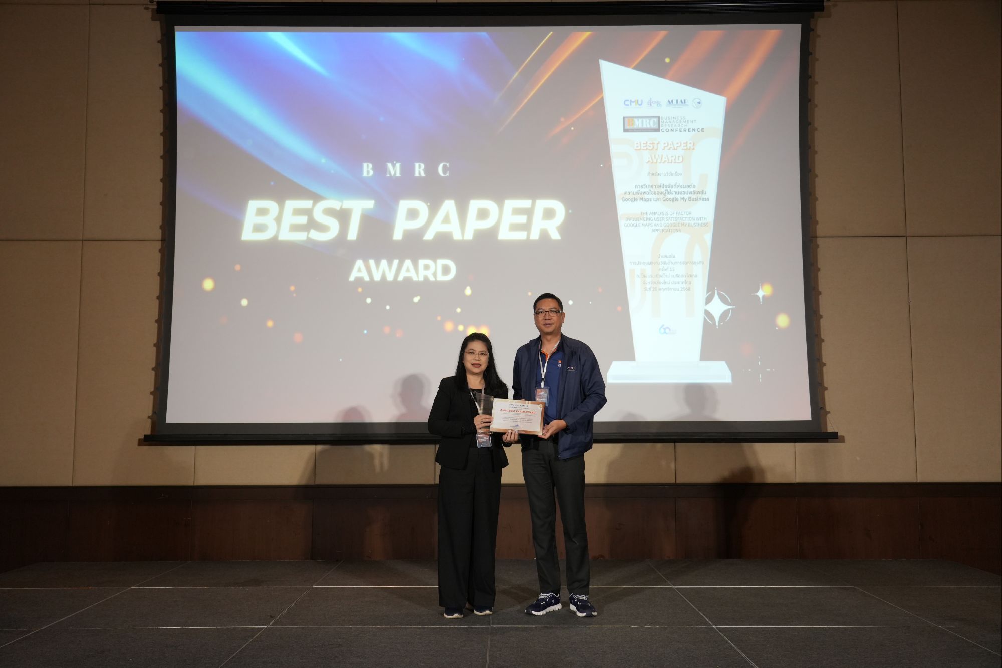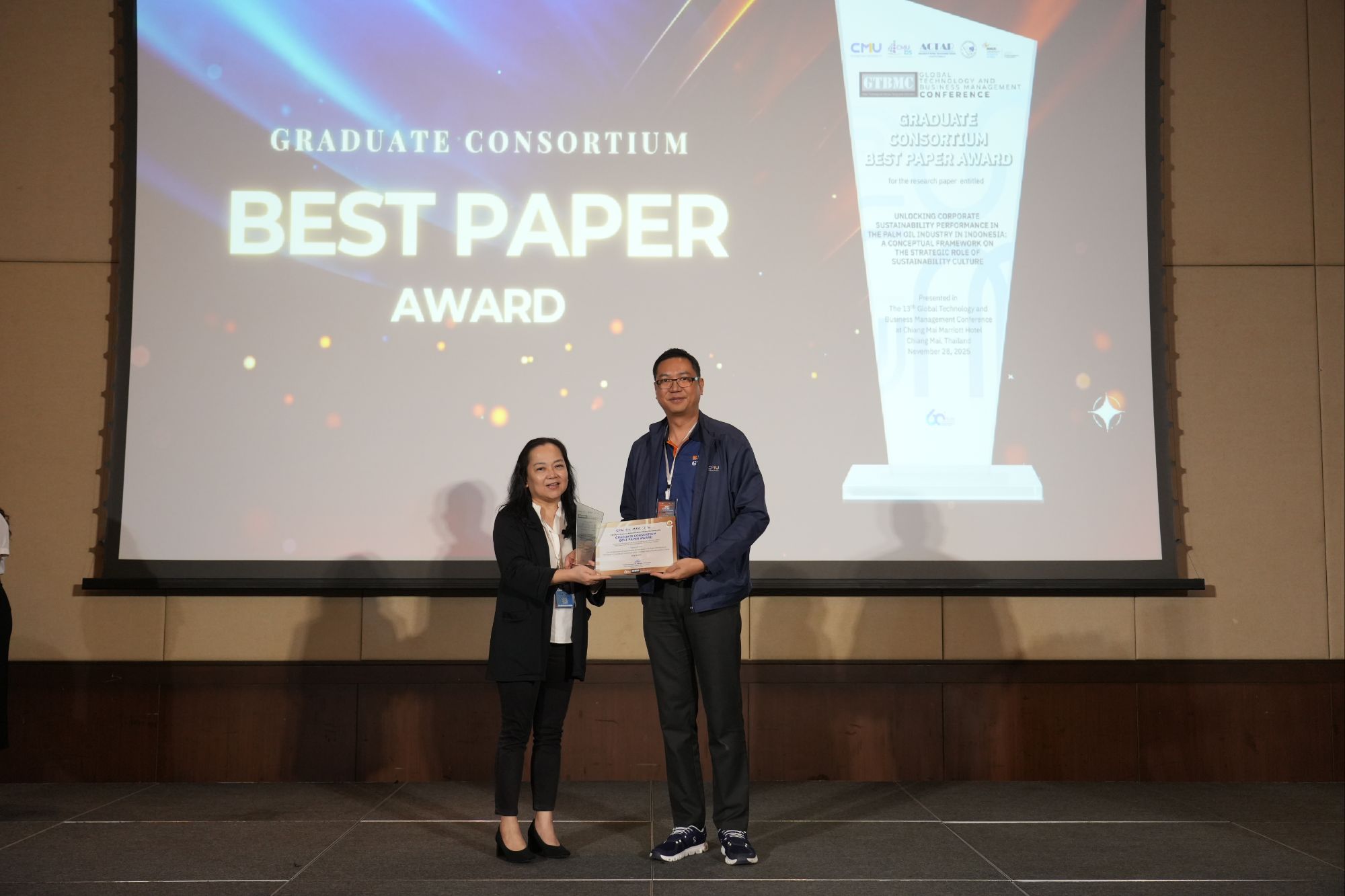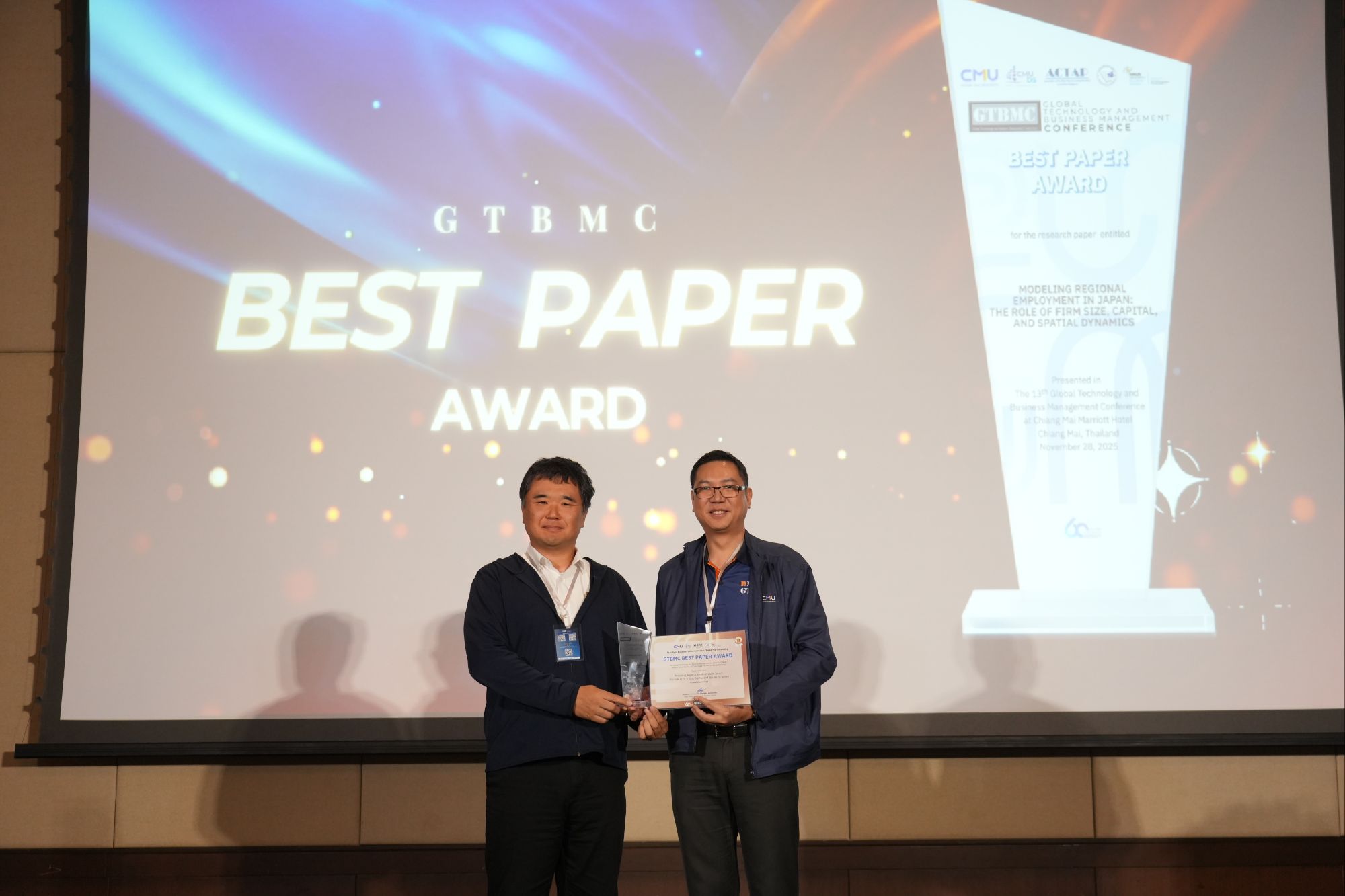สำหรับผลการประกวดผลงานวิจัยดีเด่นในครั้งนี้มีทั้งหมด 4 รางวัล ได้แก่ รางวัล BMRC Best Paper Award จากงานวิจัยเรื่อง “การวิเคราะห์ปัจจัยที่ส่งผลต่อความพึงพอใจของผู้ใช้งานแอปพลิเคชัน Google Maps และ Google My Business” โดยนักวิจัยจากประเทศไทย กาญจนาภรณ์ พลประทีป สังกัดมหาวิทยาลัยเทคโนโลยีมหานคร, รางวัล GTBMC Best Paper Award จากงานวิจัยเรื่อง “Modeling Regional Employment in Japan: The Role of Firm Size, Capital, and Spatial Dynamics” จากประเทศญี่ปุ่น Yuzuru Utsunomiya สังกัดมหาวิทยาลัยนางาซากิ, รางวัล Outstanding Paper Award จากงานวิจัยเรื่อง “Impact of Access to Credit on Agricultural Production Efficiency: A Case Study of Maize Farmers in Oudomxay Province, Lao PDR” โดยนักวิจัยจาก สปป.ลาว Ananthala Nakhiengchan สังกัด Banking Institute และรางวัล Graduate Consortium Best Paper Award จากผลงาน “Unlocking Corporate Sustainability Performance in the Palm Oil Industry in Indonesia: A Conceptual Framework on the Strategic Role of Sustainability Culture” โดยนักวิจัยจากอินโดนีเซีย Susy Harjanti สังกัด BINUS Business School ทั้งนี้ ทุกผลงานสะท้อนศักยภาพของนักวิจัยในระดับนานาชาติ และโดดเด่นทั้งด้านคุณค่าทางวิชาการ นวัตกรรม และประโยชน์ต่อสังคมอย่างแท้จริง