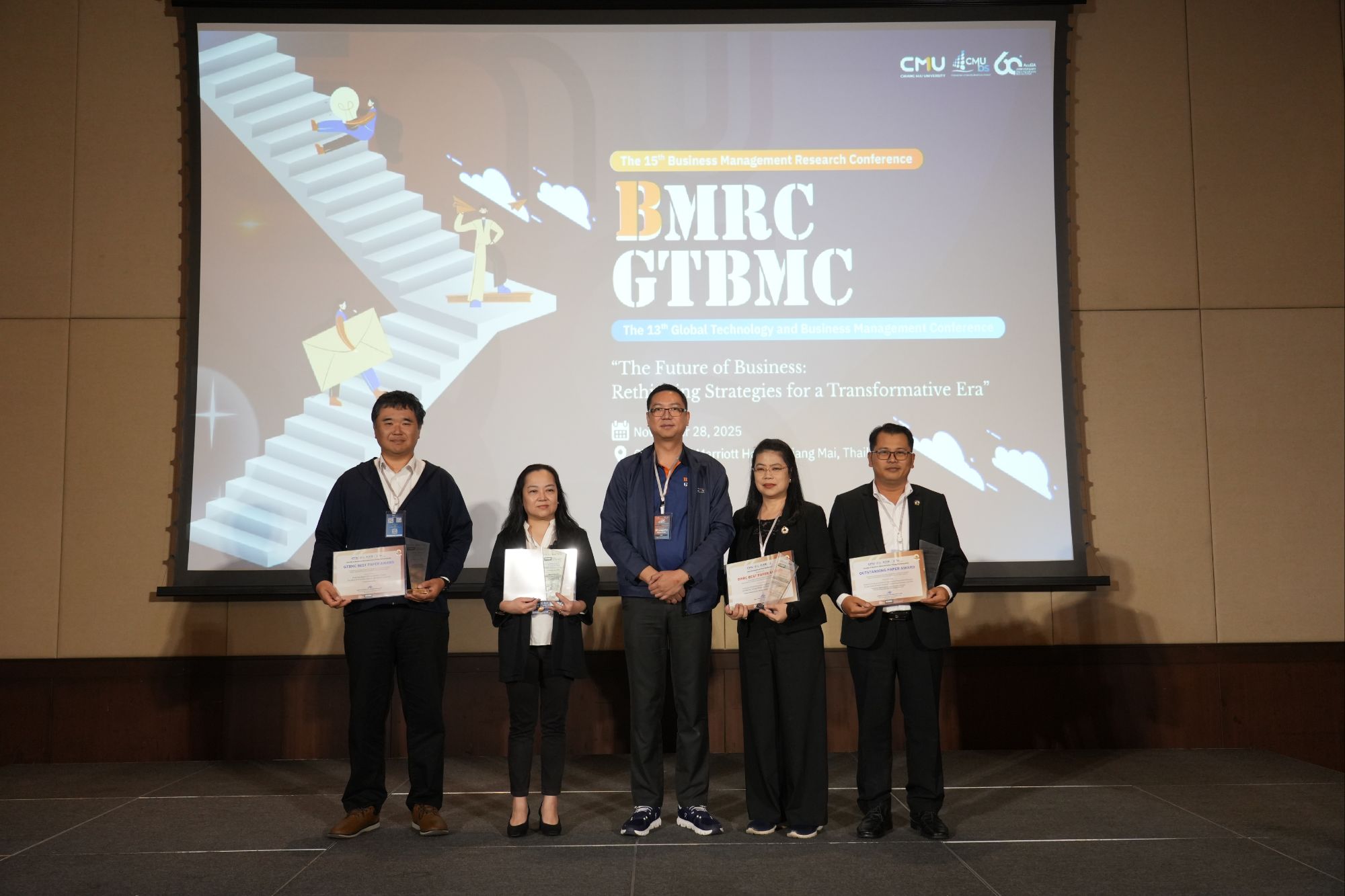 เมื่อวันที่ 28 พฤศจิกายน 2568 – คณะบริหารธุรกิจ มหาวิทยาลัยเชียงใหม่ ร่วมกับสมาคมสำนักงานบัญชีคุณภาพ สมาคมสำนักงานสอบบัญชีไทย และ BINUS University Business School สาธารณรัฐอินโดนีเซีย จัดการประชุมผลงานวิจัยด้านการจัดการธุรกิจระดับชาติ ครั้งที่ 15 (The Business Management Research Conference: BMRC) และการประชุมผลงานวิจัยนานาชาติด้านการจัดการธุรกิจ ครั้งที่ 13 (The Global Technology and Business Management Conference: GTBMC) ภายใต้แนวคิด “The Future of Business: Rethinking Strategies for a Transformative Era” ณ โรงแรมเชียงใหม่ แมริออท เพื่อเปิดเวทีให้อาจารย์ นักวิจัย และนักวิชาการจากทั้งในและต่างประเทศ นำเสนอผลงานวิจัย ประกวดบทความ และแลกเปลี่ยนองค์ความรู้เชิงลึกที่สร้างผลกระทบทั้งด้านวิชาการ นวัตกรรม และสังคม พร้อมเสริมศักยภาพนักวิชาการและนักศึกษาระดับบัณฑิตศึกษาให้นำองค์ความรู้ไปต่อยอดสู่การพัฒนาธุรกิจในระดับชุมชนและระดับประเทศ โดยมีผู้เข้าร่วมงานกว่า 160 คน