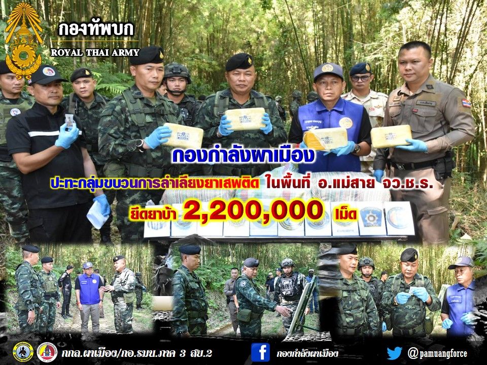กองกำลังผาเมือง ปะทะกลุ่มขบวนการลักลอบลำเลียงยาเสพติด ยึดยาบ้า 2,200,000 เม็ด อ.แม่สาย จ.เชียงราย