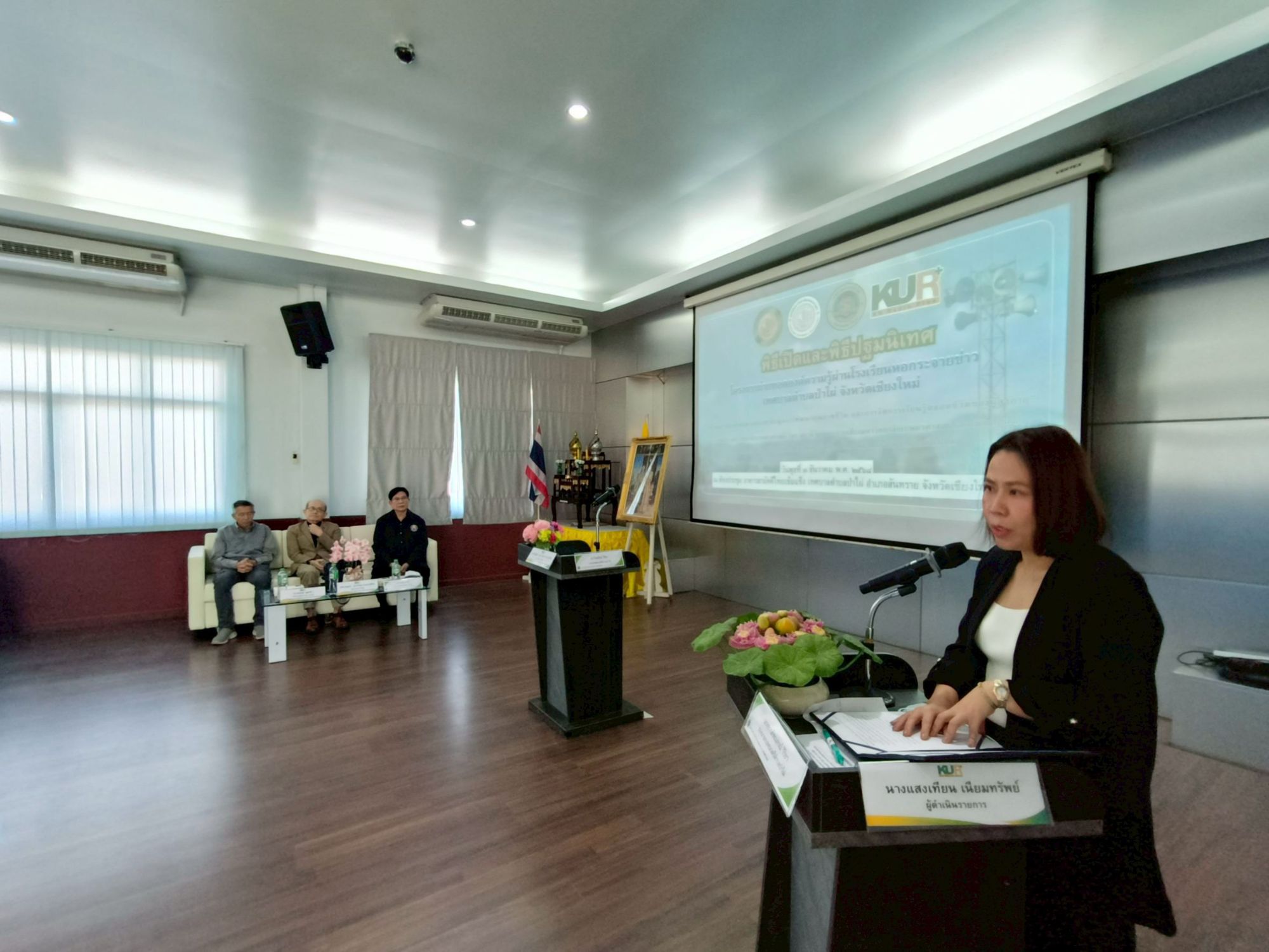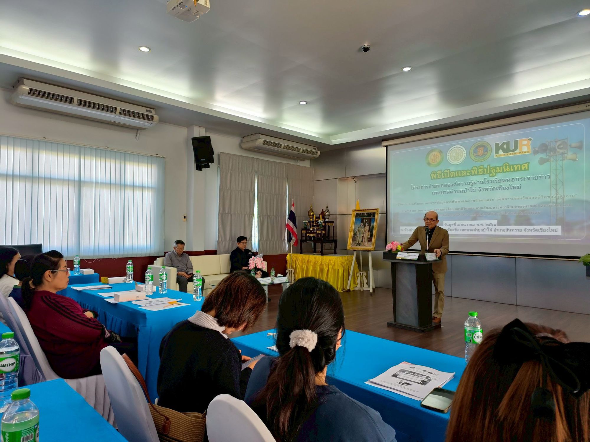 ที่ห้องประชุมเทศบาลตำบลป่าไผ่ ผศ.อนุพร สุวรรณวาจกกสิกิจ ผู้อำนวยการใหญ่สถานีวิทยุกระจายเสียงมหาวิทยาลัยเกษตรศาสตร์ และผู้จัดการมูลนิธิมหาวิทยาลัยเกษตรศาสตร์ พร้อมด้วย นายไชยยันต์ วิริยา นายกเทศมนตรีตำบลป่าไผ่ ร่วมกันเปิดโครงการ “ถ่ายทอดองค์ความรู้ผ่านโรงเรียนหอกระจายข่าว” โดยมีกลุ่มเป้าหมายผู้สูงวัยจาก 3 หมู่บ้านต้นแบบจำนวน 50 คนเข้าร่วม