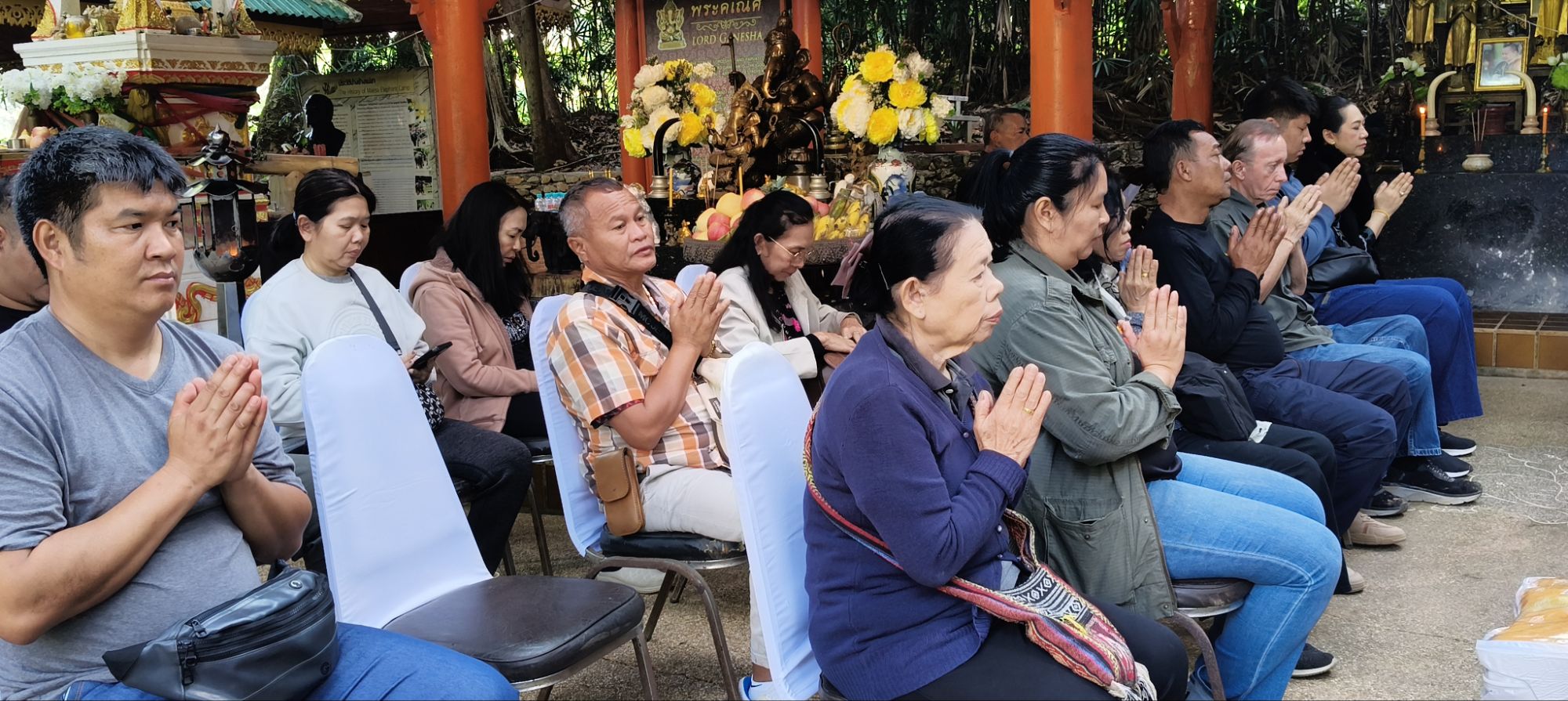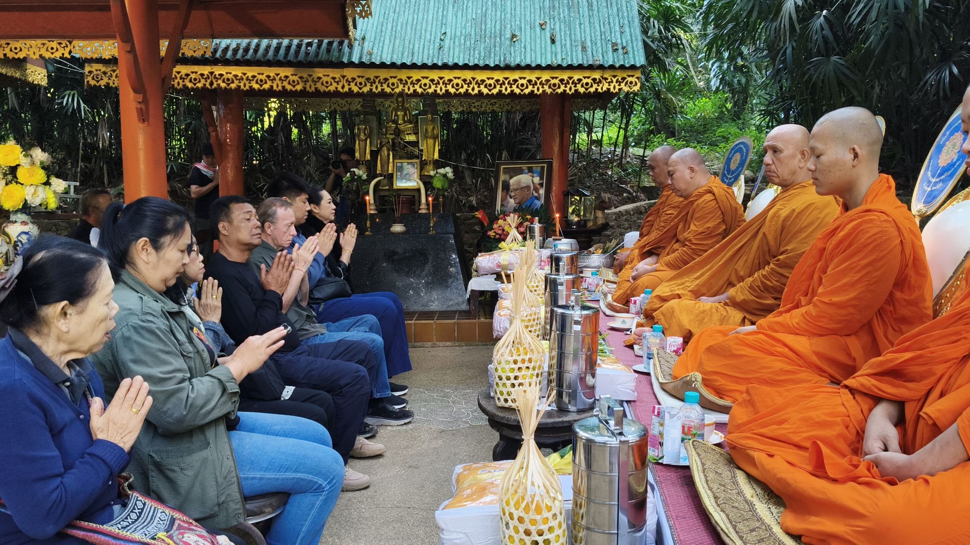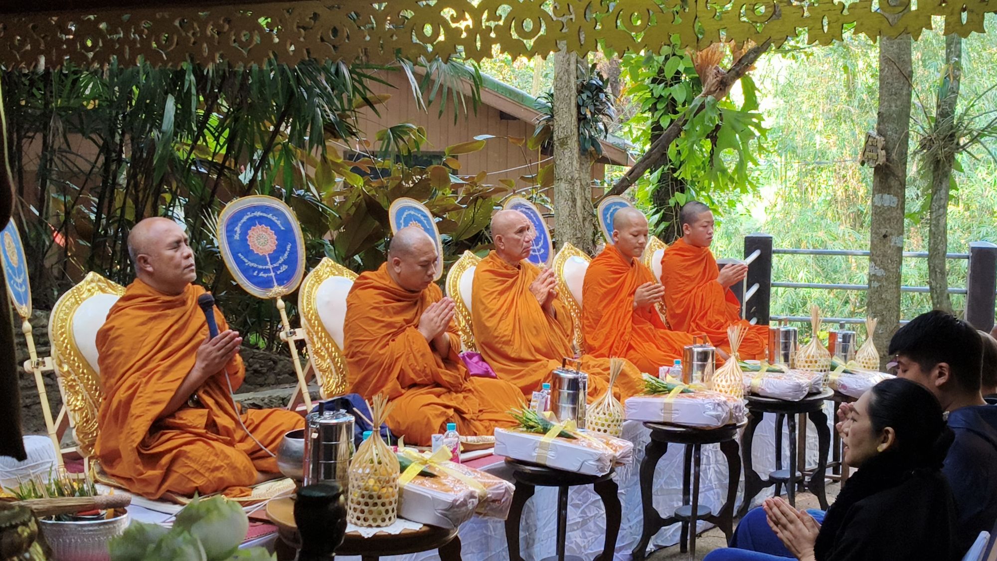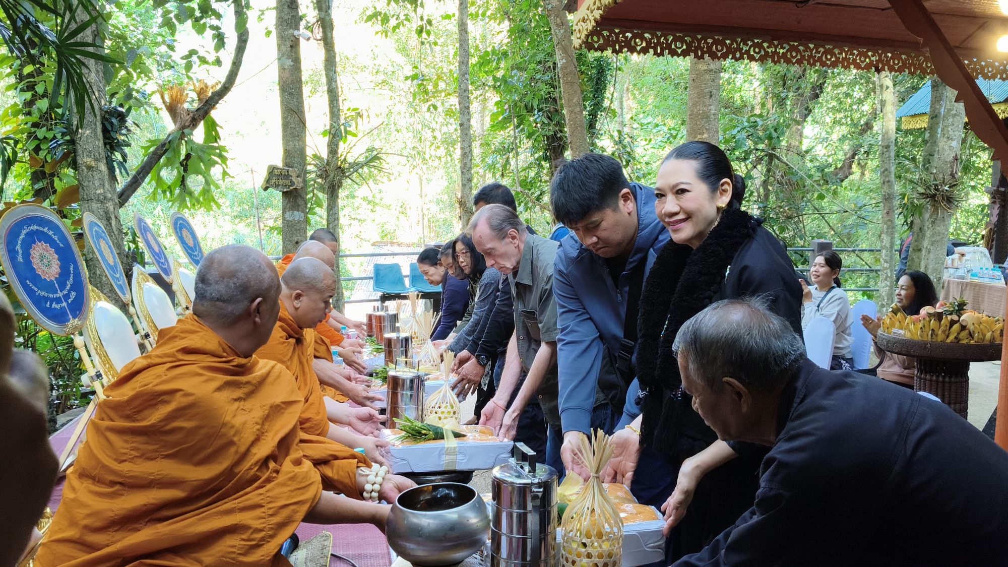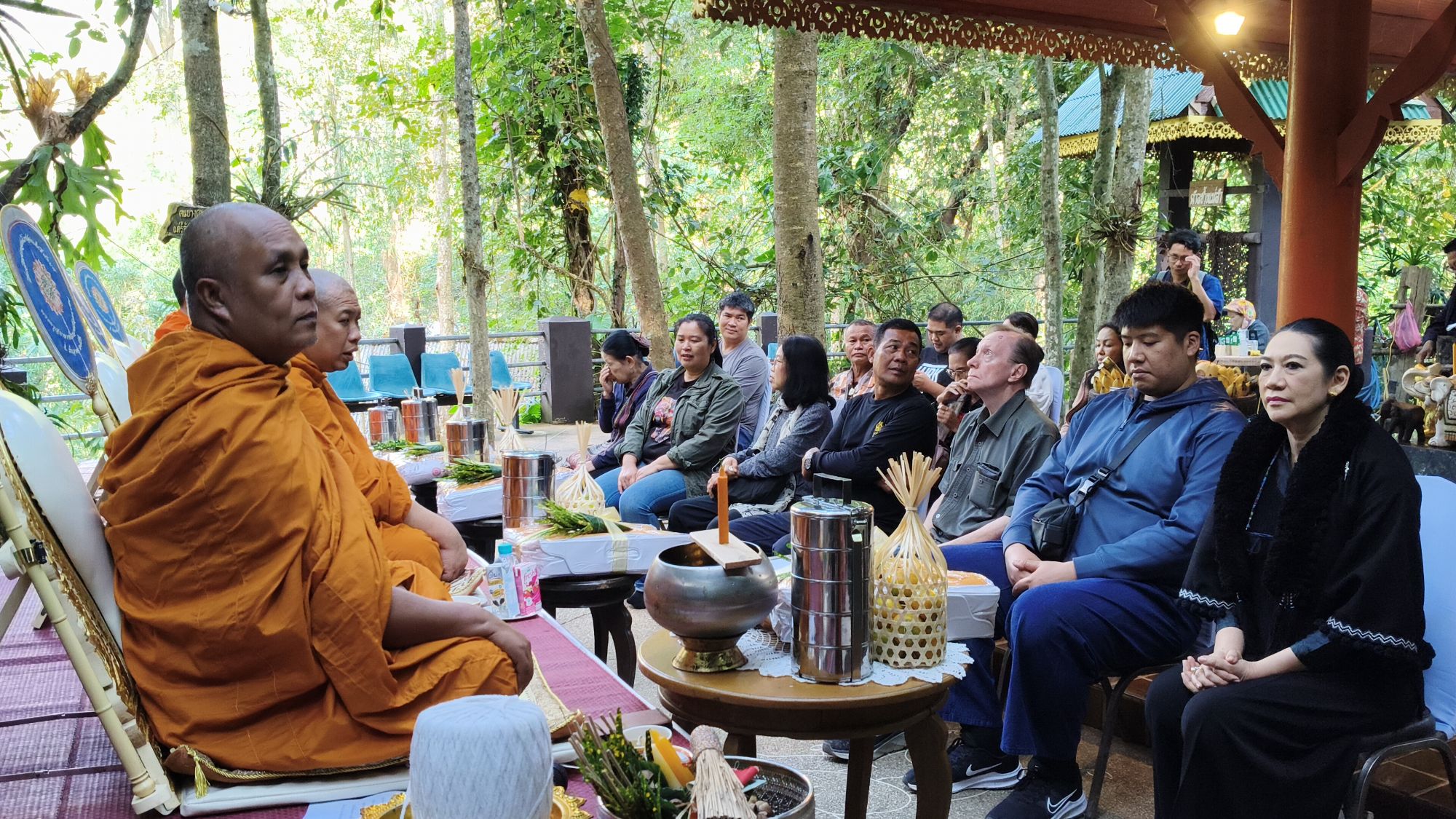 เวลา 10.09 น. ได้เริ่มพิธีสงฆ์ โดยนิมนต์พระสงฆ์จำนวน 5 รูป มาทำพิธีเพื่ออุทิศส่วนบุญส่วนกุศลให้แก่ พ่อเลี้ยงชูชาติ กัลมาพิจิตร, ปู่เชิด กัลมาพิจิตร, ย่าสะอิ้ง ทรรทรานนท์, ป้าสุรางค์ โยมสินธ์, ป้าพาณี กัลมาพิจิตร รวมถึงช้างและควาญช้าง ตลอดจนพนักงานที่ล่วงลับไปแล้ว นอกจากนี้ ยังได้ทำบุญอุทิศส่วนกุญศลไปถึง นายชัยพินธ์ ขัติยะ หรือ “อ้อน ไทยรัฐ” อดีตผู้สื่อข่าวอาวุโสและหัวหน้าศูนย์ข่าวไทยรัฐภาคเหนือ ที่เสียชีวิตเมื่อเดือนมิถุนายน 2568 ด้วย
