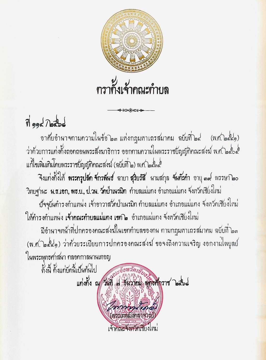 ทั้งนี้ การแต่งตั้งมีผลตั้งแต่วันที่ 8 ธันวาคม พุทธศักราช 2568 โดย พระเทพมังคลาจารย์ เจ้าคณะจังหวัดเชียงใหม่ ได้ลงนามแต่งตั้งอย่างเป็นทางการ