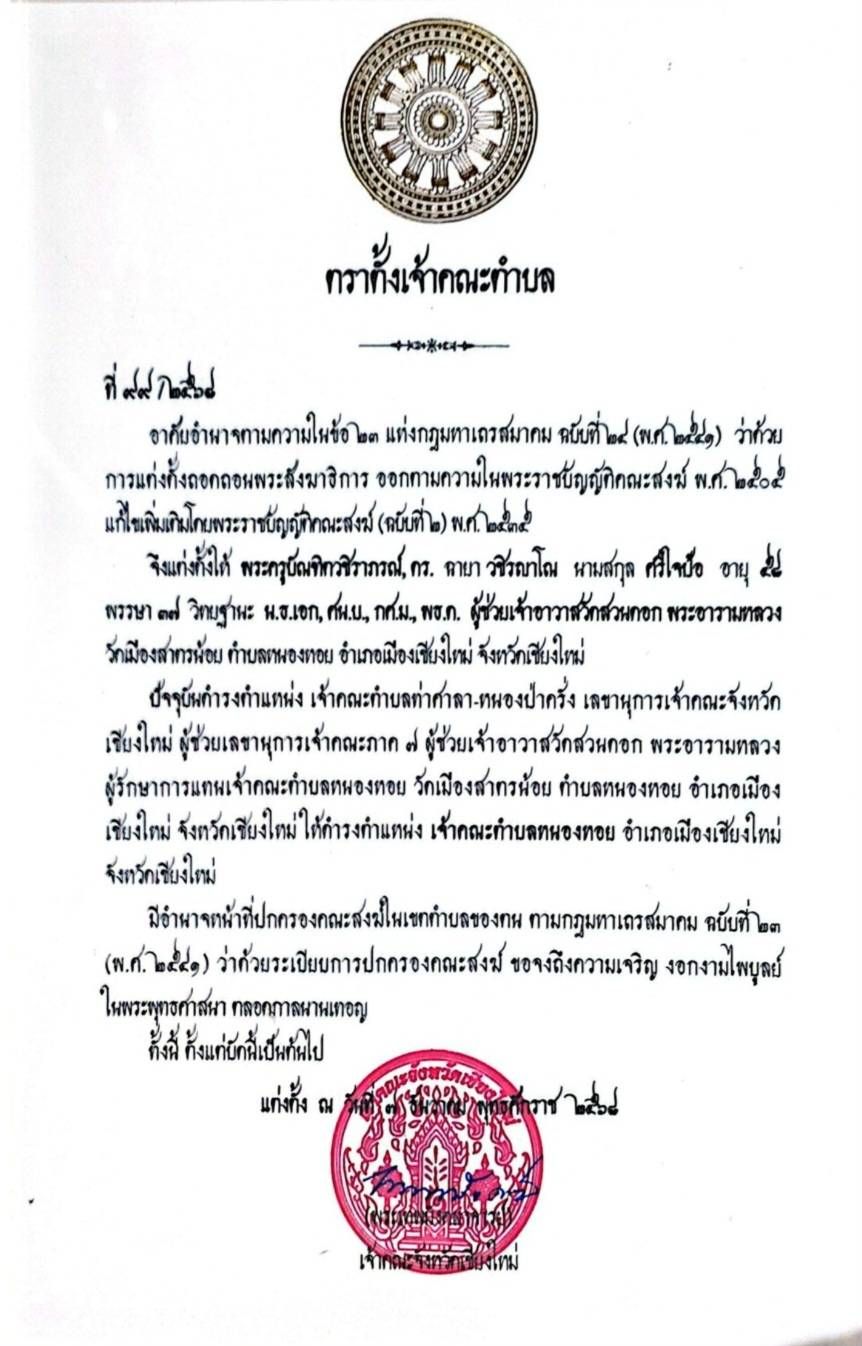 ทั้งนี้ คำสั่งแต่งตั้งมีผลตั้งแต่วันที่ 7 ธันวาคม พุทธศักราช 2568 โดย พระเทพมังคลาจารย์ เจ้าคณะจังหวัดเชียงใหม่ ผู้ลงนามแต่งตั้ง