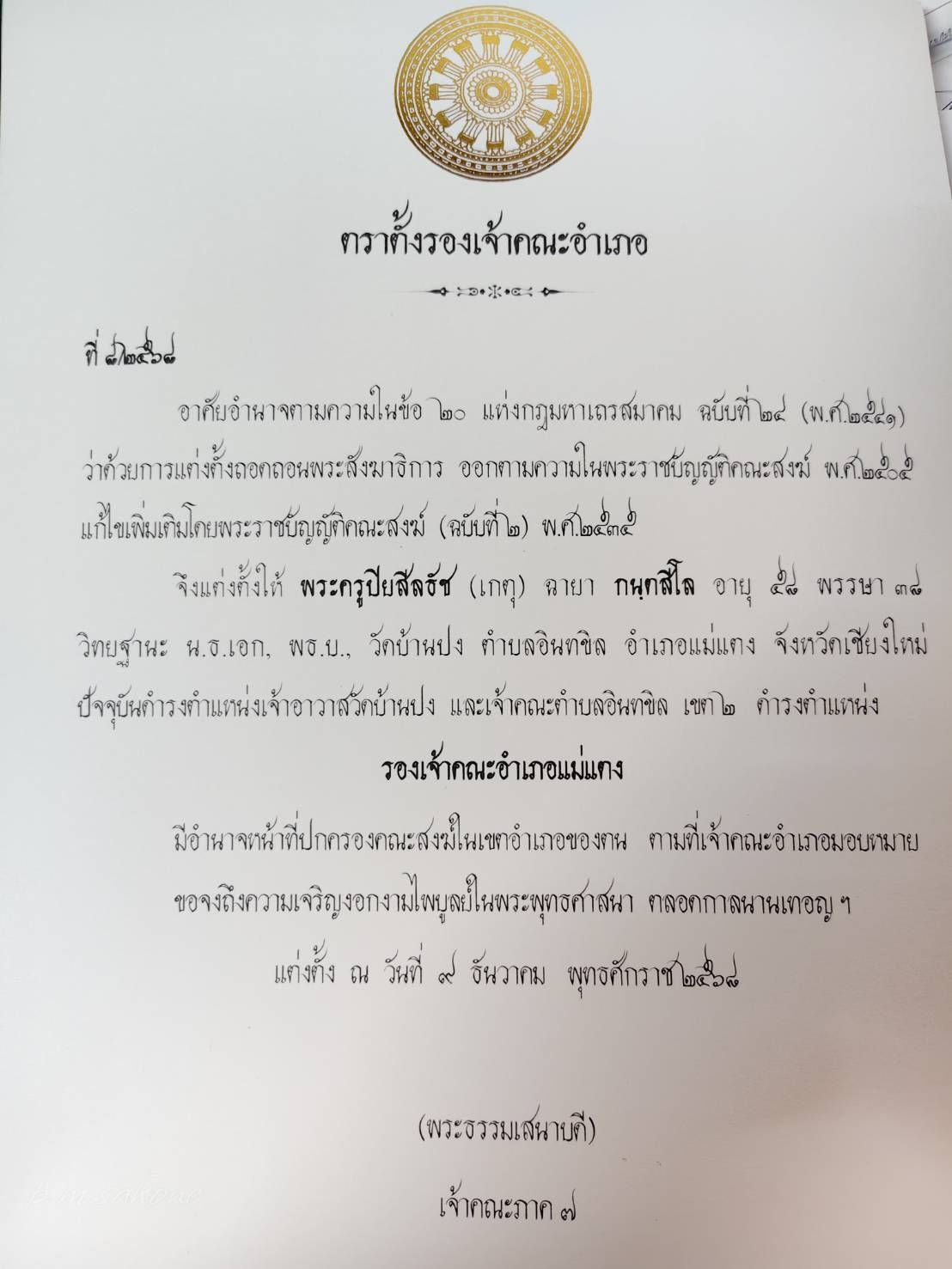 แต่งตั้ง “พระครูมนัสเขมาภิรม” ดำรงตำแหน่งเลขานุการเจ้าคณะอำเภอแม่แตง