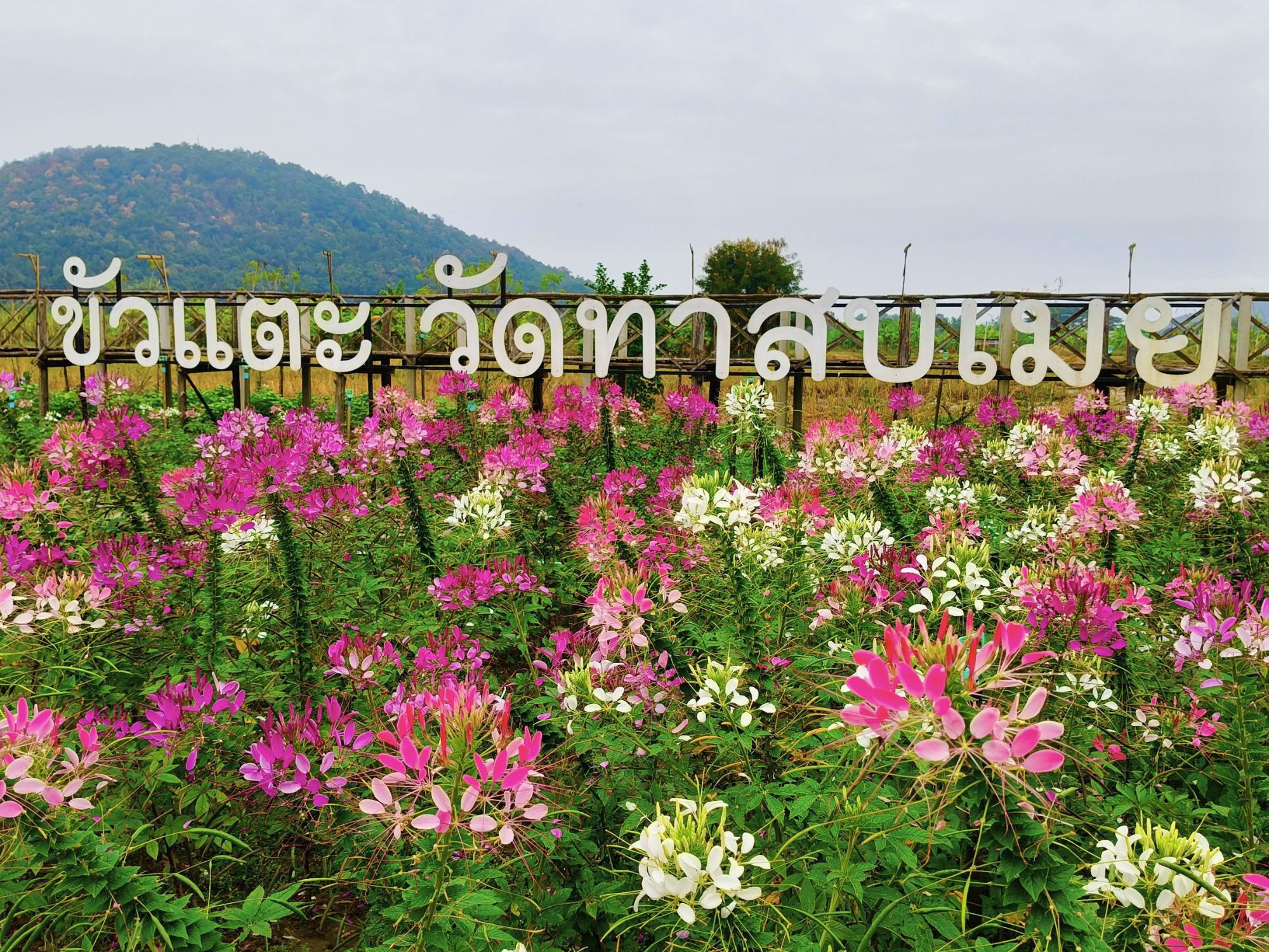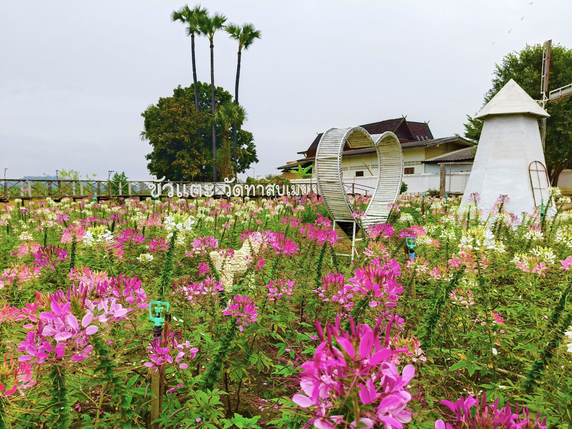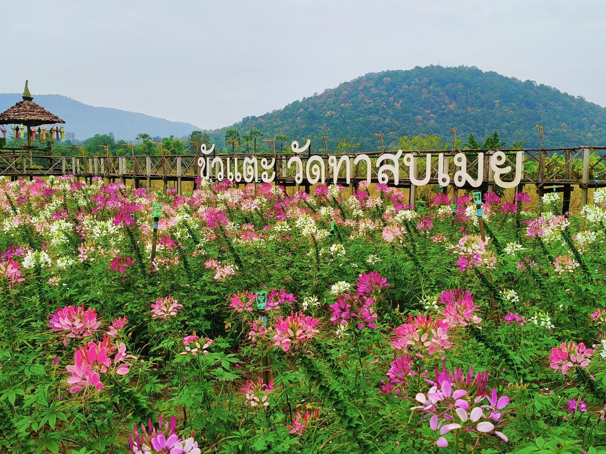“ขัวแตะวัดทาสบเมย” ลำพูน…สะพานบุญ 99 เมตร ท่ามกลางทุ่งดอกไม้บานสะพรั่ง!