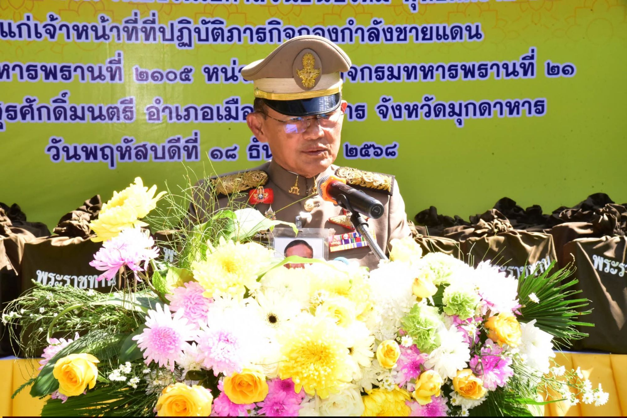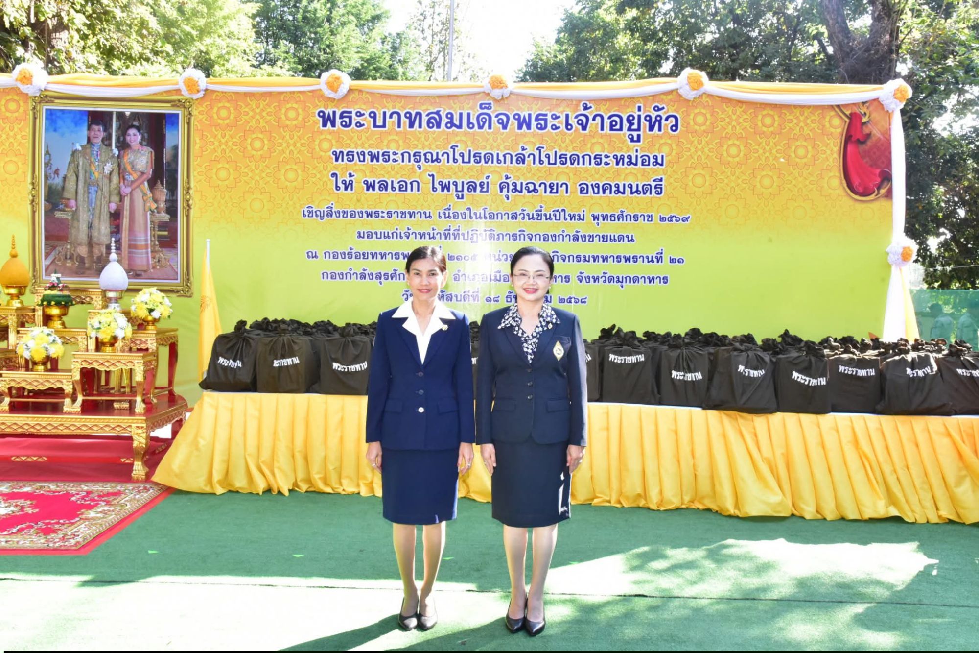 เมื่อวันที่ 18 ธันวาคม 2569 เวลา 09.30 น. พระบาทสมเด็จพระเจ้าอยู่หัว ทรงพระกรุณาโปรดเกล้าฯ ให้ พลเอก ไพบูลย์ คุ้มฉายา องคมนตรี และคณะ เชิญถุงพระราชทานไปมอบให้แก่เจ้าหน้าที่ที่ปฏิบัติภารกิจกองกำลังชายแดน จำนวน 200 ชุด ในพื้นที่จังหวัดหนองคาย จังหวัดมุกดาหาร จังหวัดศรีสะเกษ และจังหวัดบุรีรัมย์ เนื่องในโอกาสวันขึ้นปีใหม่ พุทธศักราช 2569 ในการนี้ นางอัญชลี กัลมาพิจิตร นายกเหล่ากาชาดจังหวัดมุกดาหาร มอบหมายให้นางวาสนา คงคาน้อย ผู้ช่วยนายกเหล่ากาชาดจังหวัดมุกดาหาร ร่วมเป็นเกียรติในพิธีรับมอบสิ่งของพระราชทาน เนื่องในโอกาสวันขึ้นปีใหม่ พุทธศักราช 2569 โดยมีนายวรญาณ บุญณราช ผู้ว่าราชการจังหวัดมุกดาหาร กล่าวต้อนรับ และผู้บัญชาการกองกำลังสุรศักดิ์มนตรี กล่าวสำนึกในพระมหากรุณาธิคุณ ณ ฐานปฏิบัติการกองร้อยทหารพรานที่ 2105 อำเภอเมืองมุกดาหาร จังหวัดมุกดาหาร