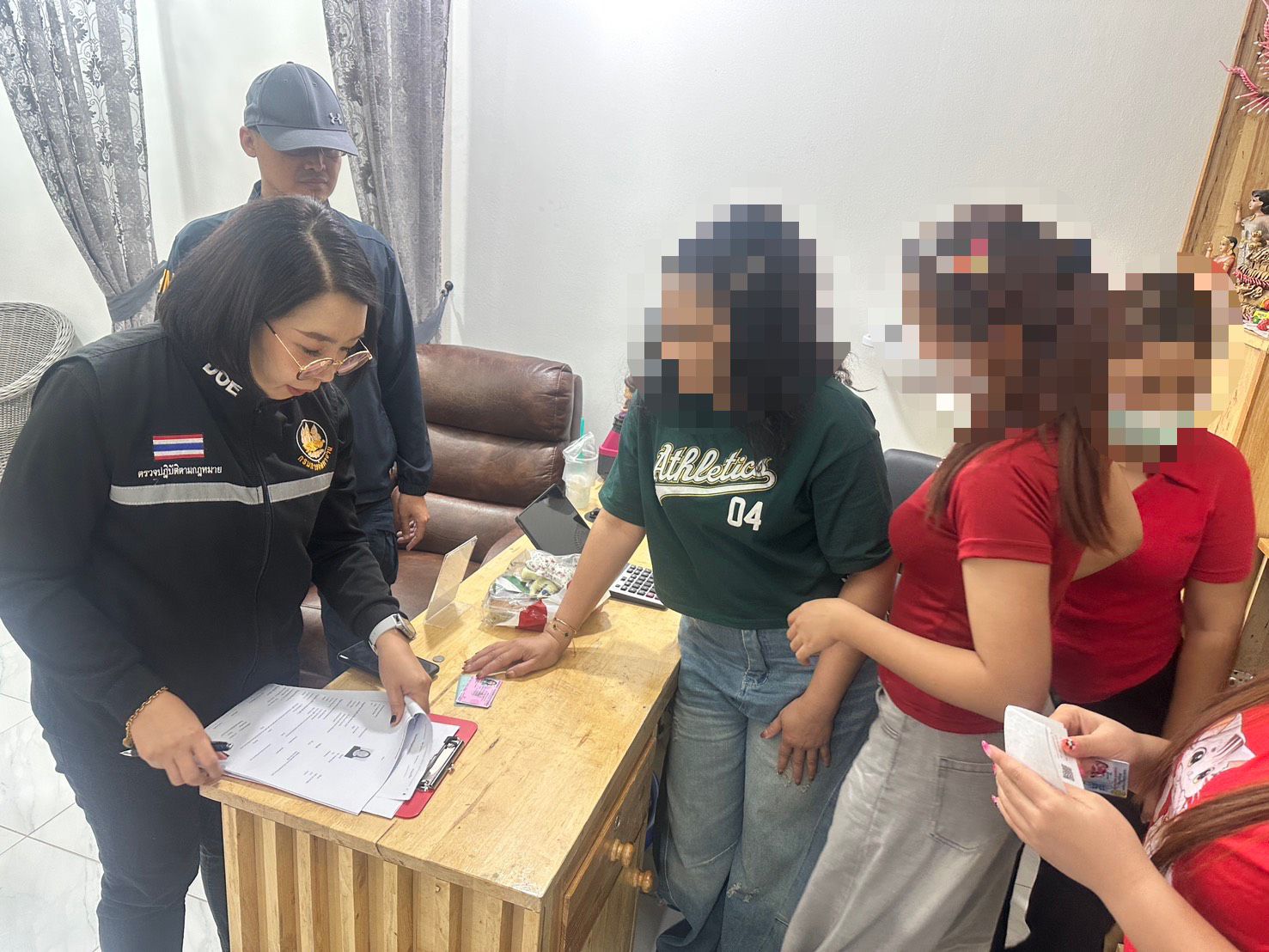 โดยผู้ต้องหาชาวเมียนมา 4 ราย ให้การรับว่า ตนมีใบอนุญาตทำงานกับนายจ้างคนไทย แต่ได้ลาออกจากงานเดิมและได้มาทำงานที่ร้านแห่งนี้เป็นระยะเวลาประมาณ 3 เดือน โดยได้รับค่าจ้างเดือนละ 12,000 บาท ส่วนชาวเมียนมาอีก 1 ราย ให้การว่าตนได้เข้ามาทำงานที่ร้านนี้เป็นเวลาประมาณ 2 เดือน โดยไม่