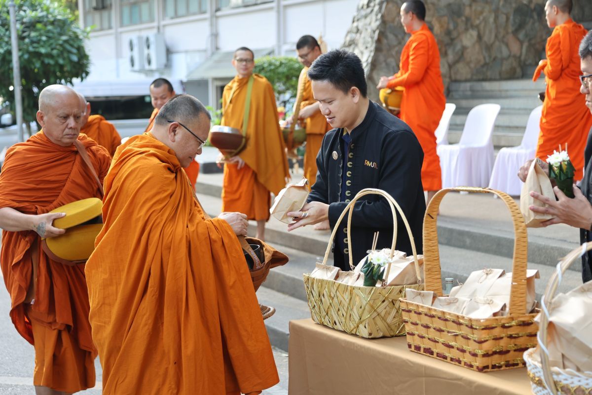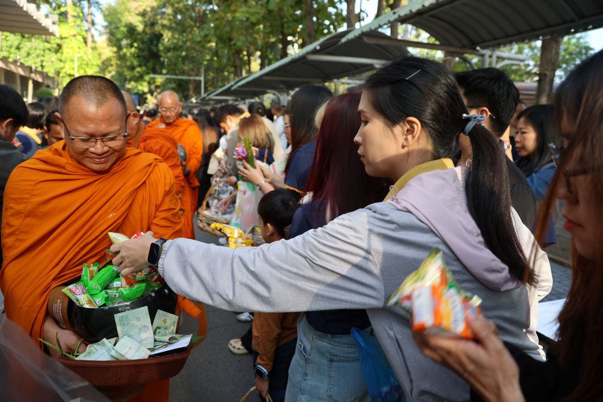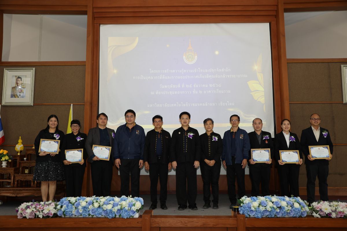 กิจกรรมทำบุญตักบาตรพระสงฆ์ โดยได้รับความเมตตาจาก พระครูสมุห์จตุทิพย์ ฉนฺทโก เจ้าคณะตำบลช้างเผือก – ป่าตัน เจ้าอาวาสวัดช่างเคี่ยน พร้อมด้วยพระสงฆ์ จำนวน 9 จากนั้นได้เป็นประธานมอบ มอบรางวัล “ผู้มีจรรยาบรรณดีเด่น” ภายใต้โครงการต้นกล้าจรรยาบรรณ ประจำปี พ.ศ. 2568 แก่คณาจารย์และบุคลากรผู้ผ่านการคัดเลือกจำนวน 61 ราย ณ ห้องประชุมทองกวาว มทร.ล้านนา พร้อมทั้งร่วมรับฟัง การบรรยายเรื่อง “การสร้างความรู้ความเข้าใจและปลุกจิตสำนึกการเป็นบุคลากรที่ดี” โดยวิทยากรจาก สำนักงาน ป.ป.ช. ภาค 5 ณ ห้องประชุมทองกวาว อาคารเรียนรวม มทร.ล้านนา