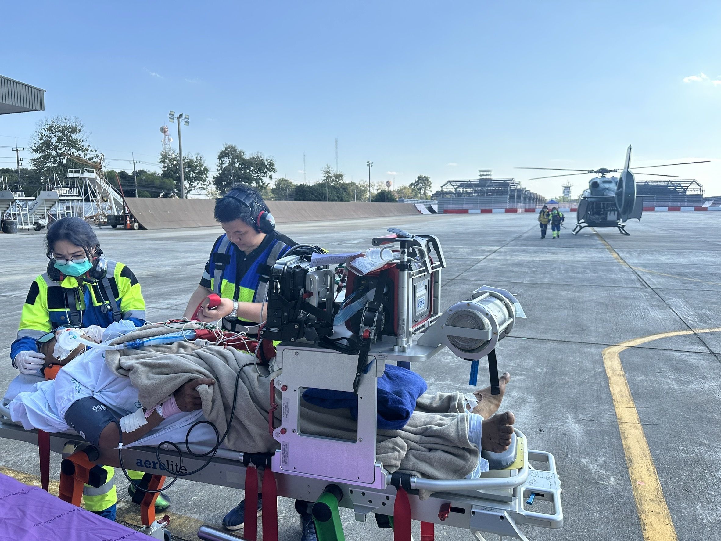 ใช้เวลาบิน ประมาณ 40 นาที (ถ้าลำเลียงทางรถยนต์จะใช้เวลาประมาณ 4 – 5 ชั่วโมง) ผู้ป่วยถึงมือแพทย์อย่างปลอดภัย.