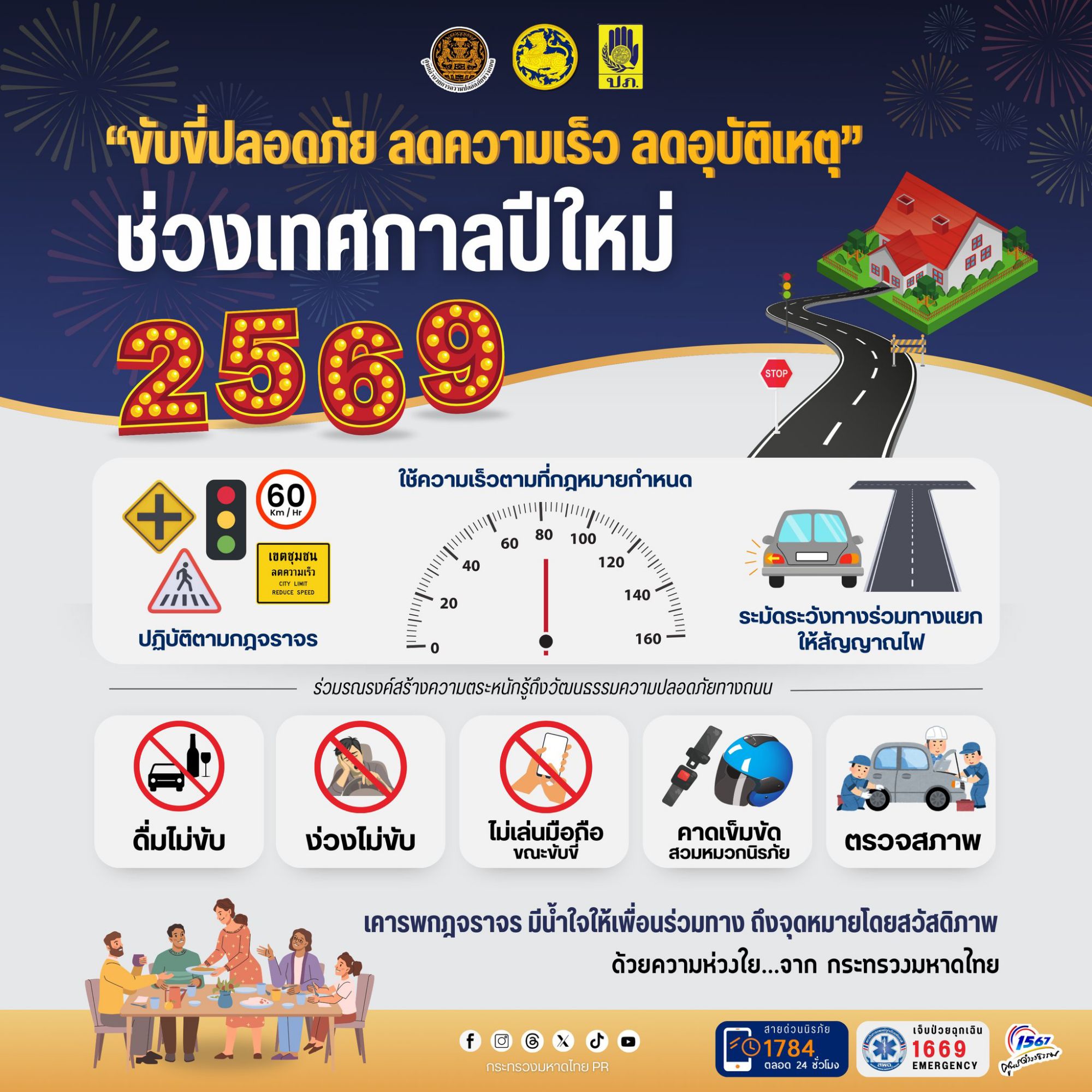 ข้อมูลจาก กรมควบคุมโรค กระทรวงสาธารณสุข พบว่า สถิติอุบัติเหตุทางถนนในช่วง 7 วันอันตราย ช่วงเทศกาลปีใหม่ 2568 (27 ธันวาคม 2567 – 5 มกราคม 2568) ประเทศไทย มีจำนวนผู้บาดเจ็บกว่า 23,200 ราย และผู้เสียชีวิต 436 ราย สาเหตุการเกิดอุบัติเหตุ ร้อยละ 39 ขับรถเร็ว, ร้อยละ 21 ตัดหน้าฯ และ ร้อยละ 20 ดื่มแล้วขับ ผู้บาดเจ็บและเสียชีวิตส่วนใหญ่ เกิดจาก ร้อยละ 82 รถจักรยานยนต์ พฤติกรรมเสี่ยงที่ทำให้บาดเจ็บรุนแรง มากที่สุดคือ ไม่สวมหมวกกันน๊อค ร้อยละ 71, ไม่คามเข็มขัดนิรภัย ร้อยละ 43 และดื่มแล้วขับ ร้อยละ 33